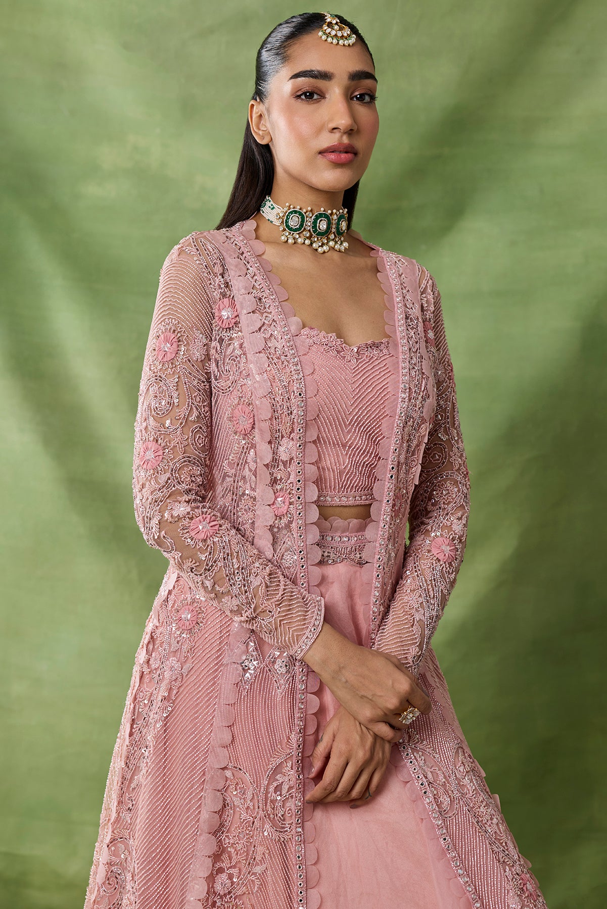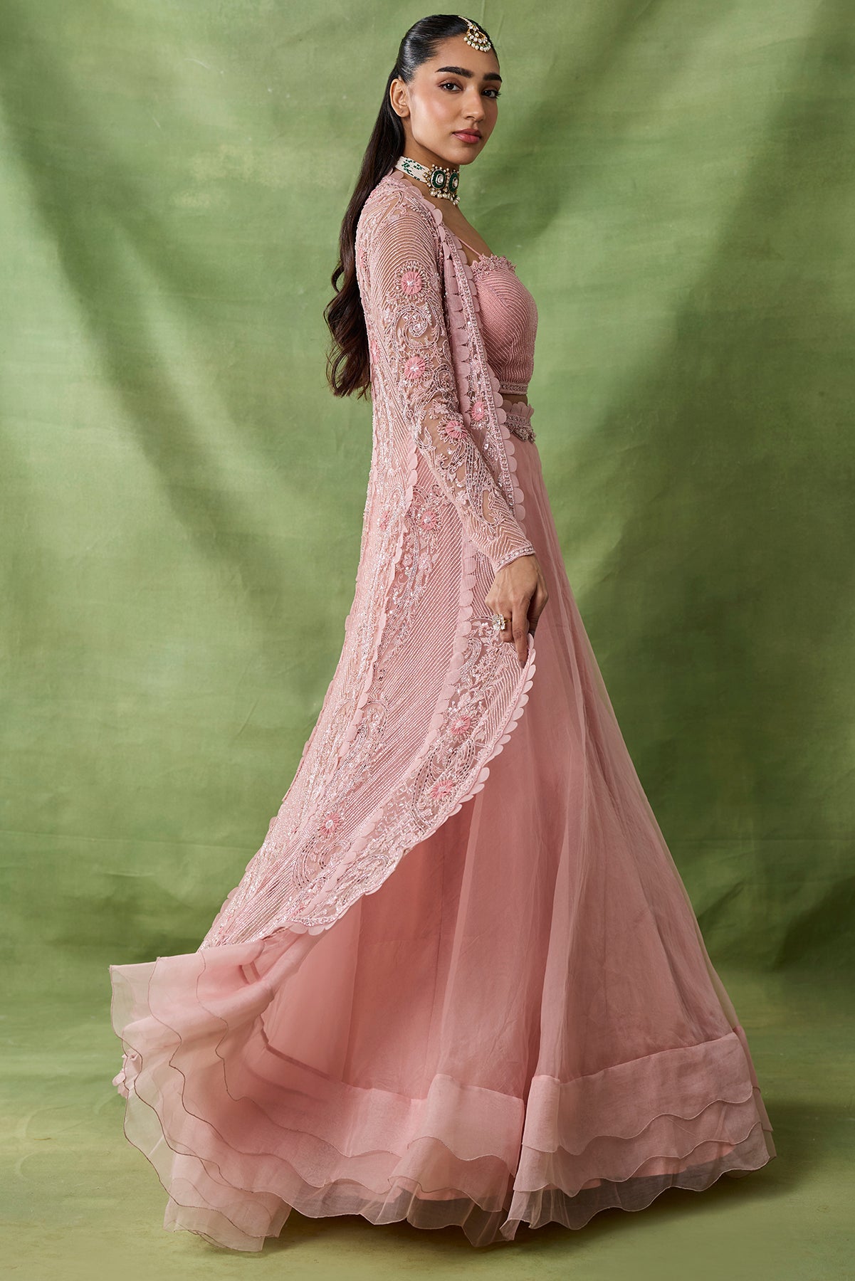Product Description: featuring a pink fully embroidered bustier and flared skirt with cape with heavy embroidary.Category: AWIGNA SIGNATURE STYLESFabric: organza netNumber of Pcs.: 3Designer Code: ASS41Color: PINKWash Care: DRY CLEAN ONLY