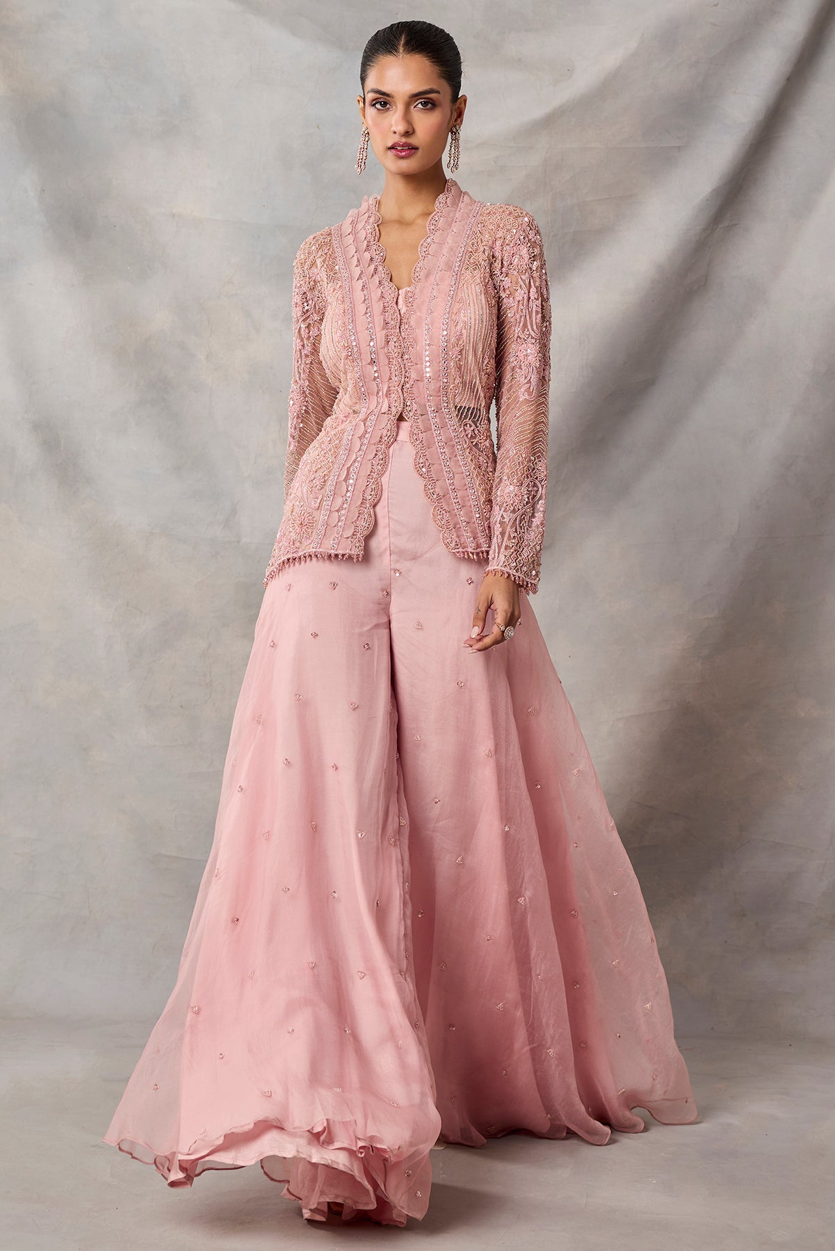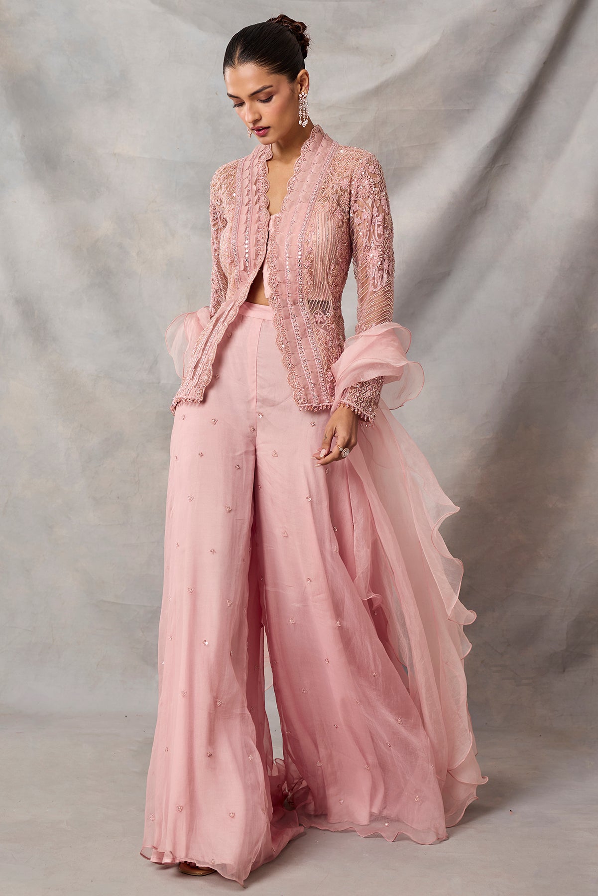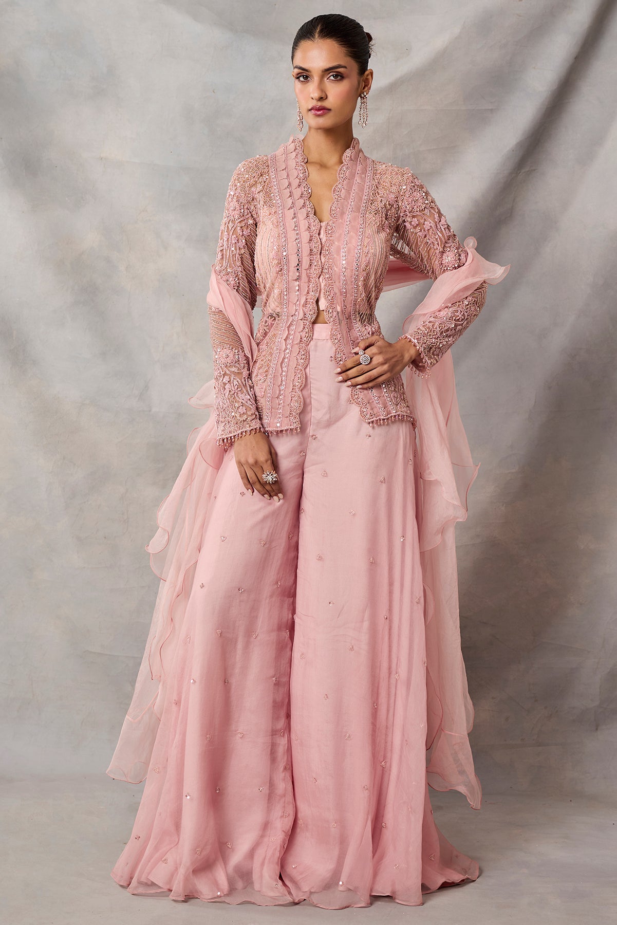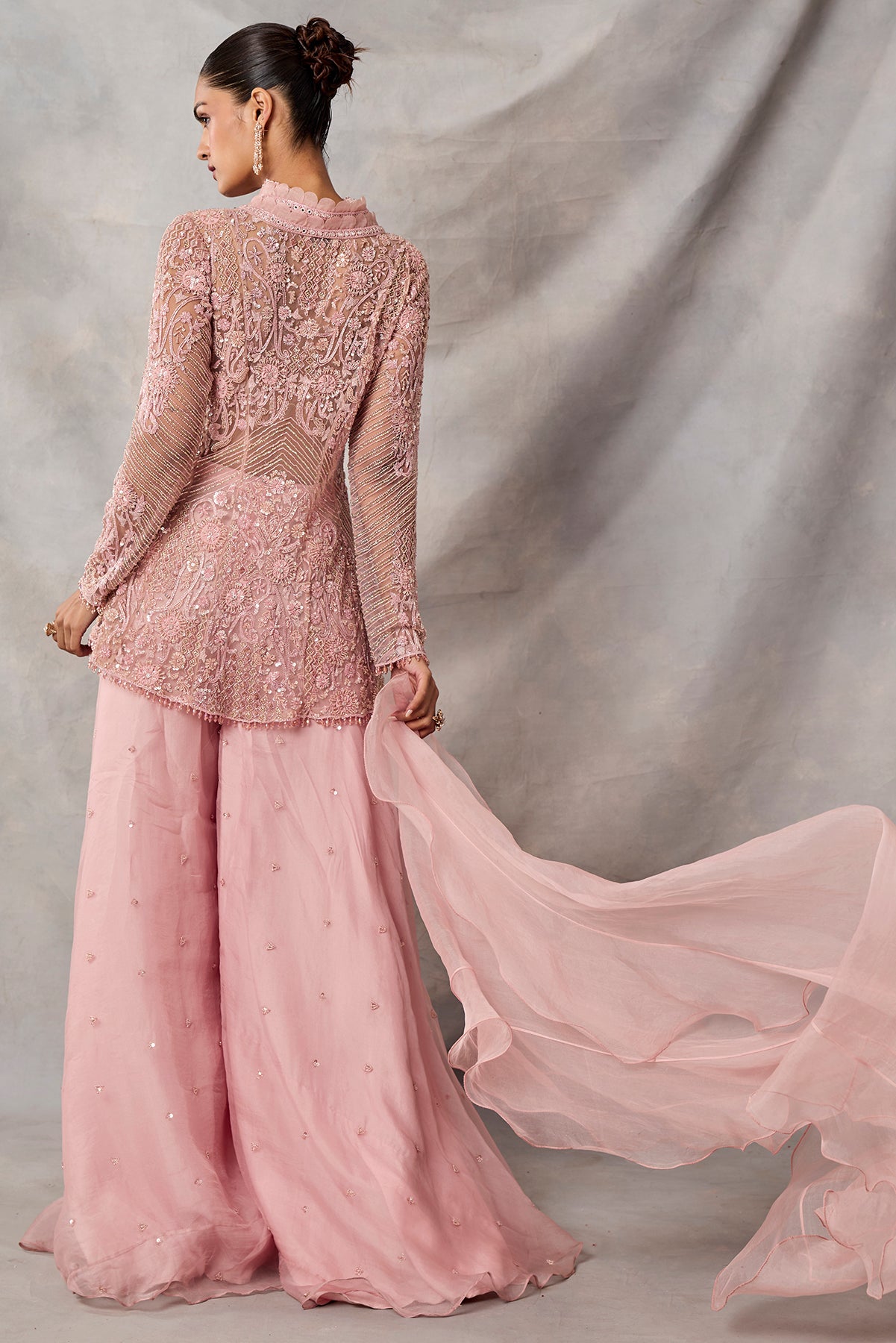 Product Description: featuring pink color embroidered peplum top with boota embroidered sharara and frill duppata.Category: AWIGNA SIGNATURE STYLESFabric: organza,netNumber of Pcs.: 3Designer Code: ASS68Color: PINKWash Care: DRY CLEAN ONLY
