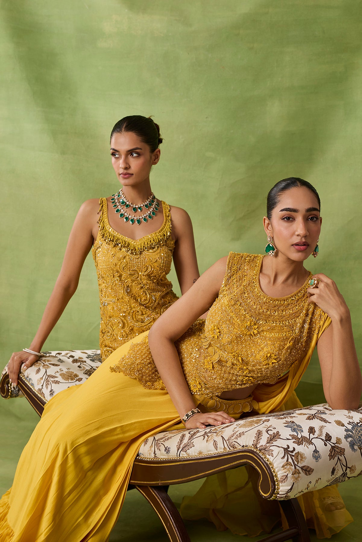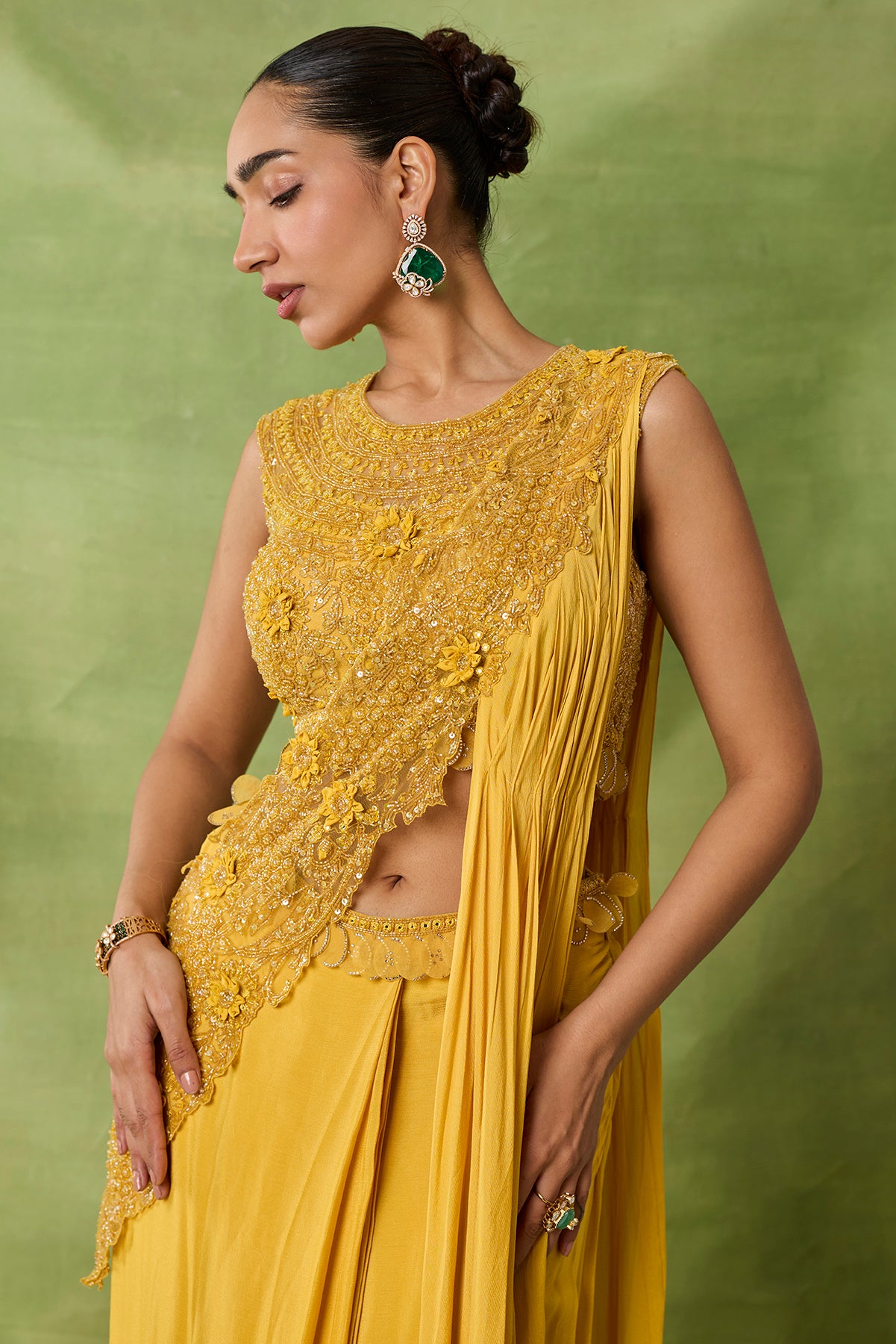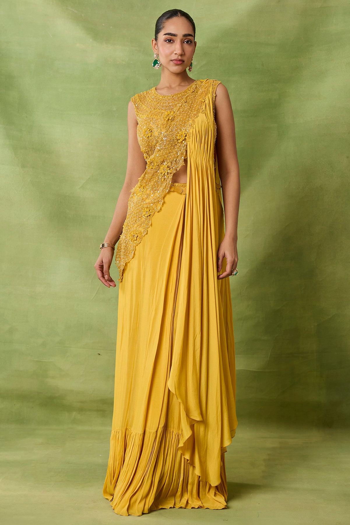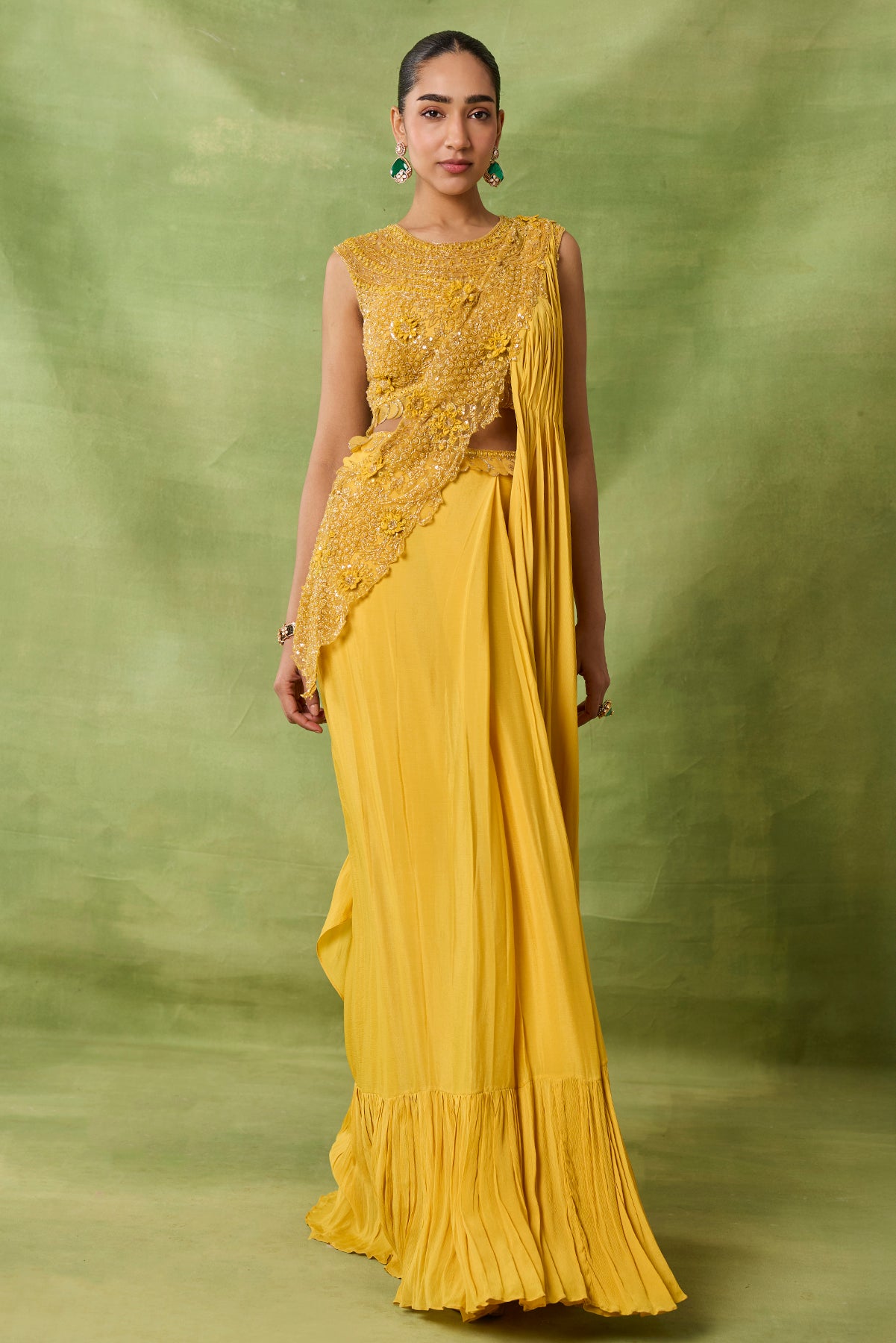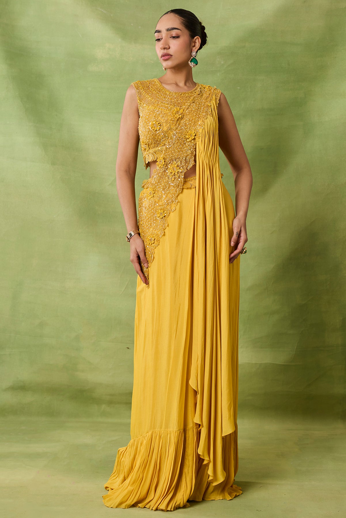 Product Description: featuring draped saree with fully embroidered blouse and front pallu.Category: AWIGNA SIGNATURE STYLESFabric: chiffon,netNumber of Pcs.: 2Designer Code: ASS50Color: YELLOWWash Care: DRY CLEAN ONLY