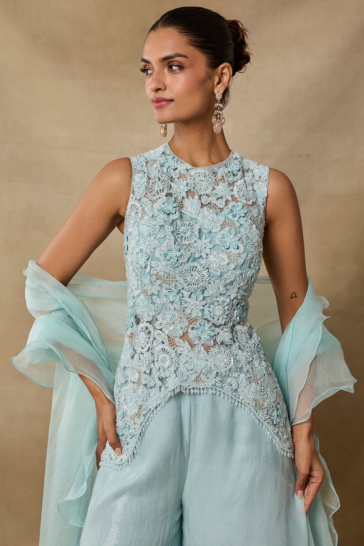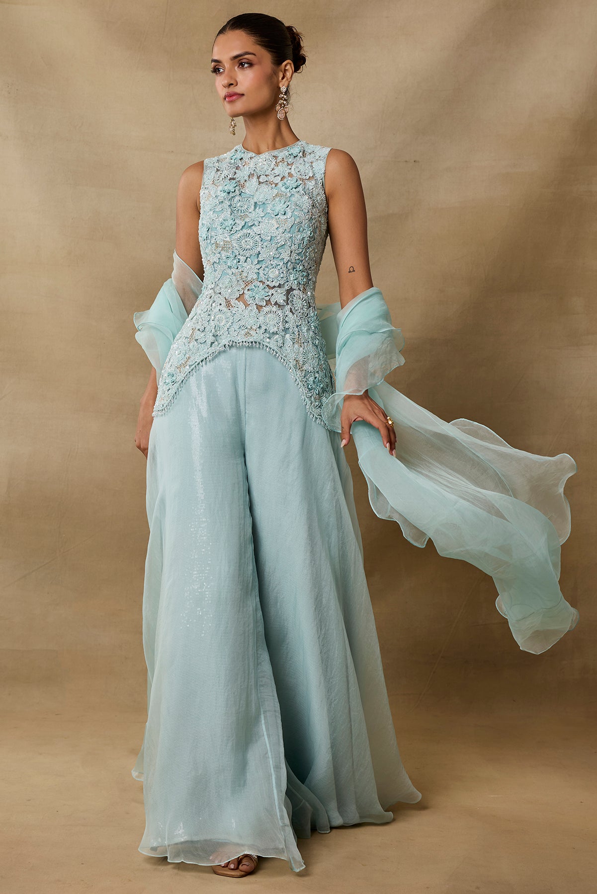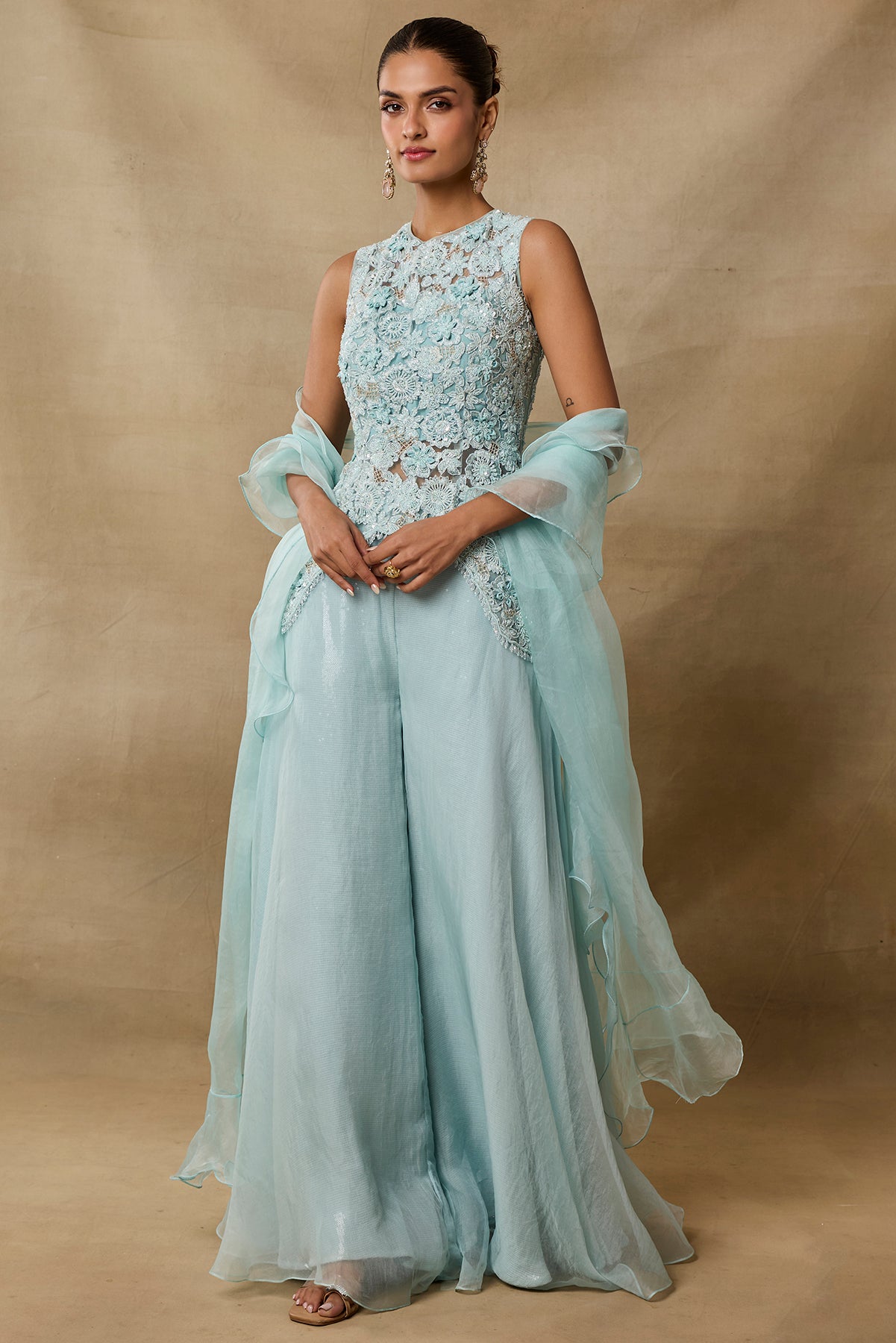 Product Description: featuring aqua color sharara set withfully embroidered assymetrical peplum top Category: AWIGNA SIGNATURE STYLESFabric: organza,netNumber of Pcs.: 3Designer Code: ASS43Color: AQUAWash Care: DRY CLEAN ONLY