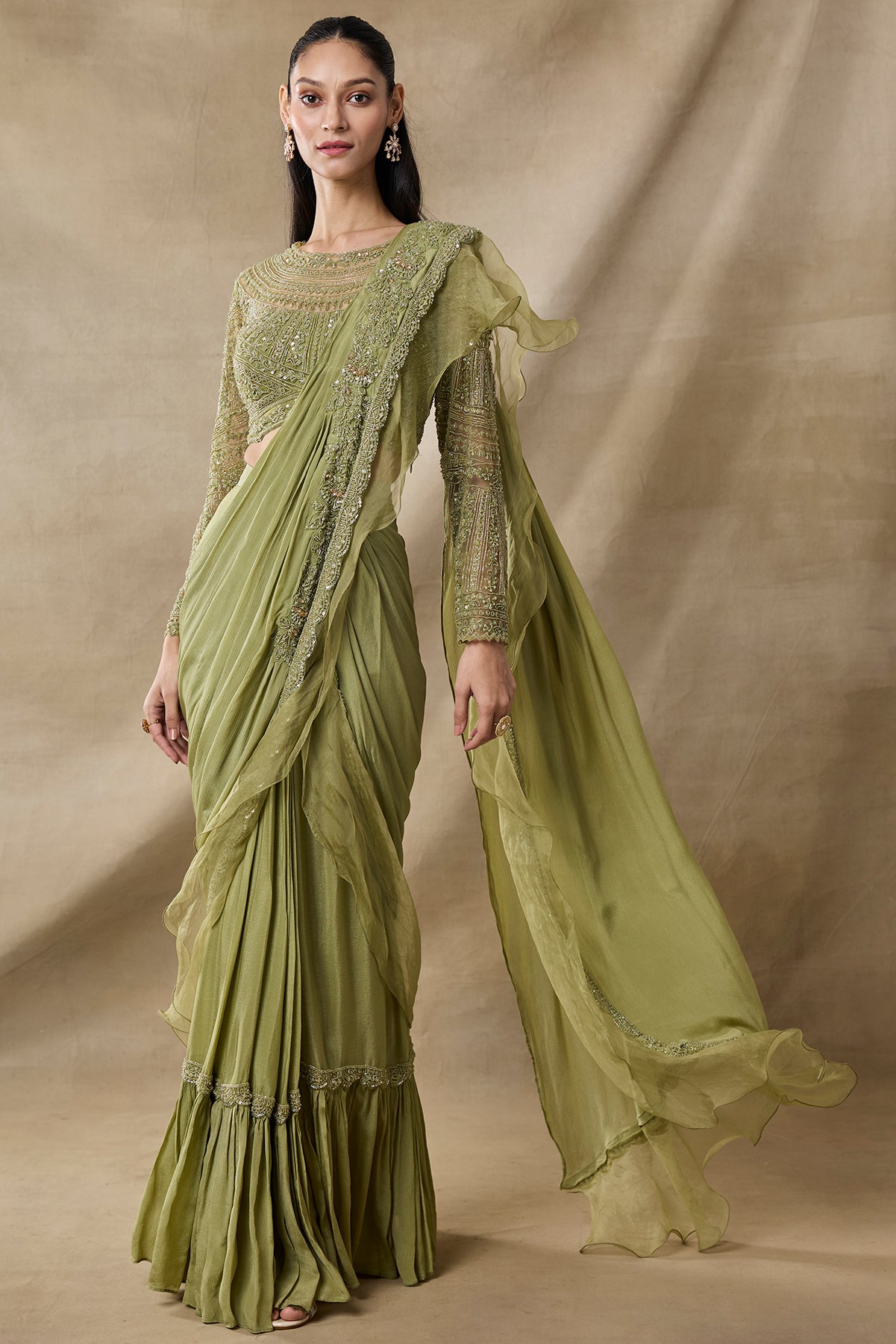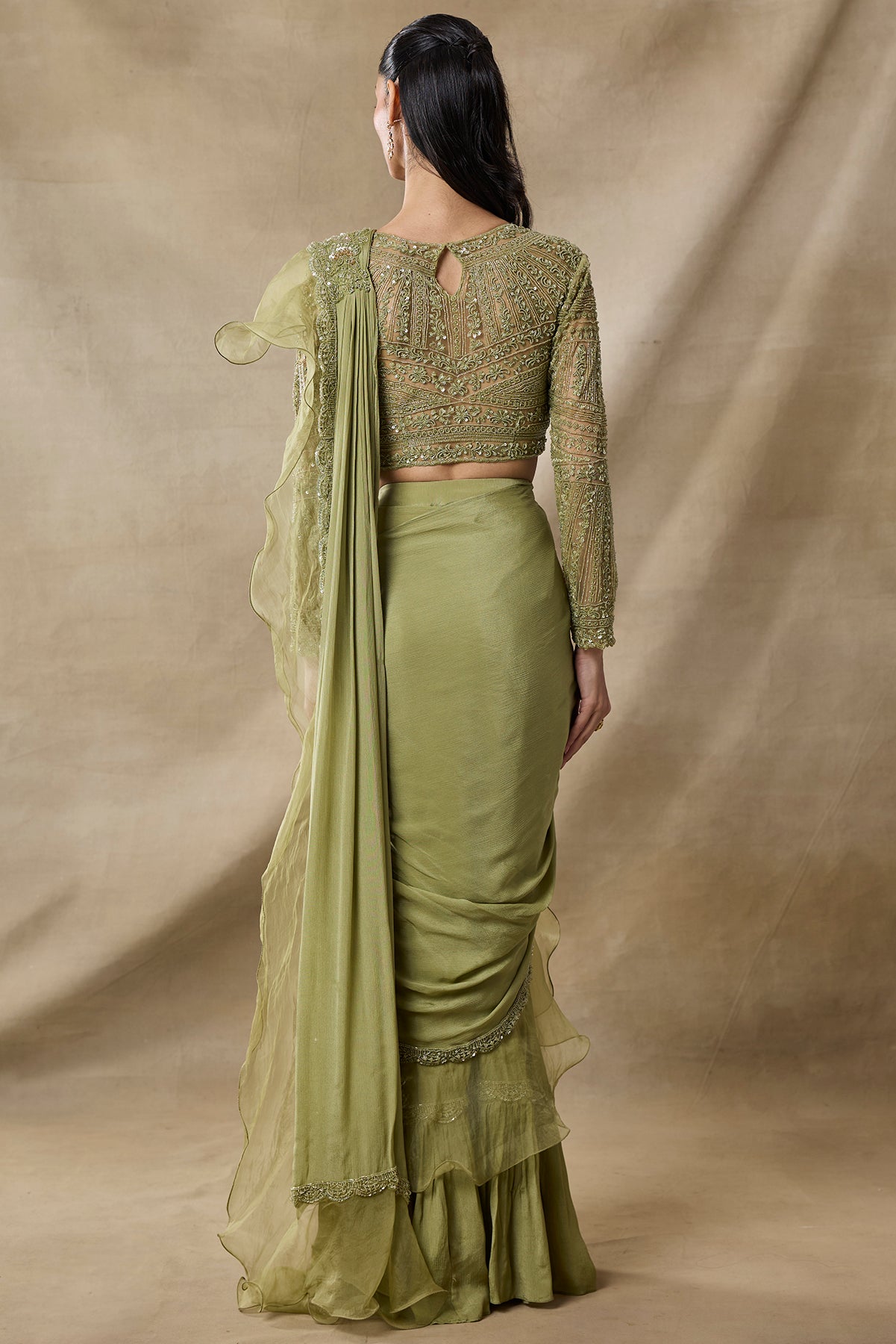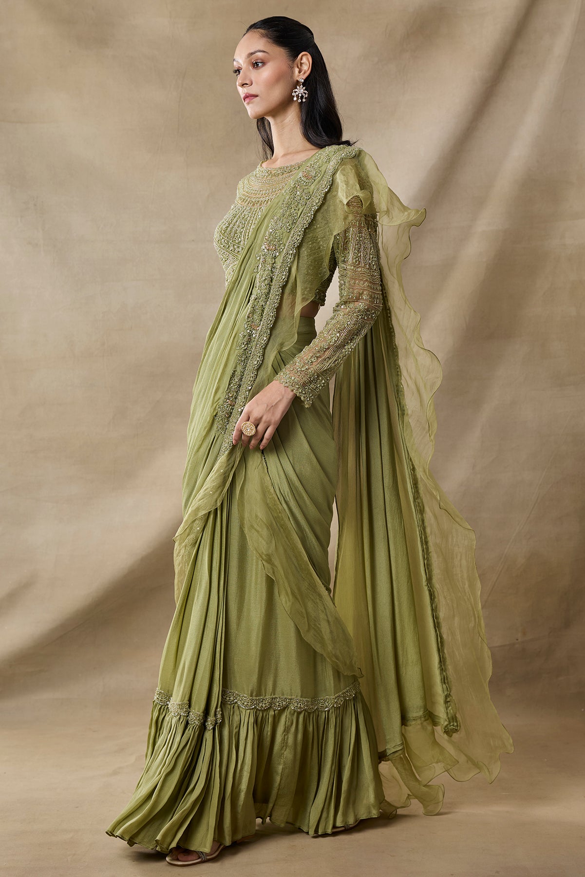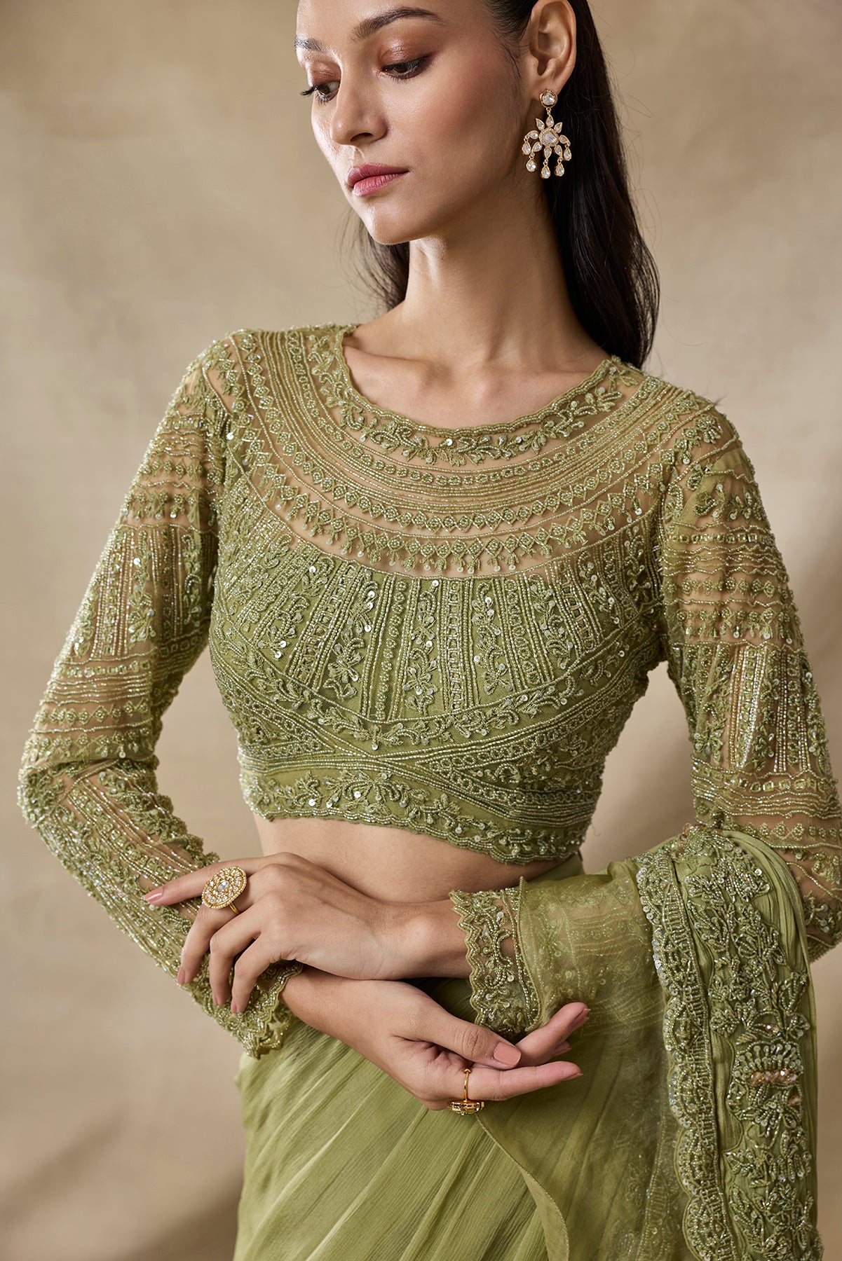 Product Description: featuring a sage green pre draped saree with heavy embellished border and embroidared full sleeves blouse
