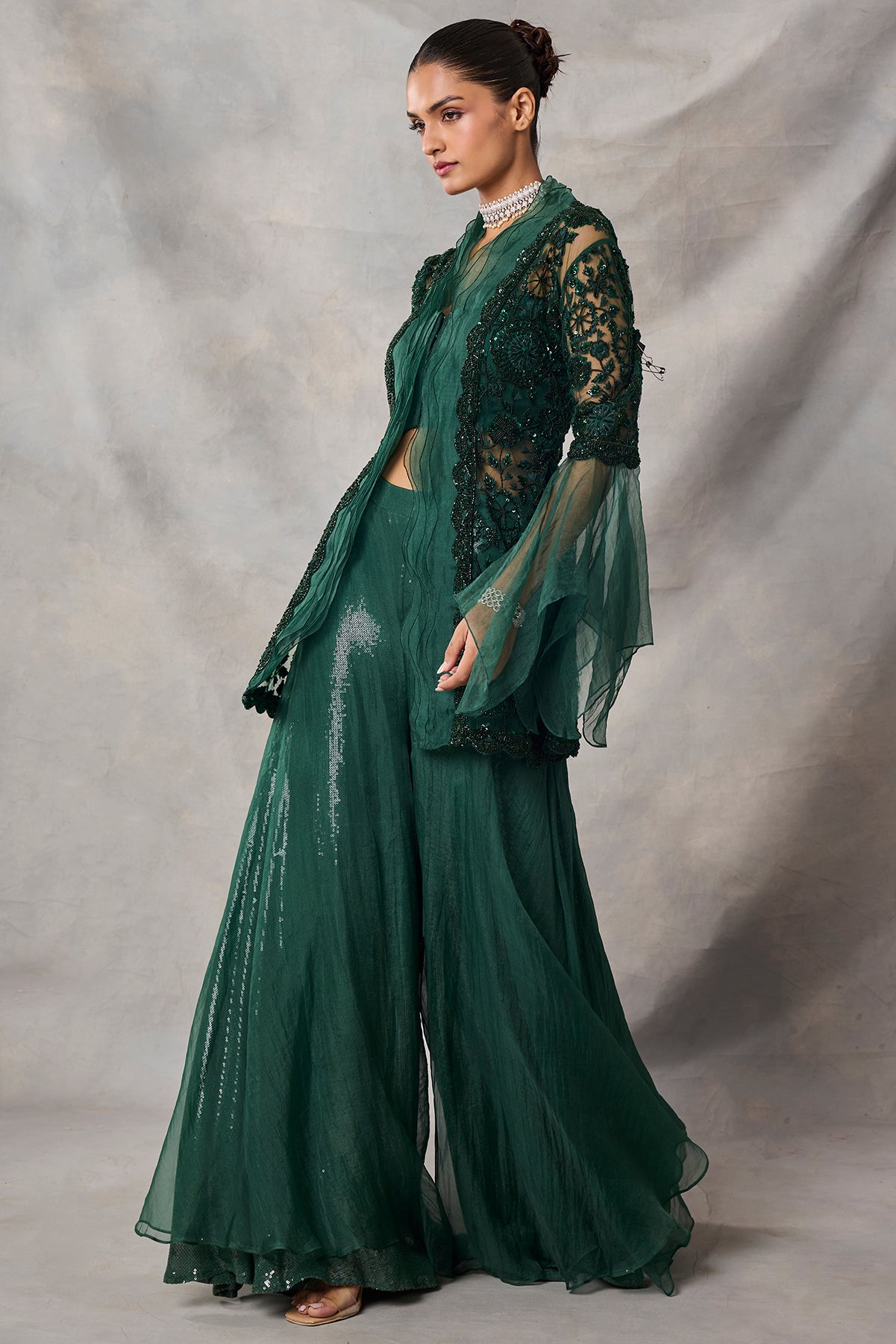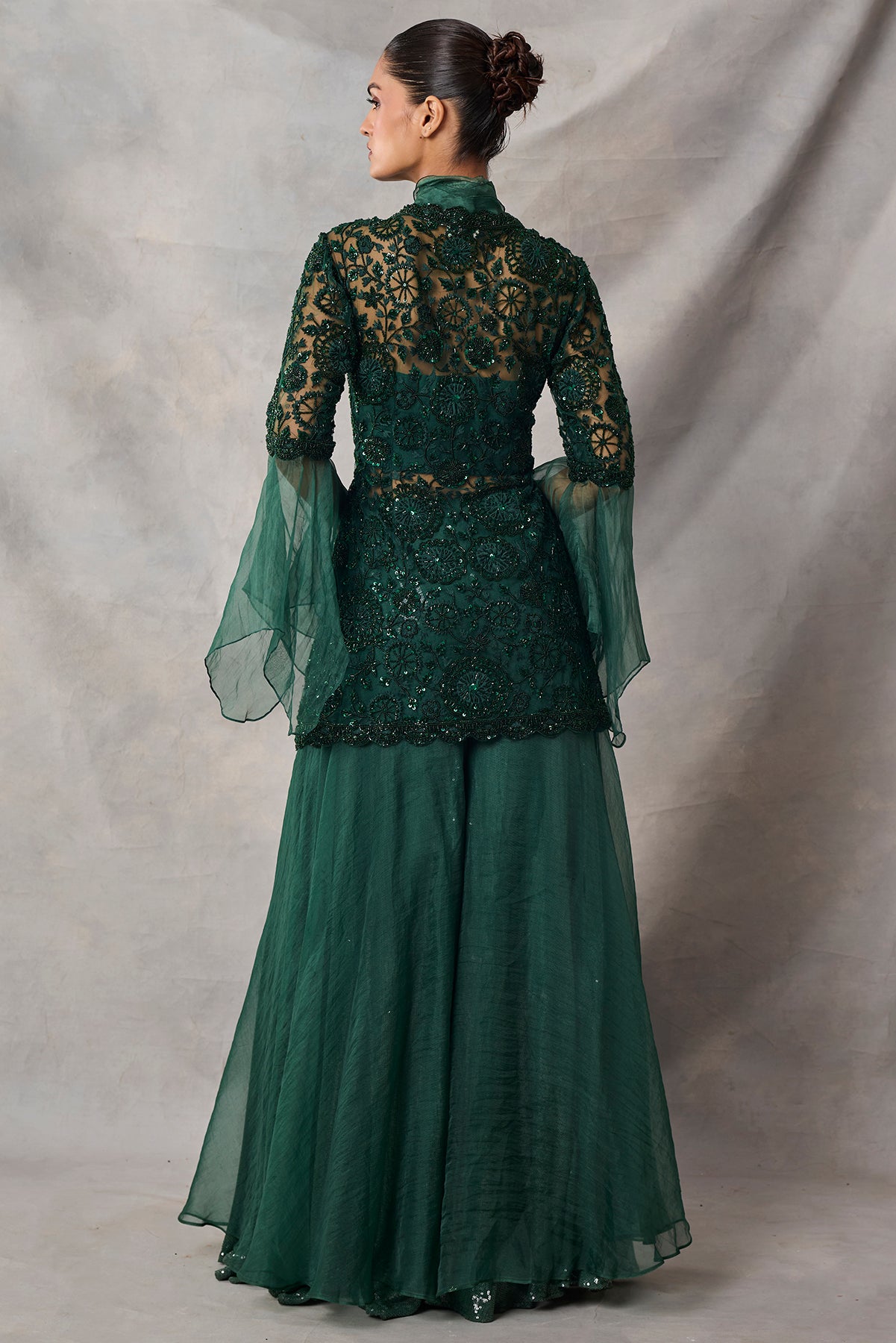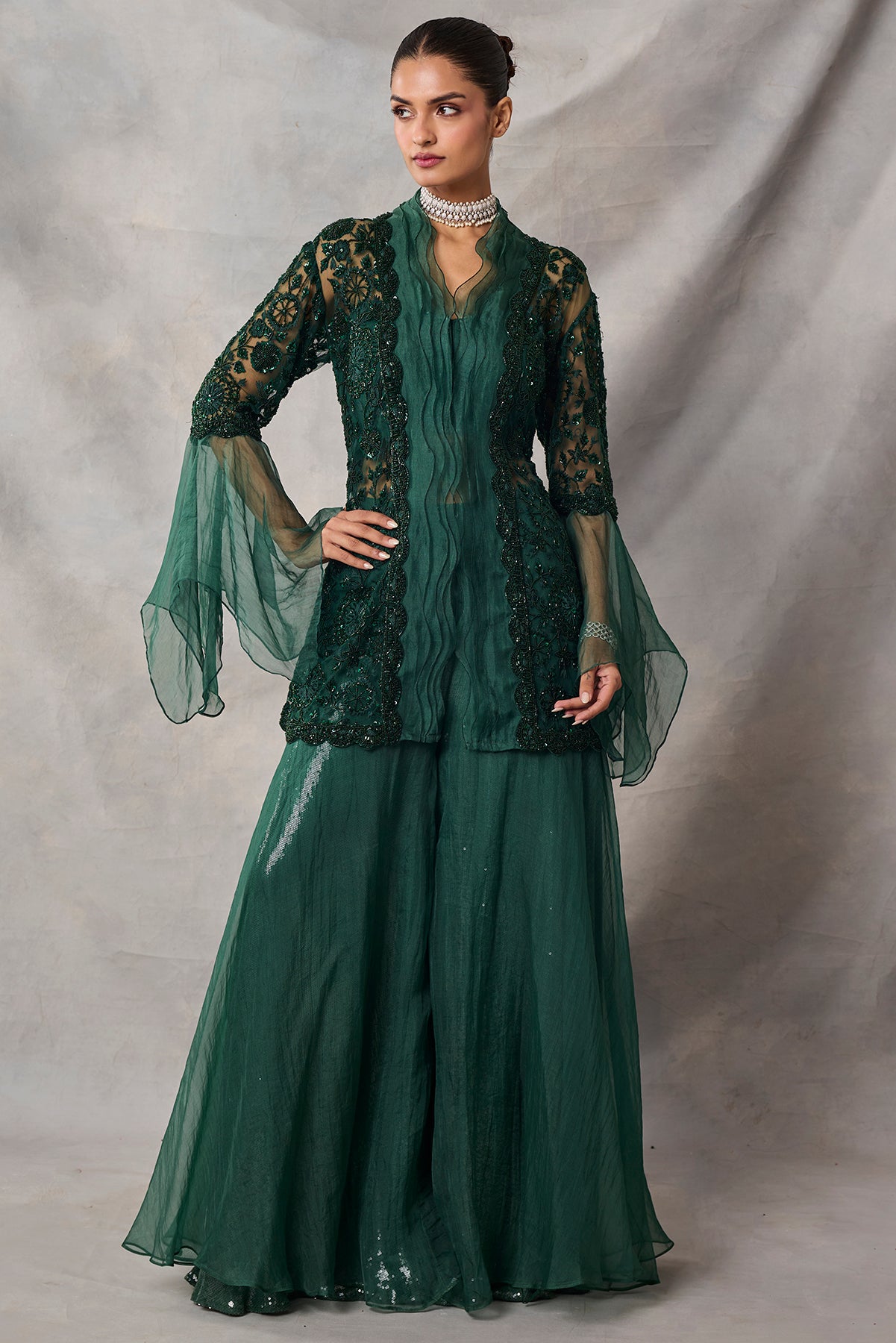 Product Description: The set features fully embroidered shirt with sequins and dori. The shirt also features decorative organza sleeves and scallop detailing in the front paired with sharara.