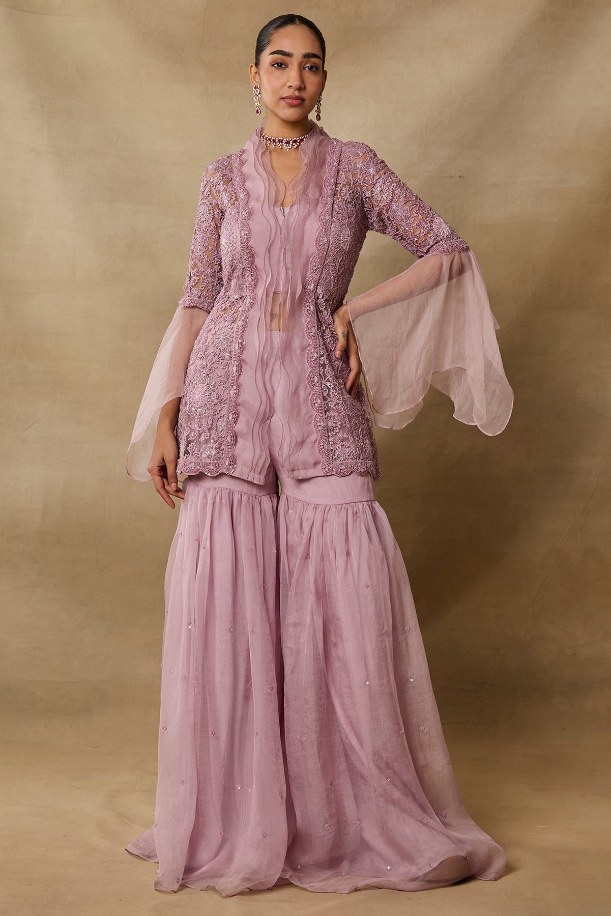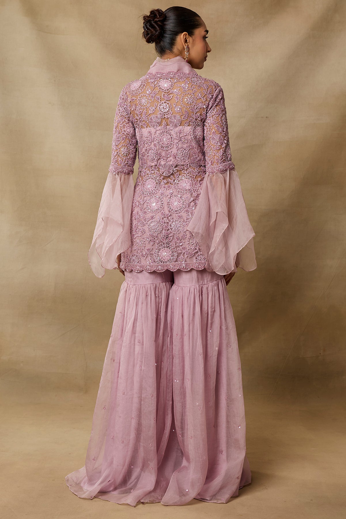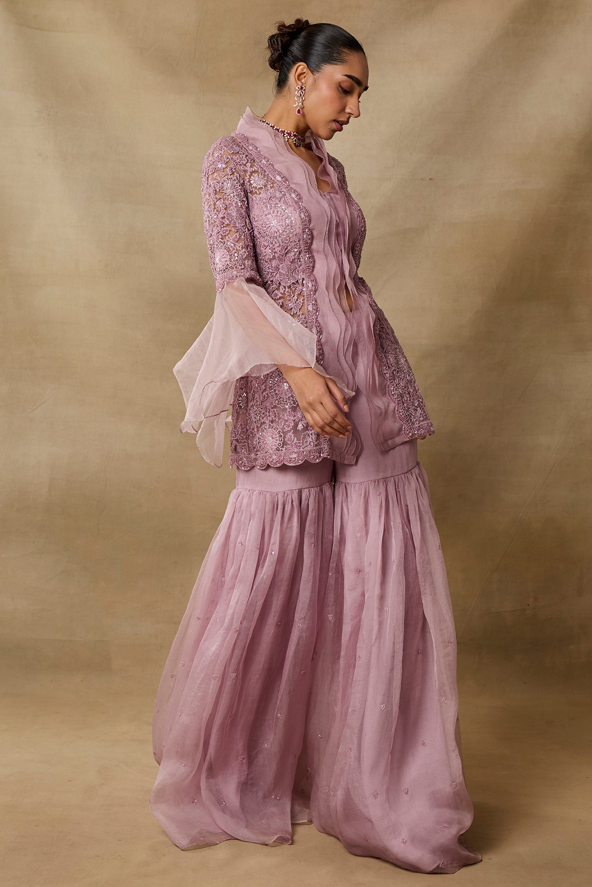 Product Description: Featuring pink color garara with peplum top with enhanced frills collar Category: AWIGNA SIGNATURE STYLESFabric: organza,netNumber of Pcs.: 3Designer Code: ASS42Color: PINKWash Care: DRY CLEAN ONLY