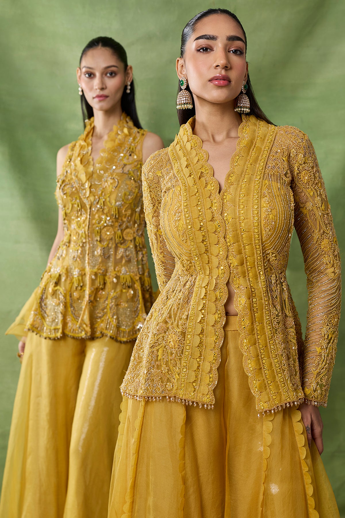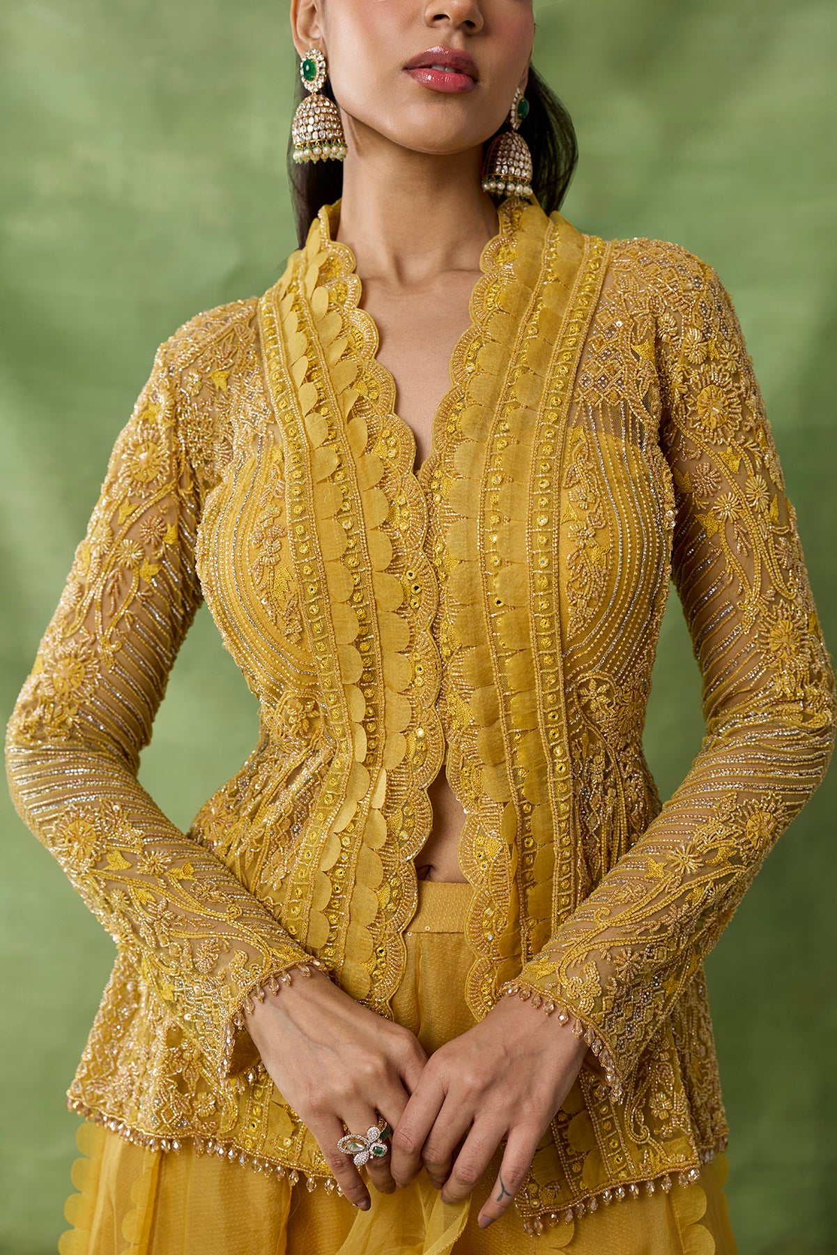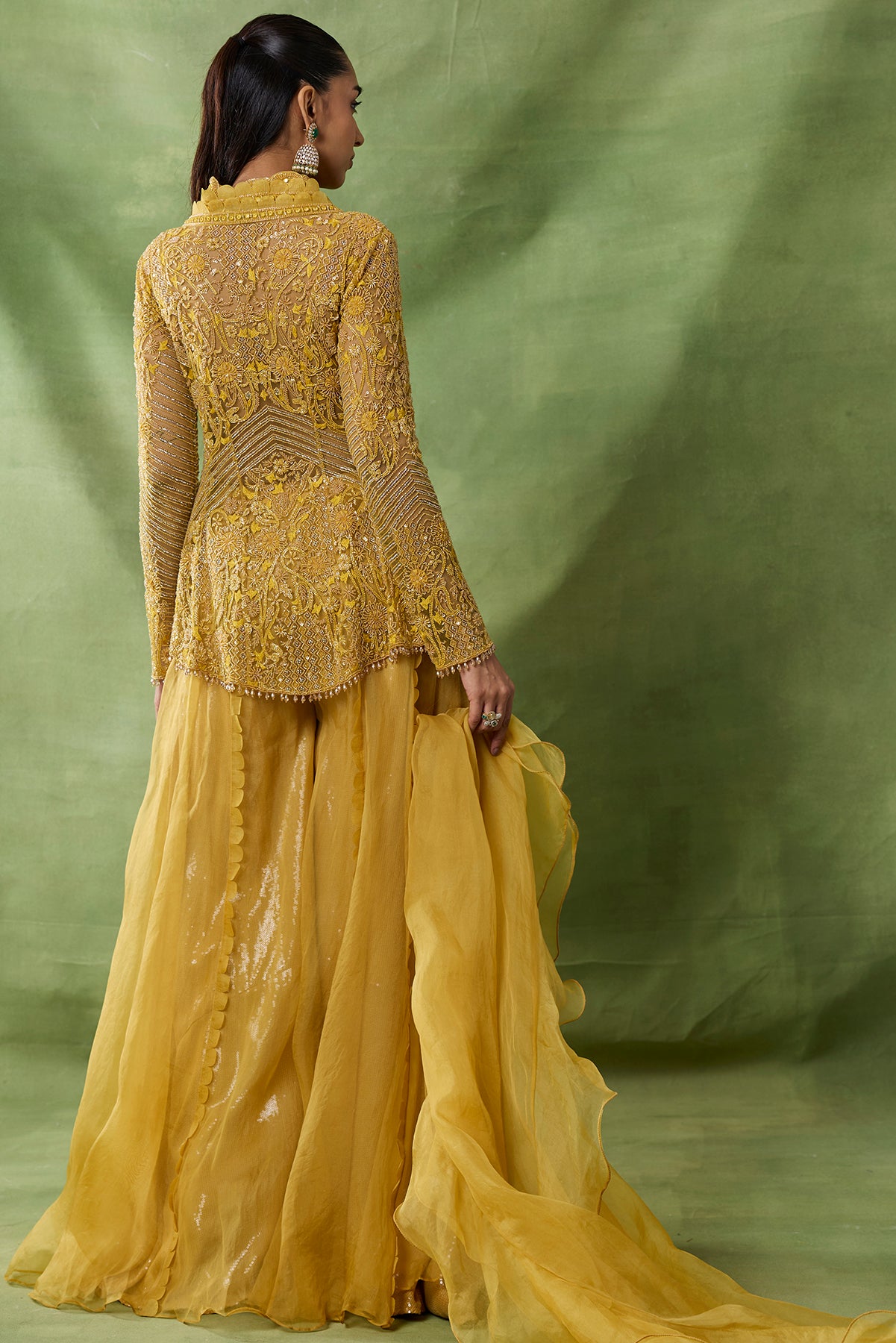 Product Description: featuring a yellow color fully embroidered peplum style jacket and sharara pants with lasor cutt and organza ruffels duppatta.