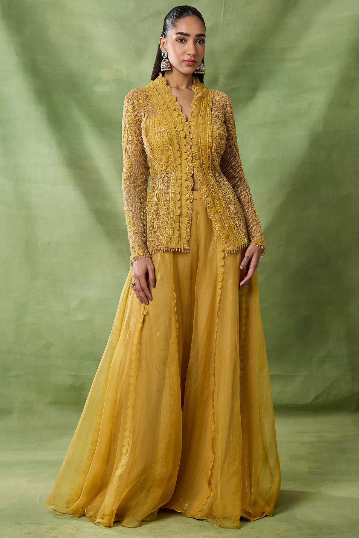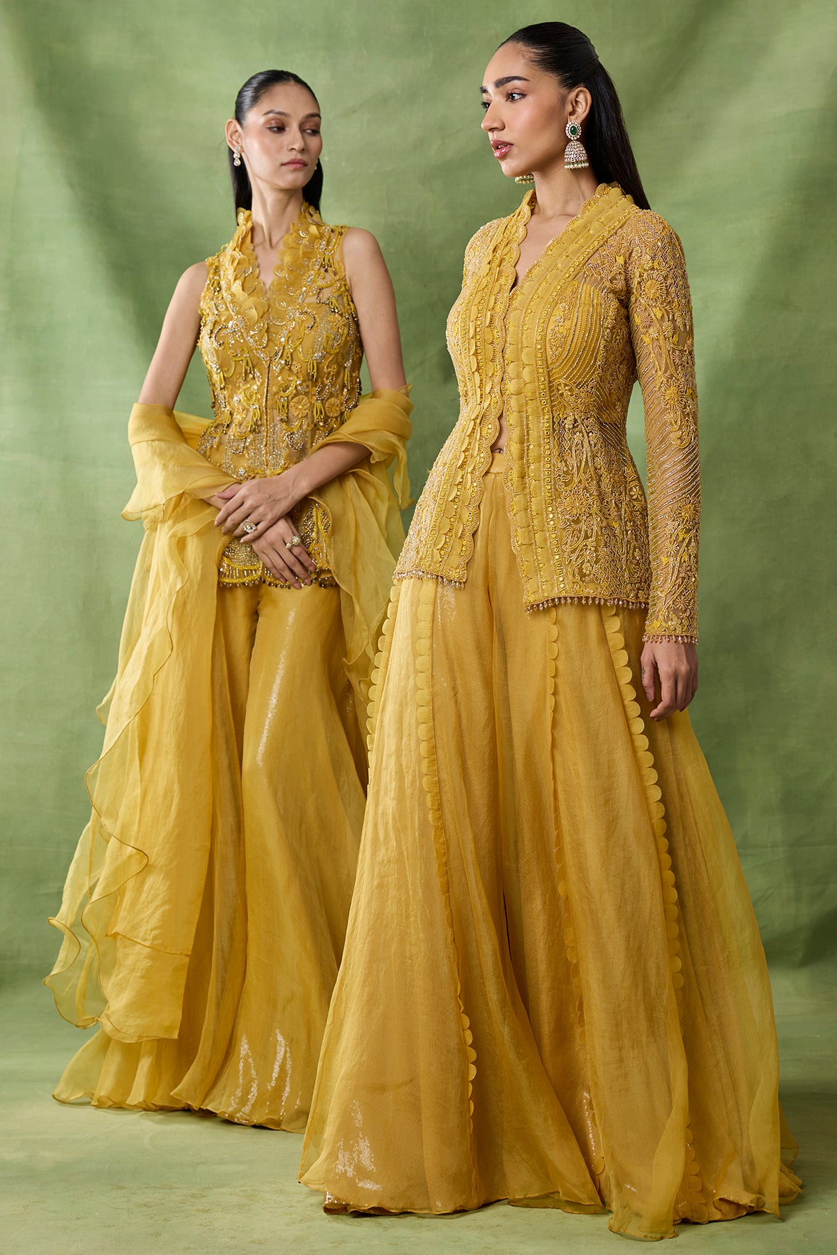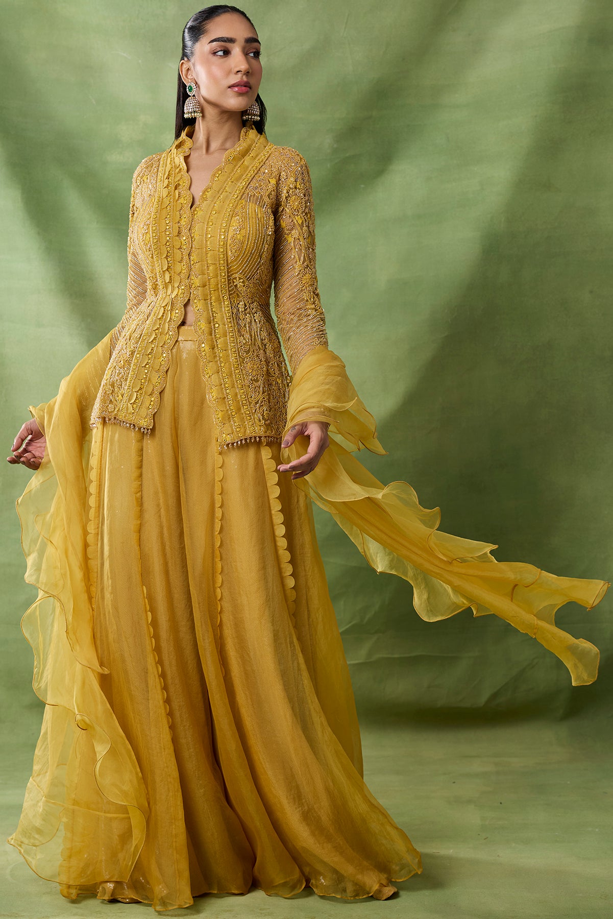 Product Description: featuring a yellow color fully embroidered peplum style jacket and sharara pants with lasor cutt and organza ruffels duppatta.