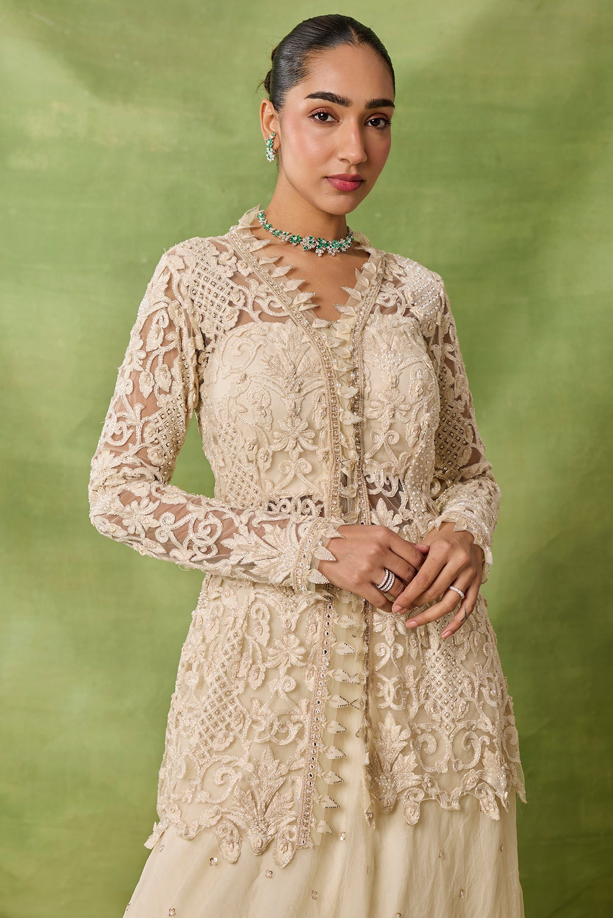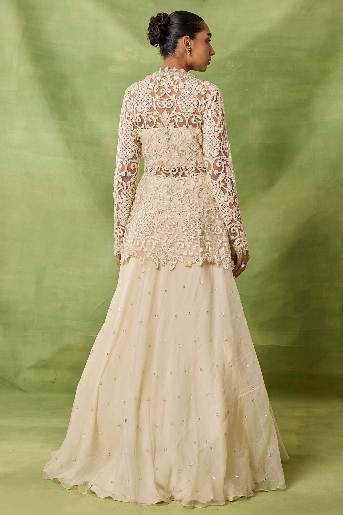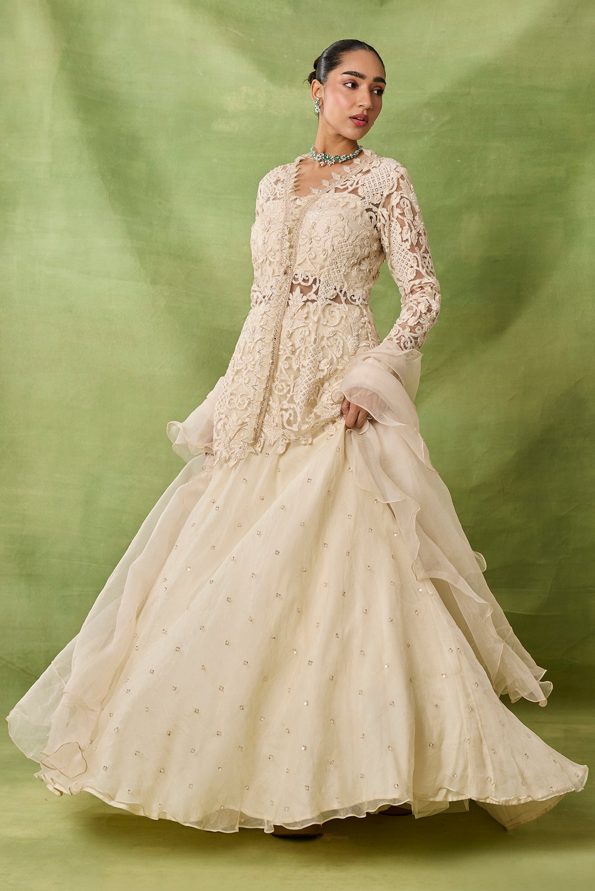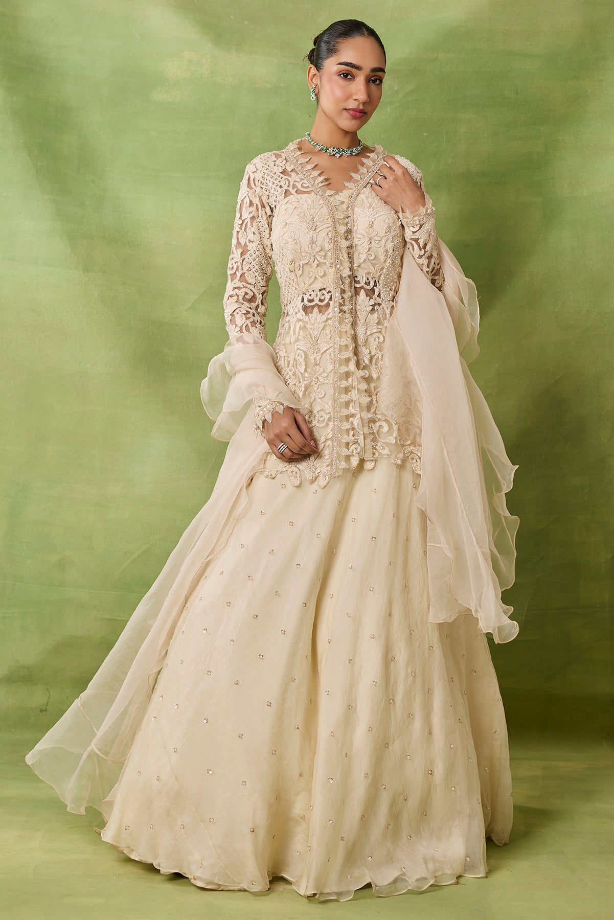Product Description: featuring peplum top with embroidered boota allover skirt and organza frills duppata.Category: AWIGNA SIGNATURE STYLESFabric: organza,netNumber of Pcs.: 3Designer Code: ASS56Color: IVORYWash Care: DRY CLEAN ONLY