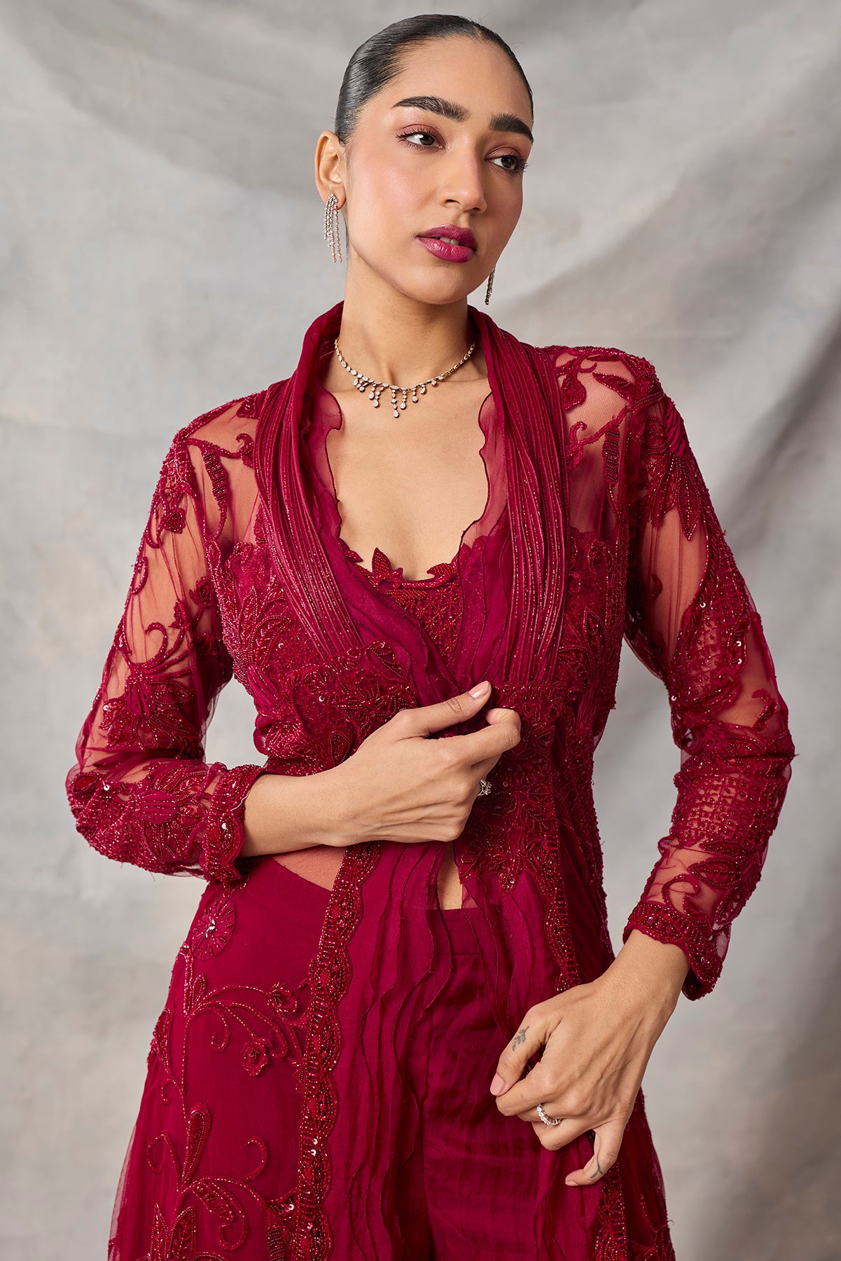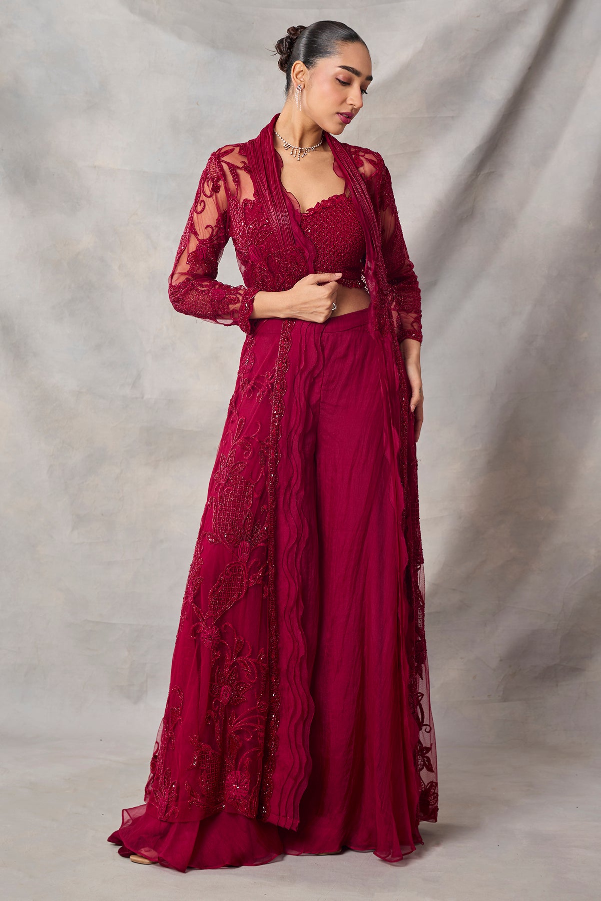 Product Description: featuring long fully embroidered jacket with bustier and shararaCategory: AWIGNA SIGNATURE STYLESFabric: organza,netNumber of Pcs.: 3Designer Code: ASS79Color: REDWash Care: DRY CLEAN ONLY