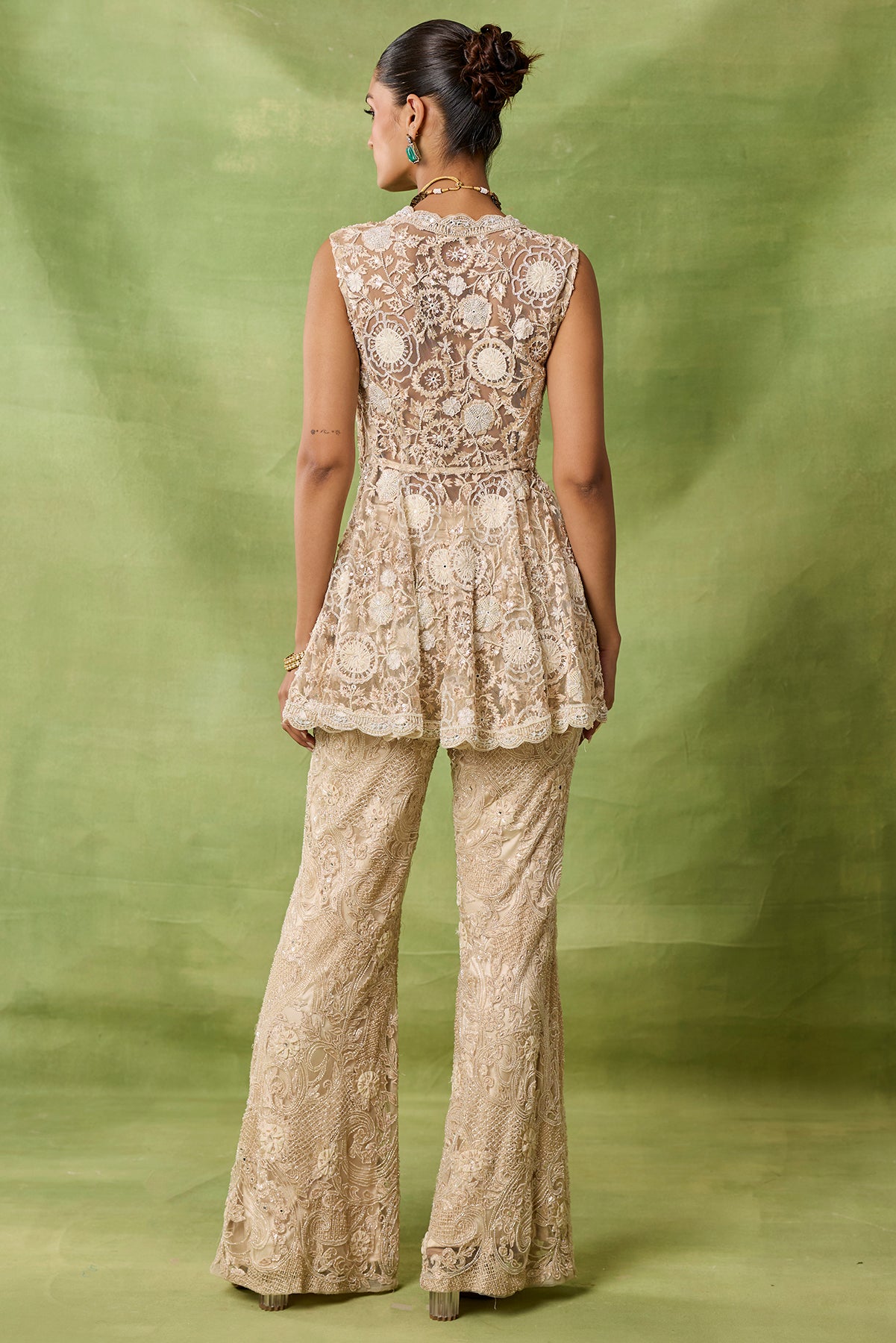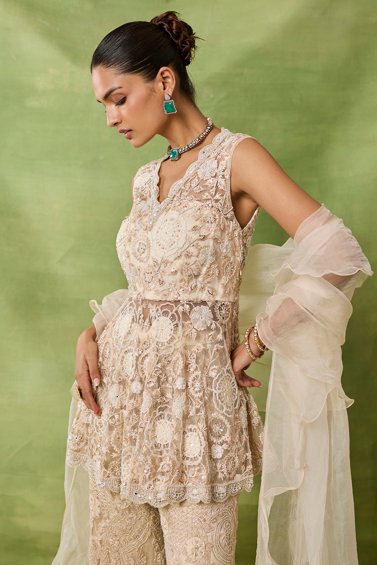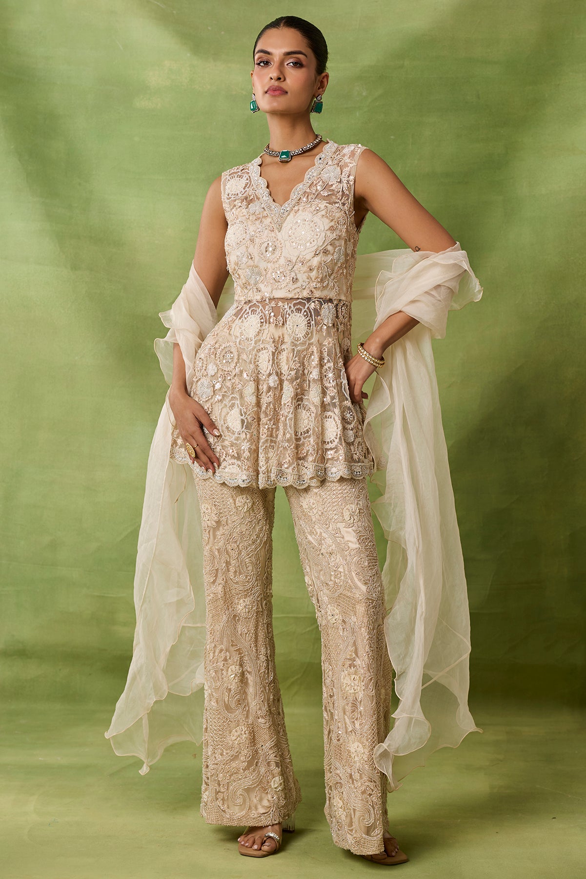 Product Description: featuring fully emboridered peplum and pants.Category: AWIGNA SIGNATURE STYLESFabric: net,organzaNumber of Pcs.: 3Designer Code: ASS47Color: CHAMPENEWash Care: DRY CLEAN ONLY