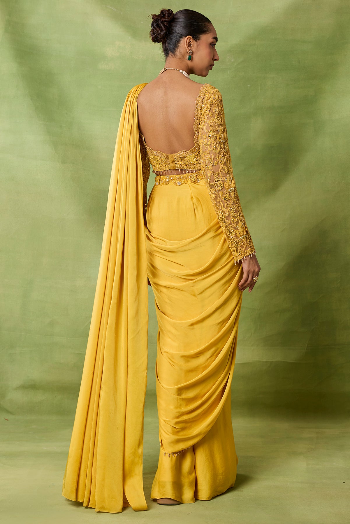 Product Description: featuring yellow draped saree with full sleeves emboirdered blouse.Category: AWIGNA SIGNATURE STYLESFabric: chiffon,netNumber of Pcs.: 2Designer Code: ASS46Color: YELLOWWash Care: DRY CLEAN ONLY