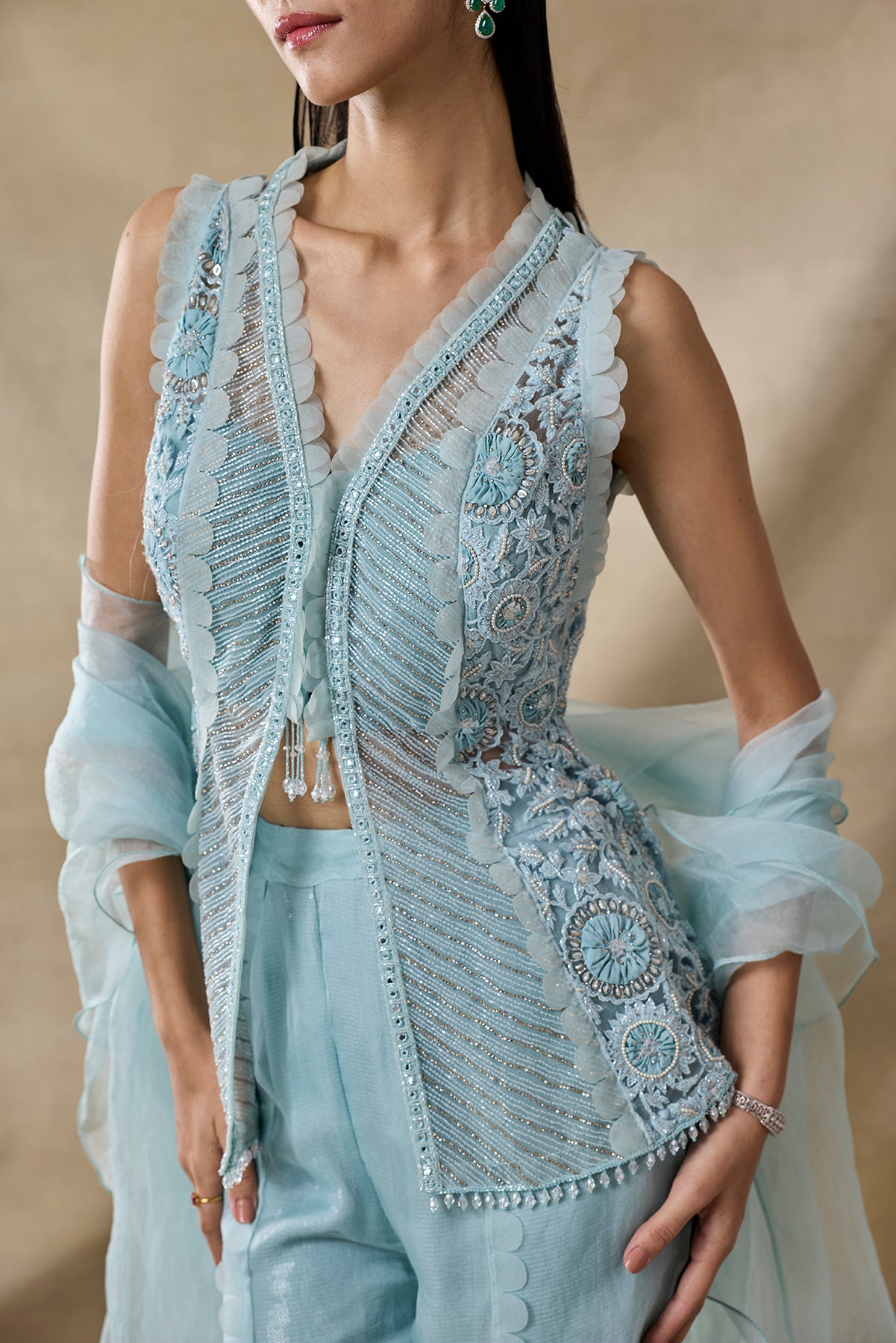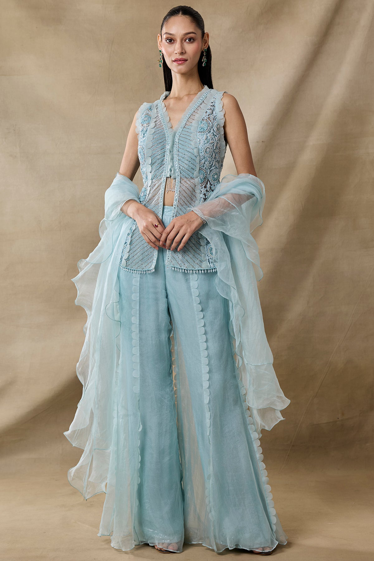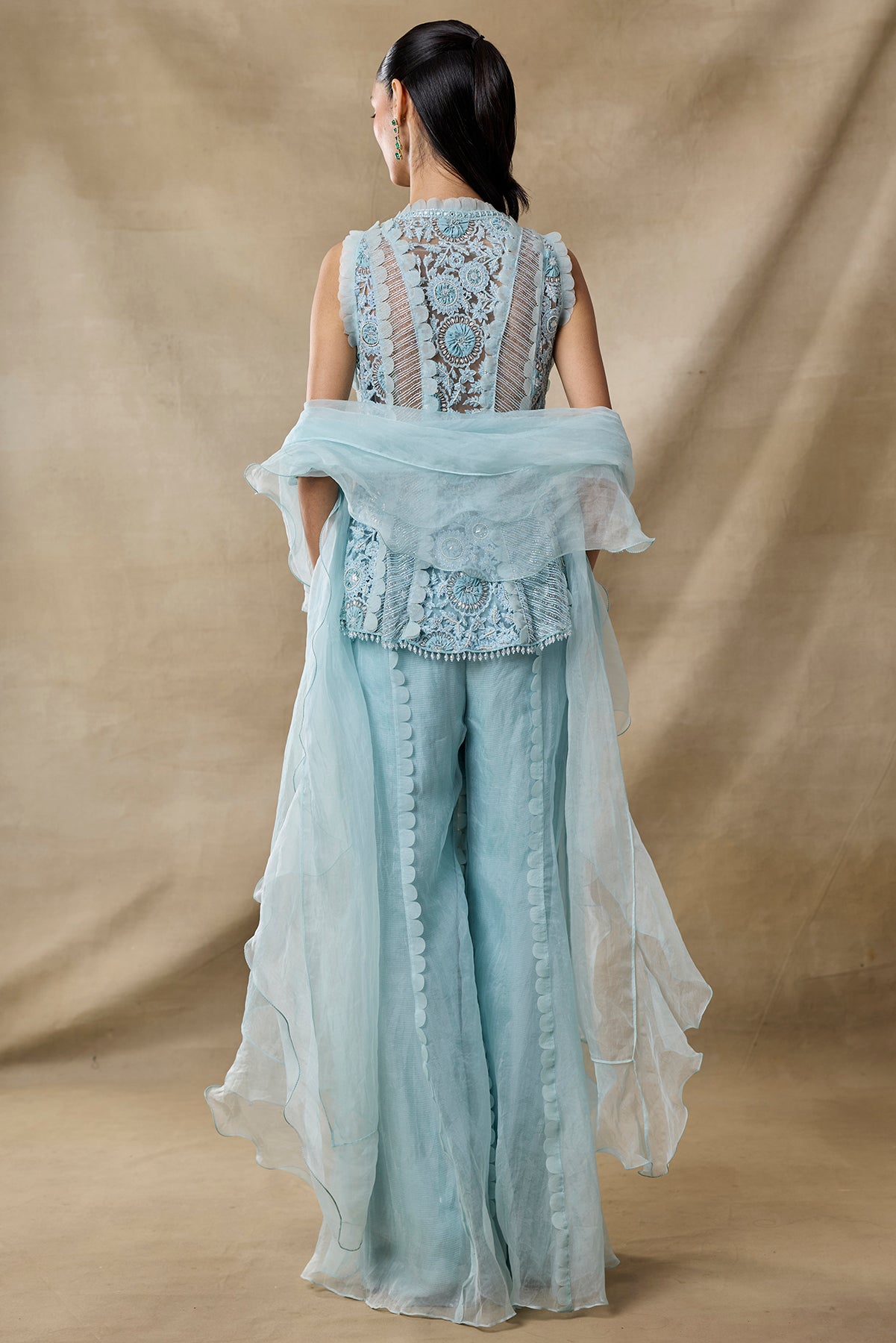 Product Description: An aqua, peplum jacket enhanced with embroidery and laser cut details, paired with a solid sharara highlighted with laser cut details.