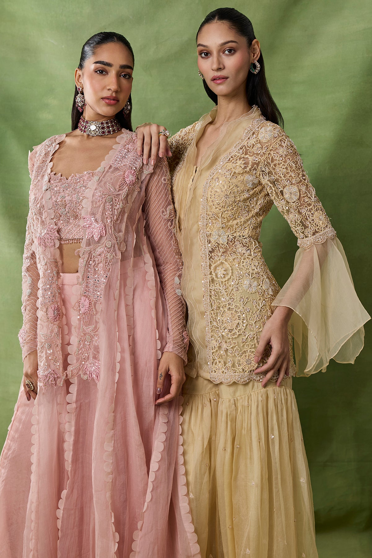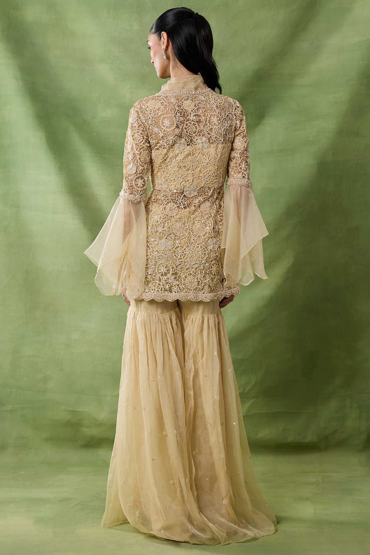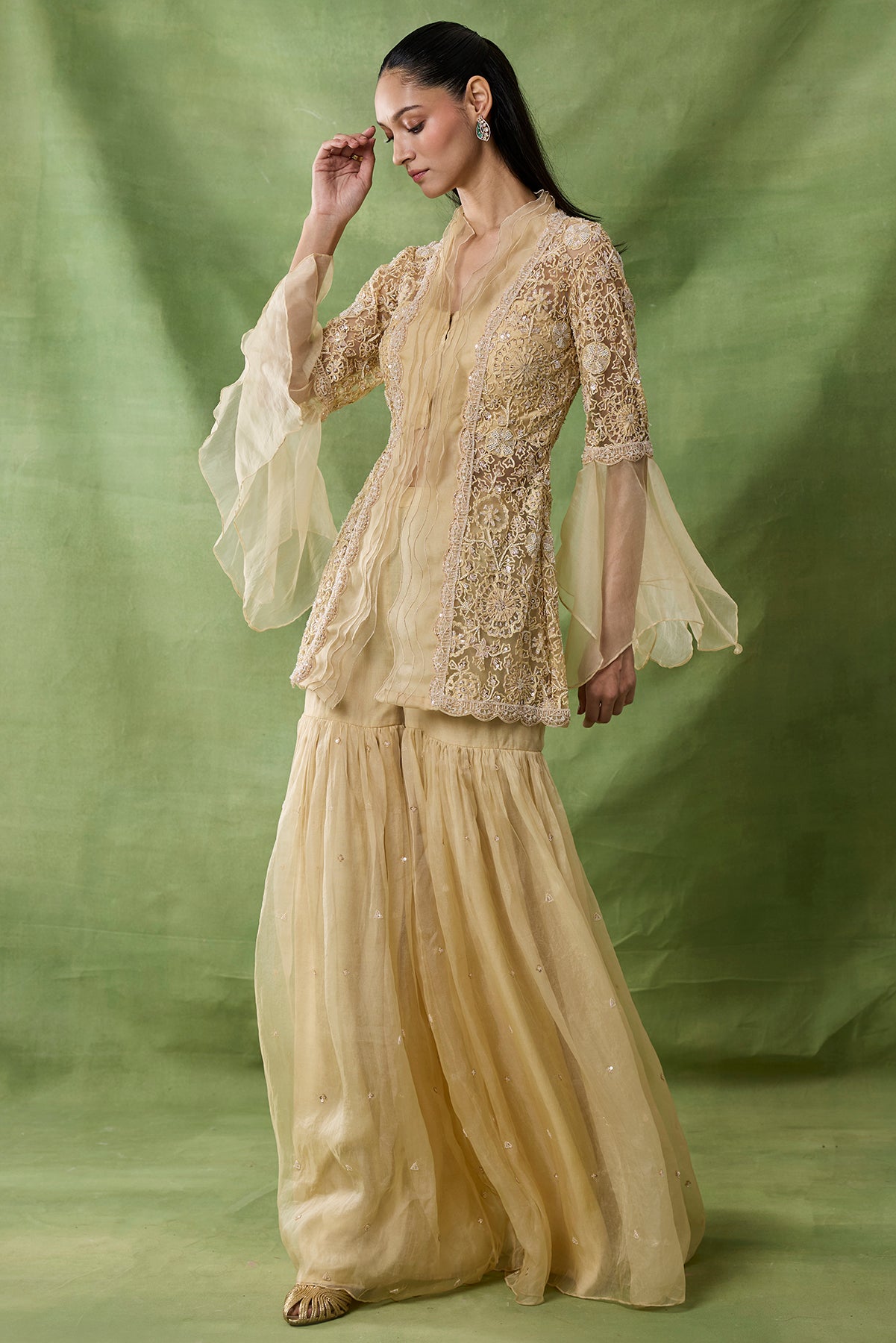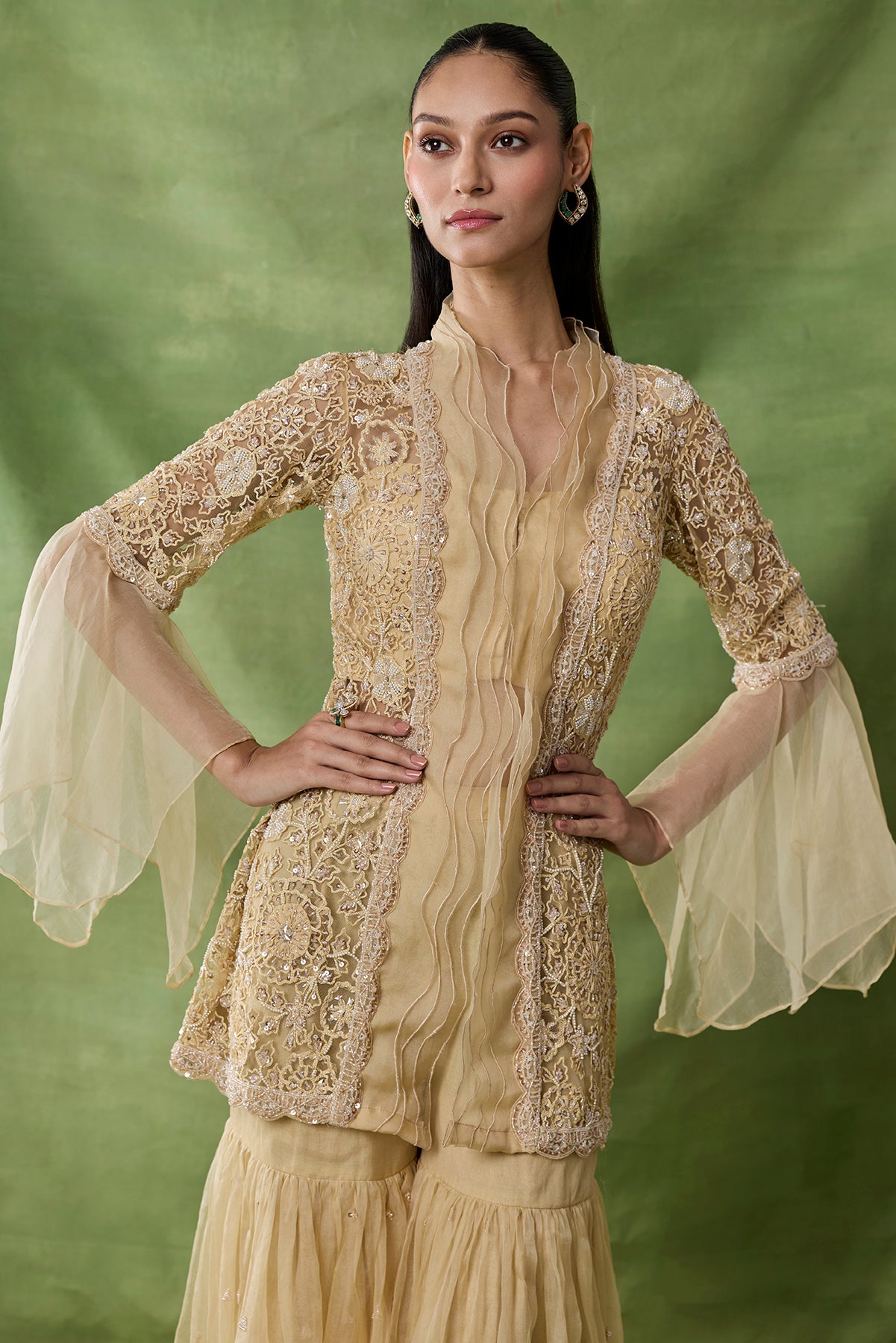 Product Description: featuring a champene fully embroidered peplum top with frilled sleeves and sharara.Category: AWIGNA SIGNATURE STYLESFabric: organza netNumber of Pcs.: 3Designer Code: ASS36Color: CHAMPAGNEWash Care: DRY CLEAN ONLY