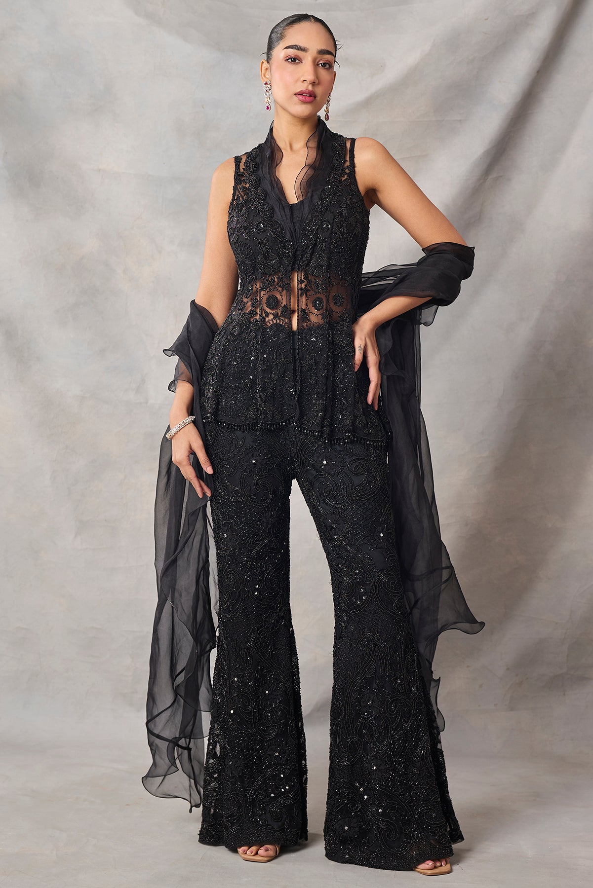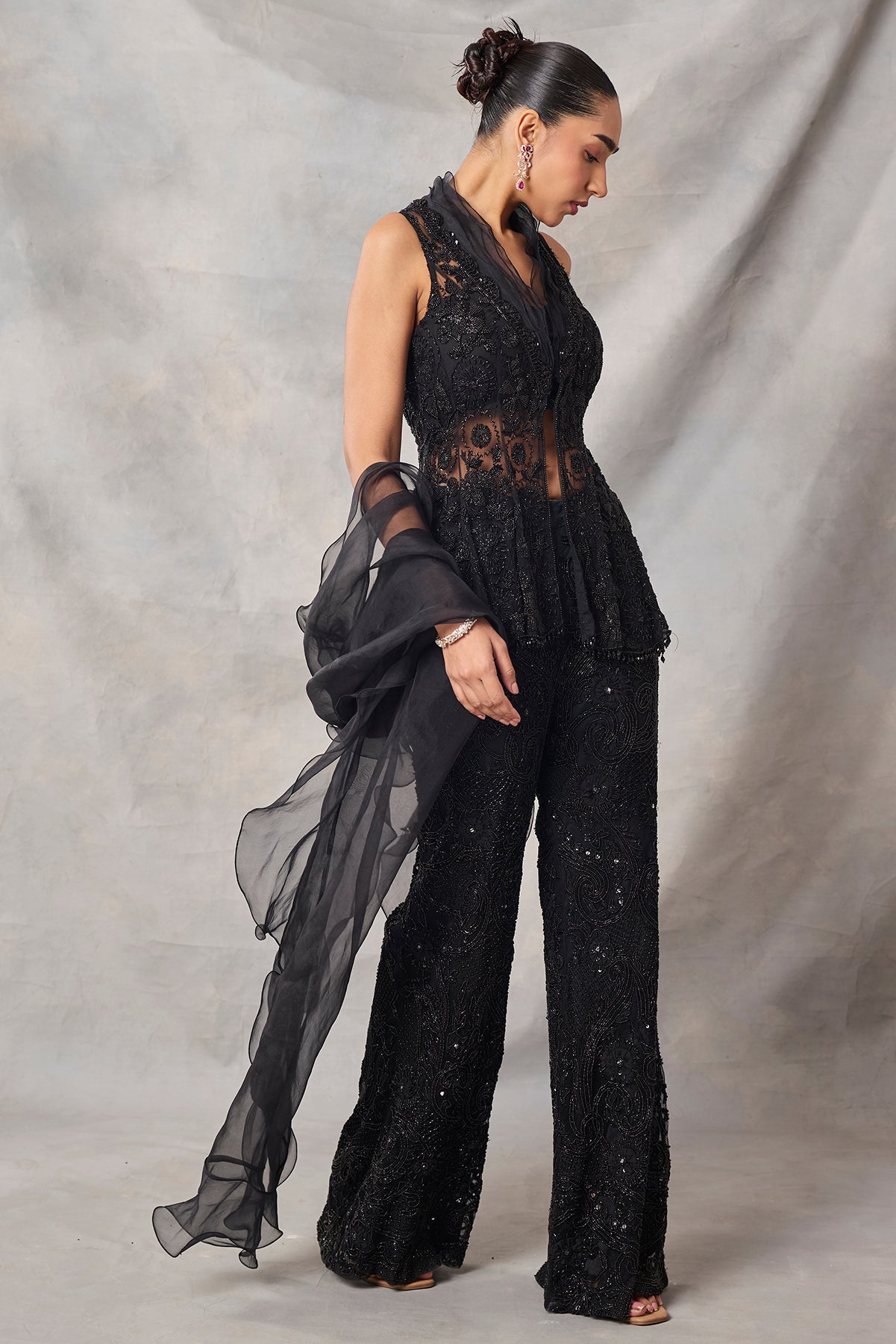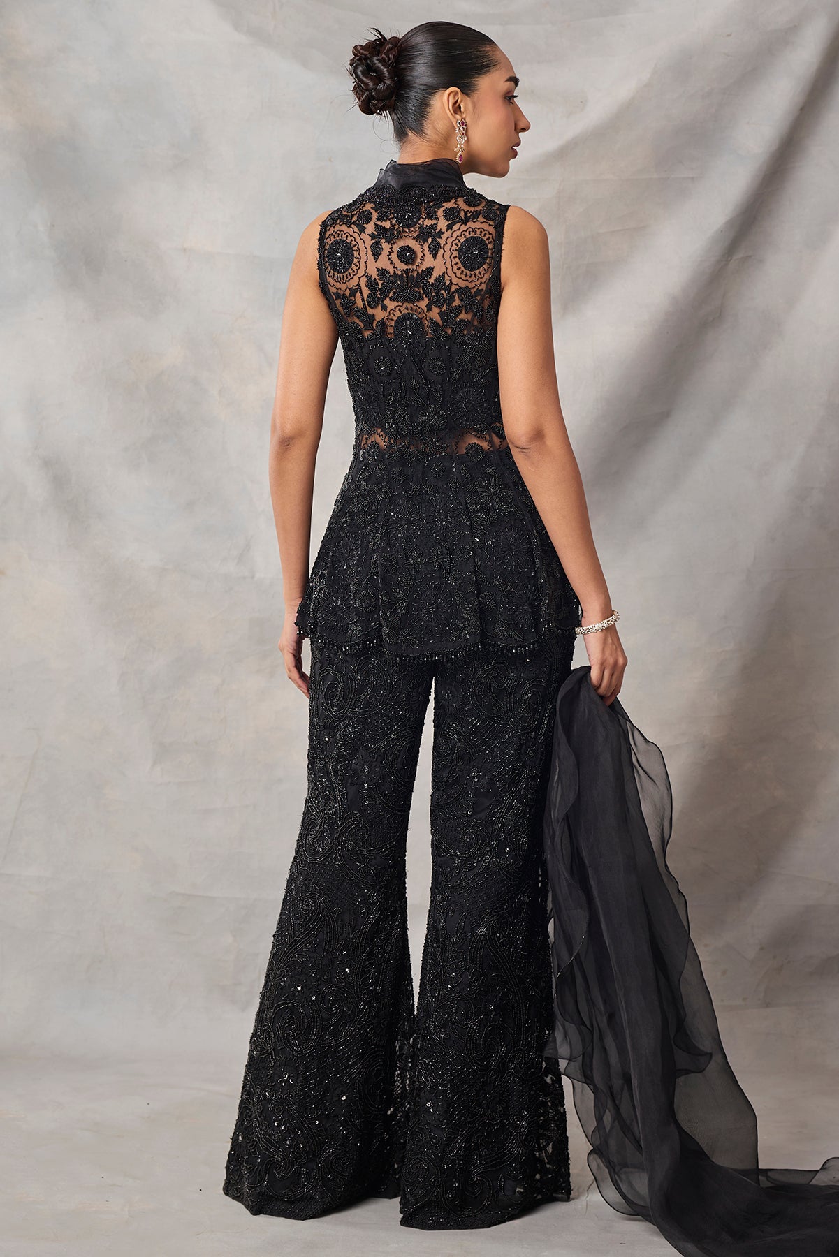 Product Description: featuring black fully embroidered peplum top with pants.Category: AWIGNA SIGNATURE STYLESFabric: organza,netNumber of Pcs.: 3Designer Code: ASS81Color: BLACKWash Care: DRY CLEAN ONLY