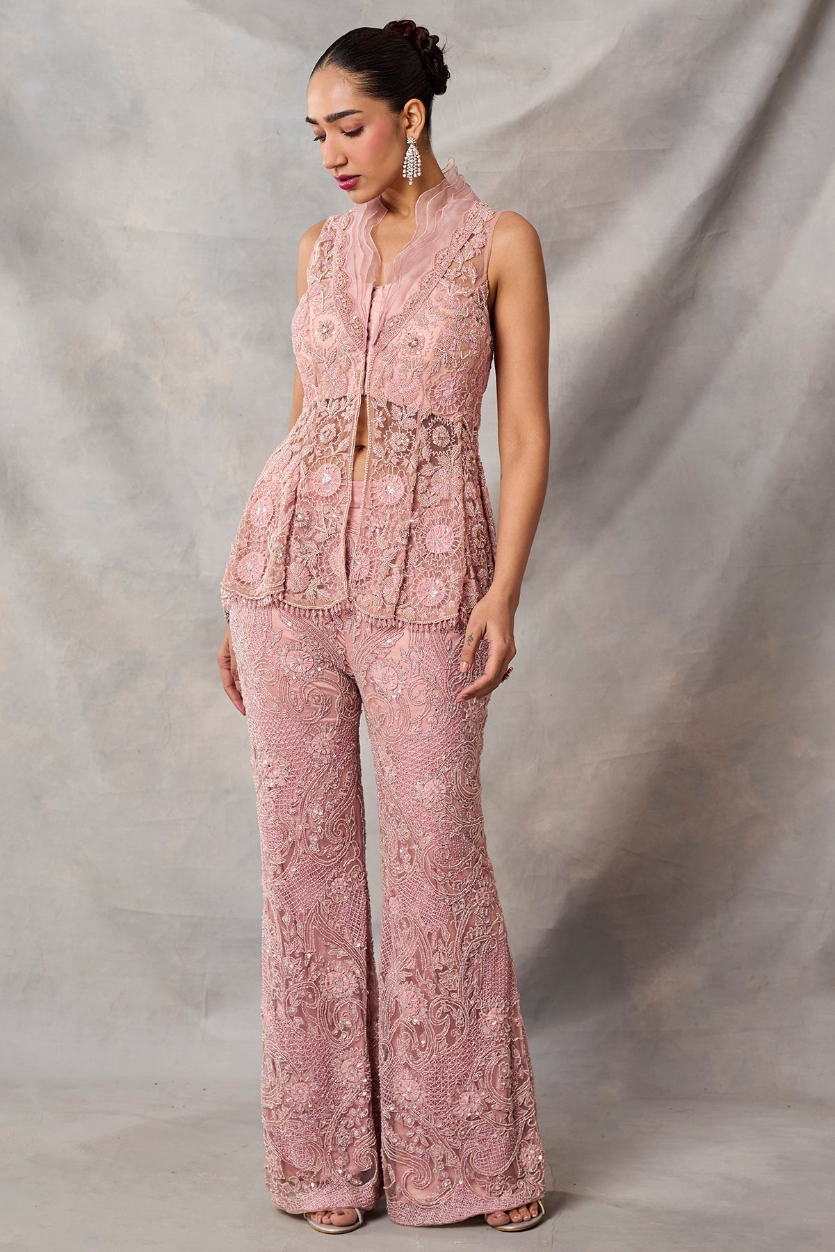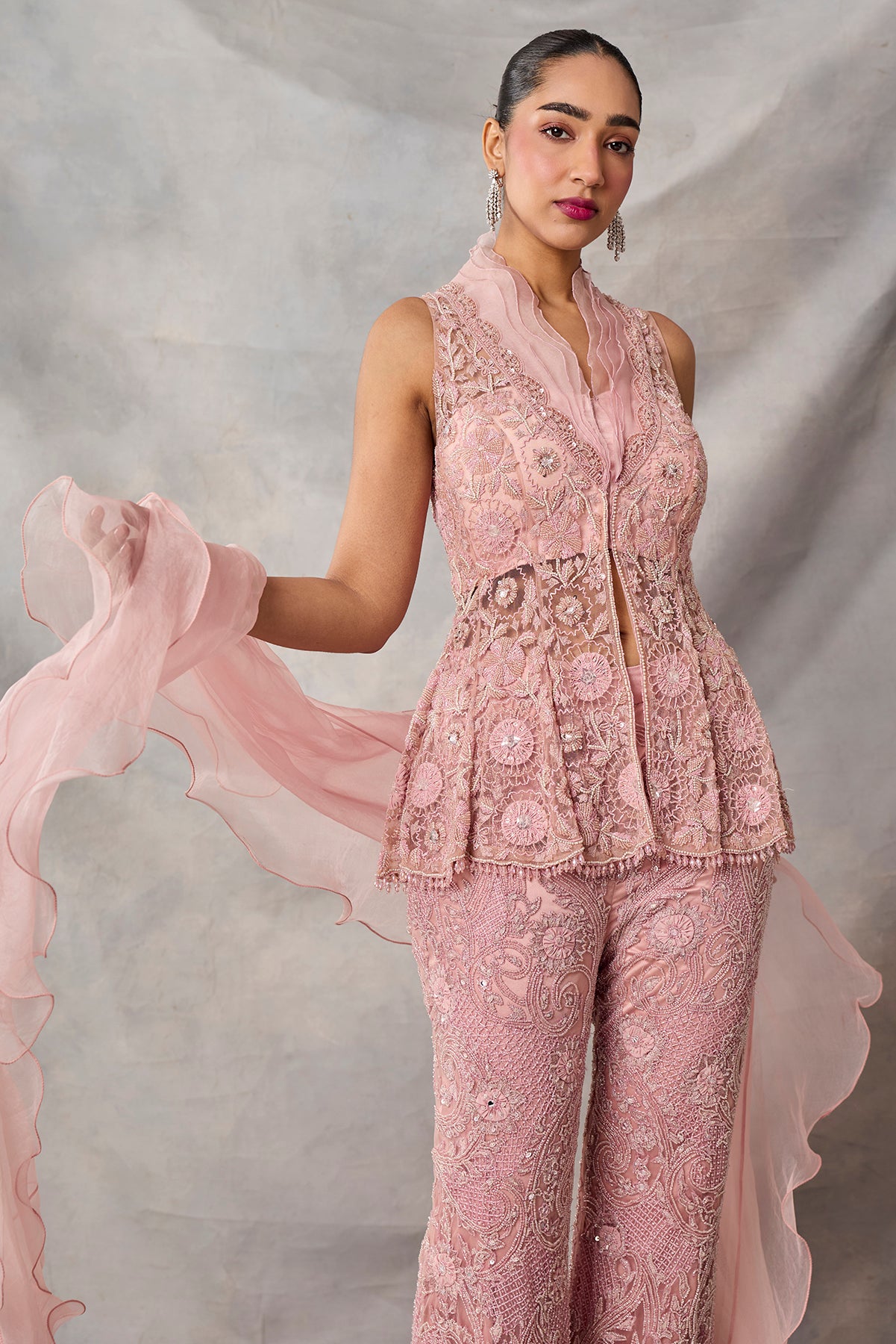 Product Description: featuring pink embroidered peplum top and pants with enhanced organza collarCategory: AWIGNA SIGNATURE STYLESFabric: organza,netNumber of Pcs.: 3Designer Code: ASS67Color: PINKWash Care: DRY CLEAN ONLY