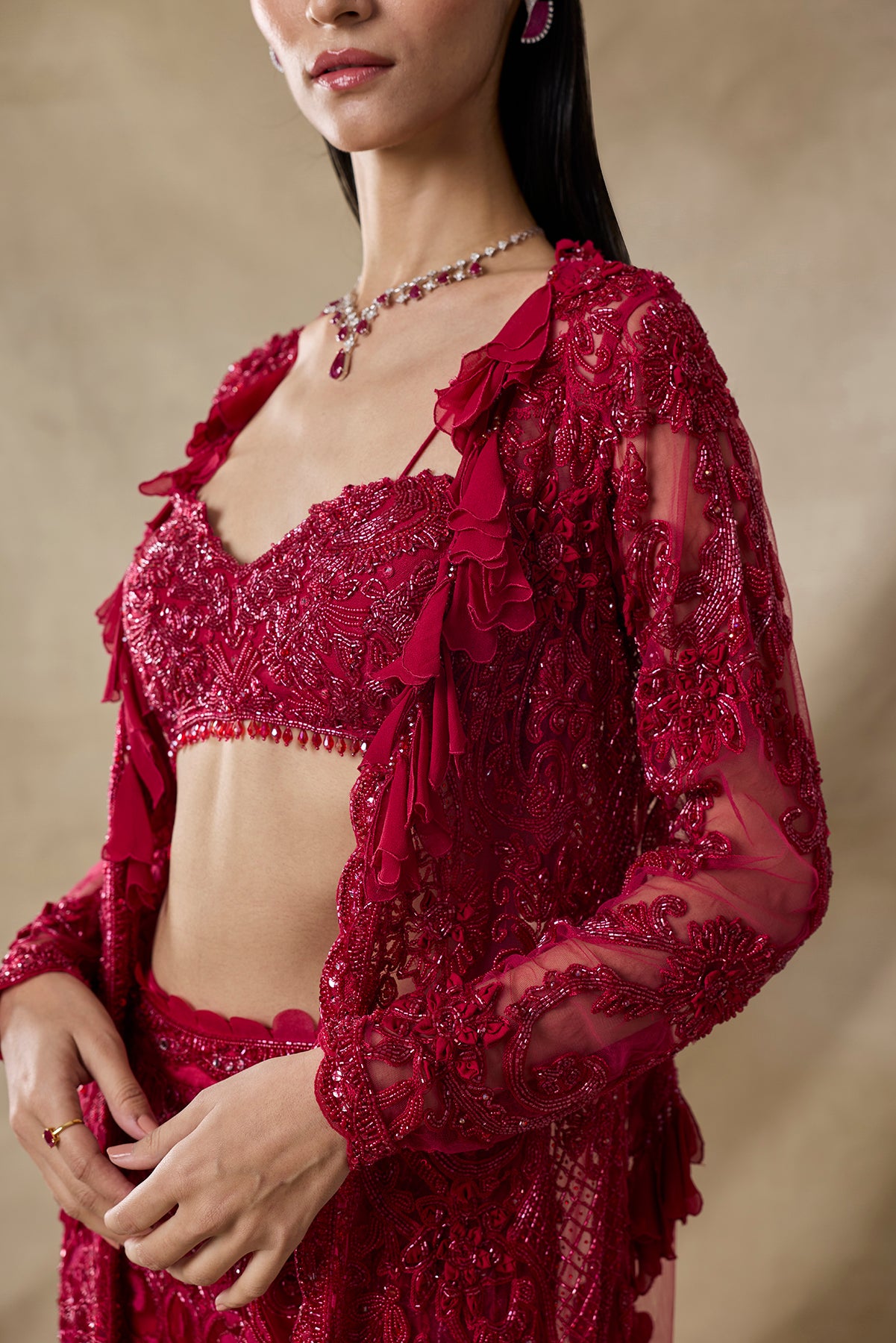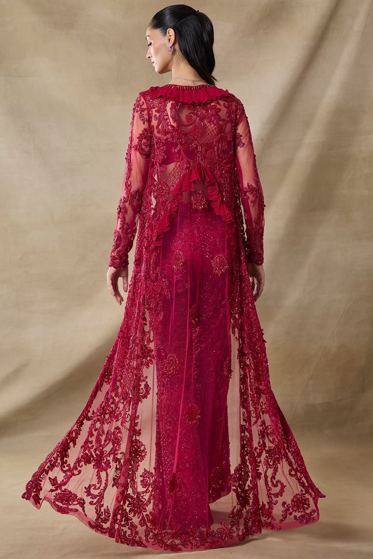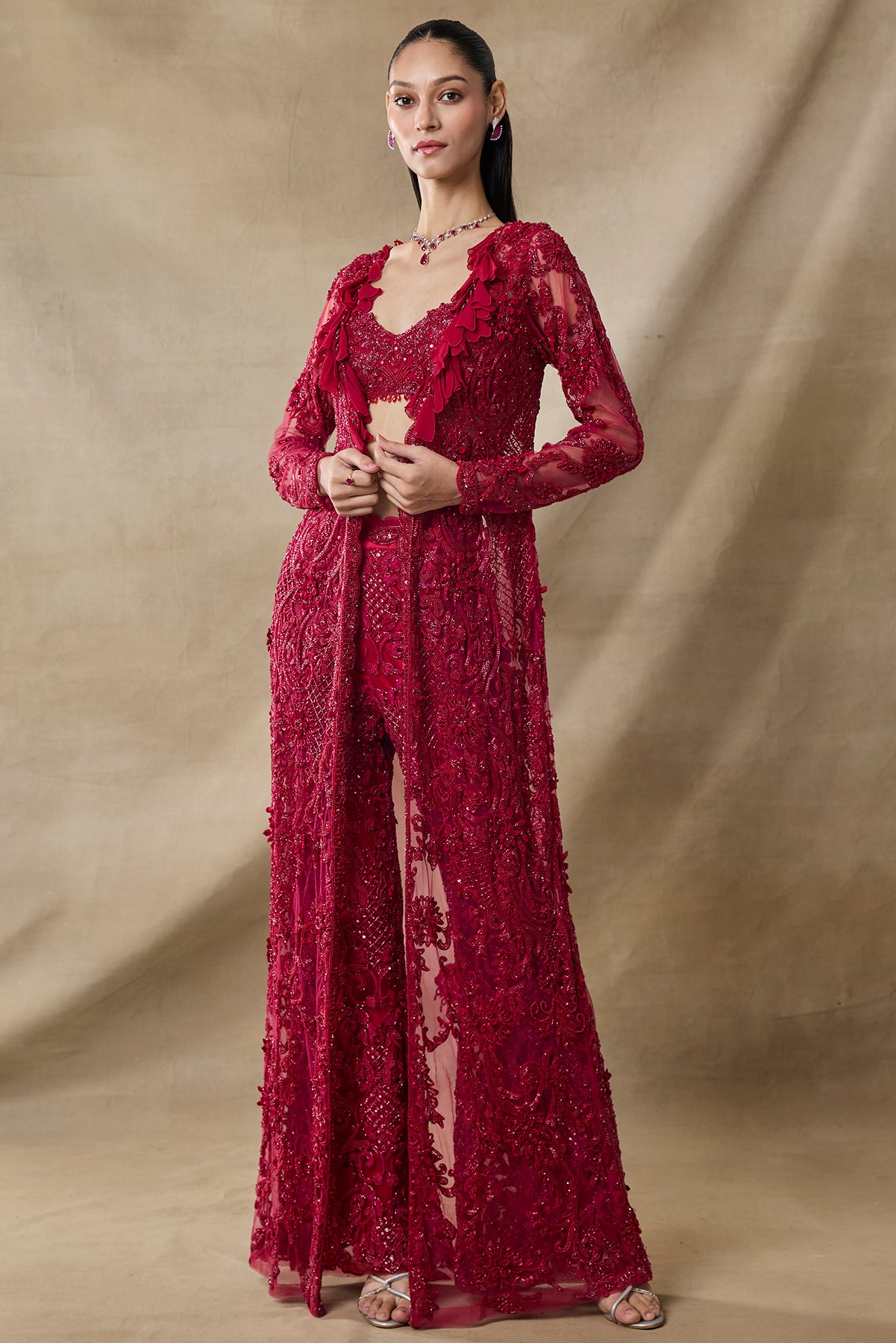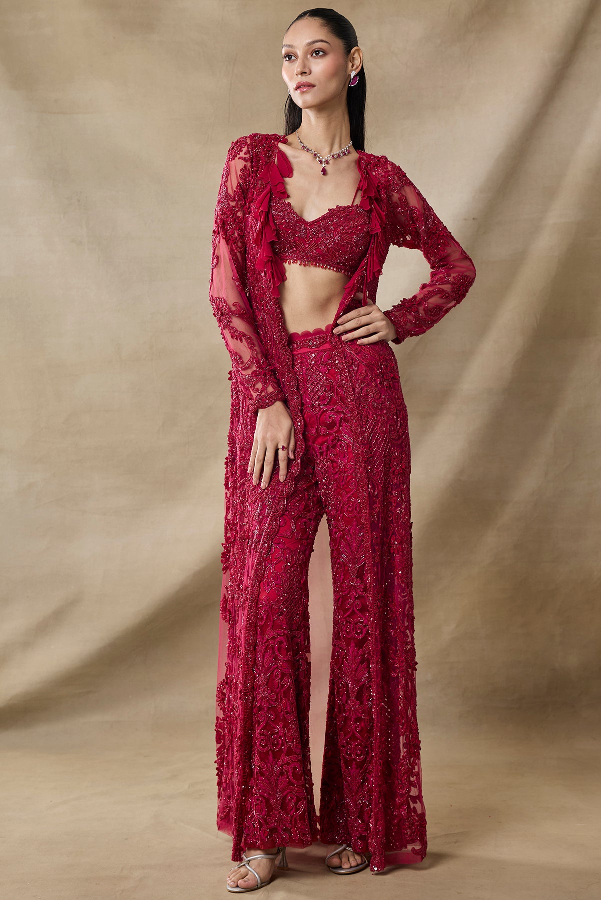 Product Description: featuring a blood red color fully embroidered bustier pants and long cape set.Category: AWIGNA SIGNATURE STYLESFabric: net,organzaNumber of Pcs.: 3Designer Code: ASS10Color: REDWash Care: DRY CLEAN ONLY