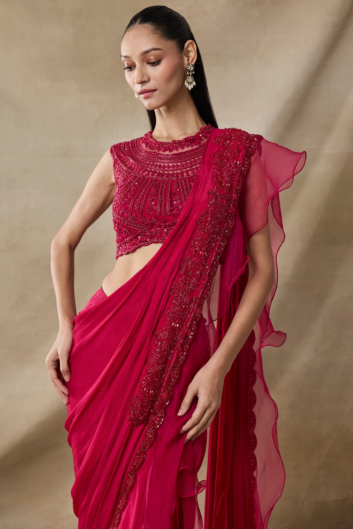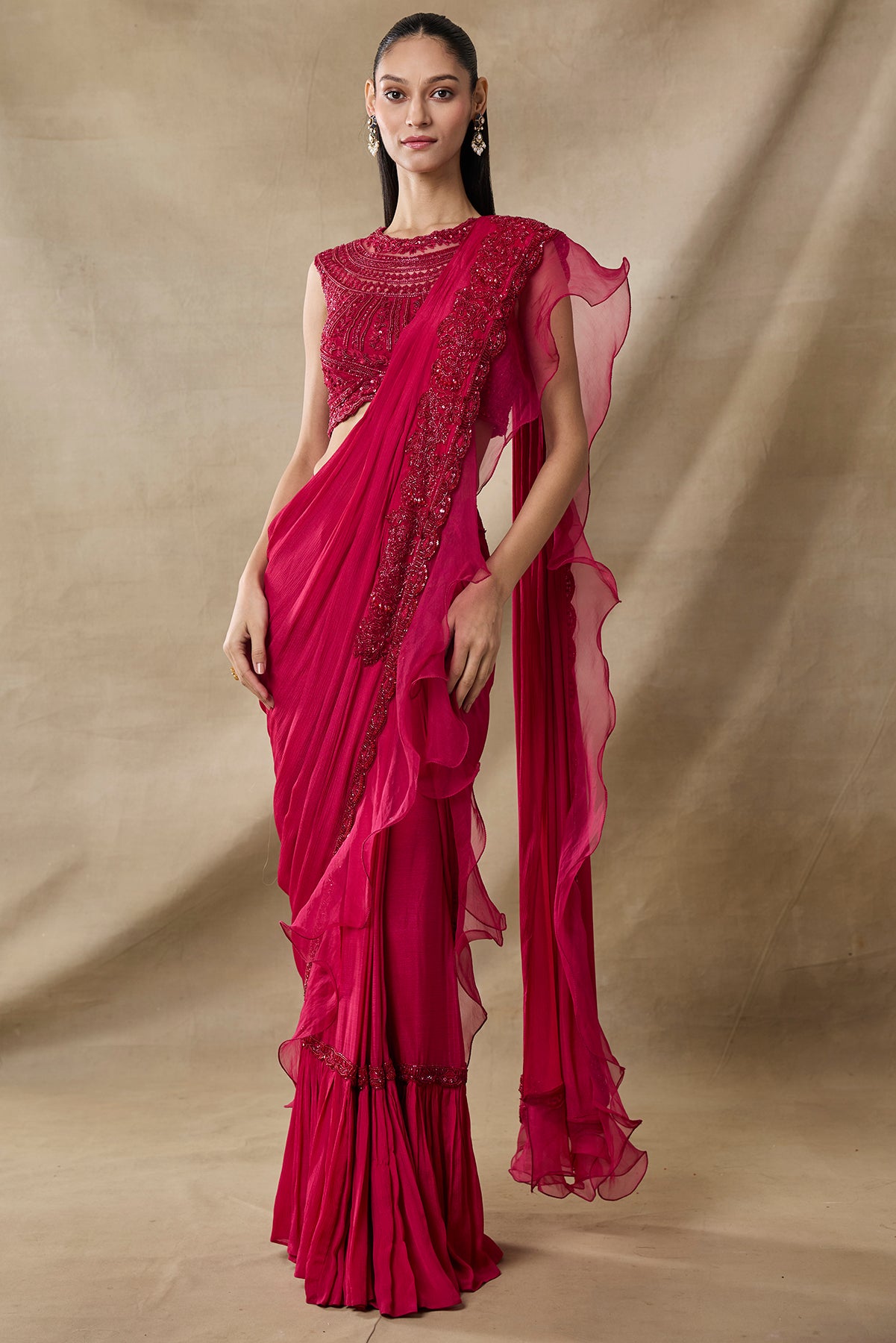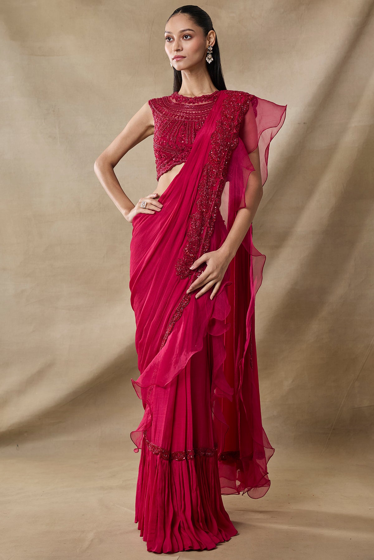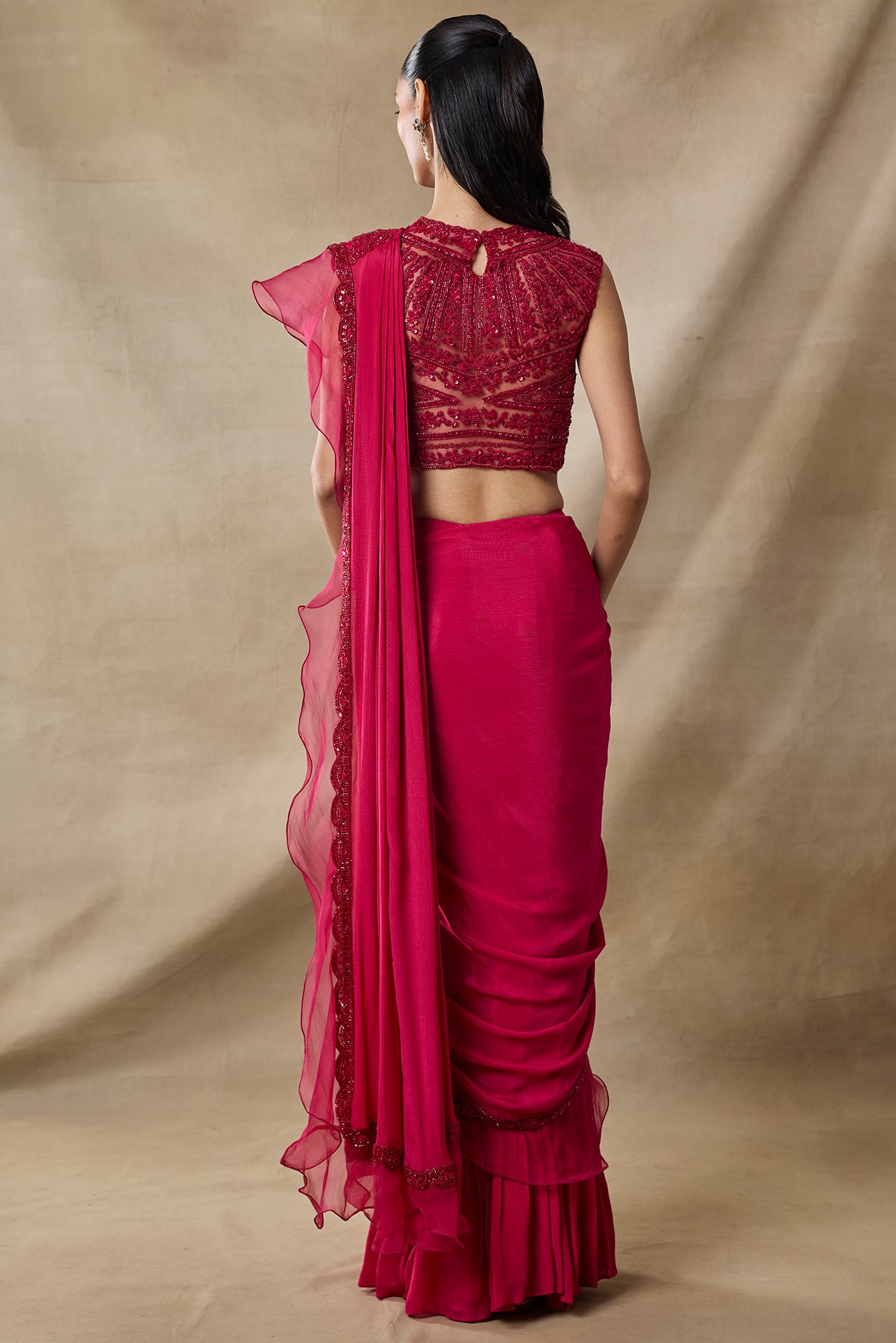 Product Description: Pre-draped saree with heavy pallu border in bottle green color with fully 3d floral embroidered blouse.