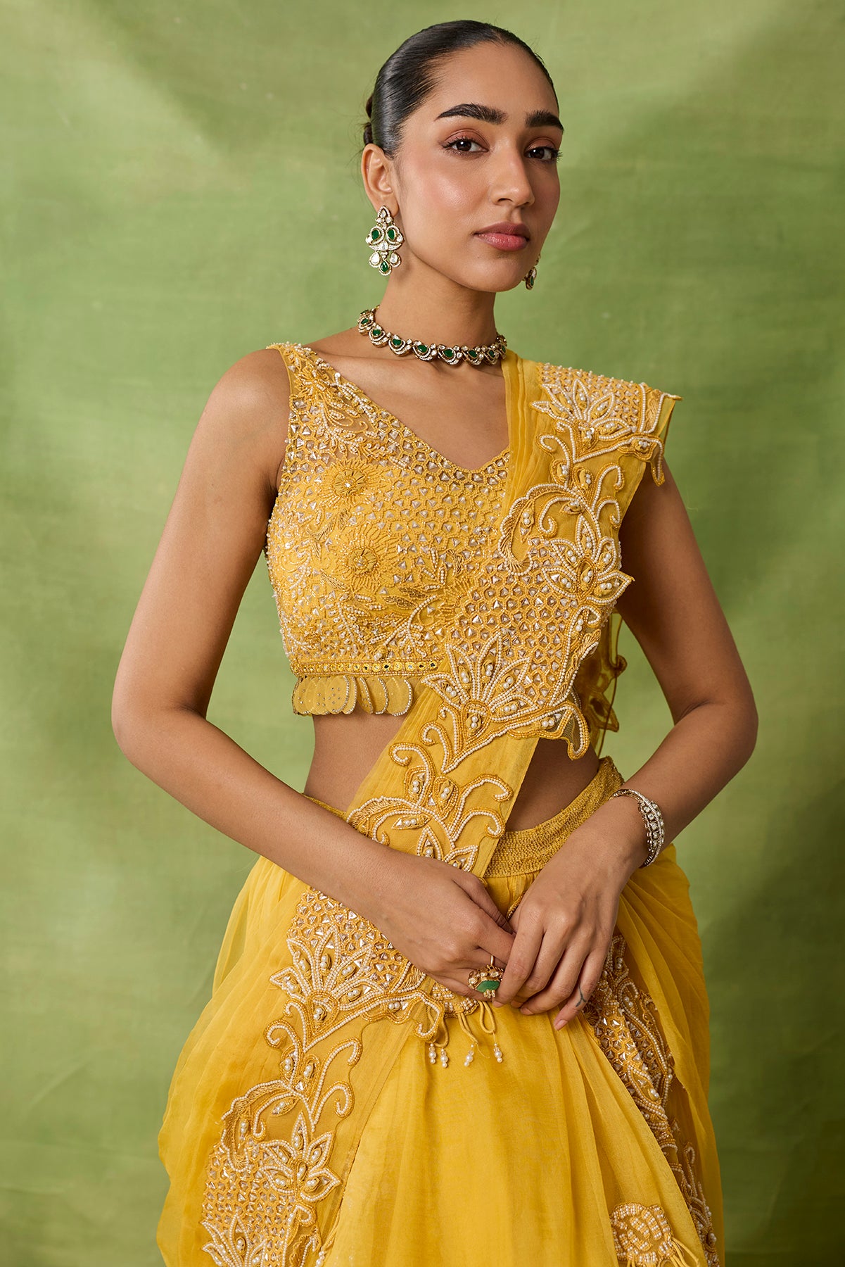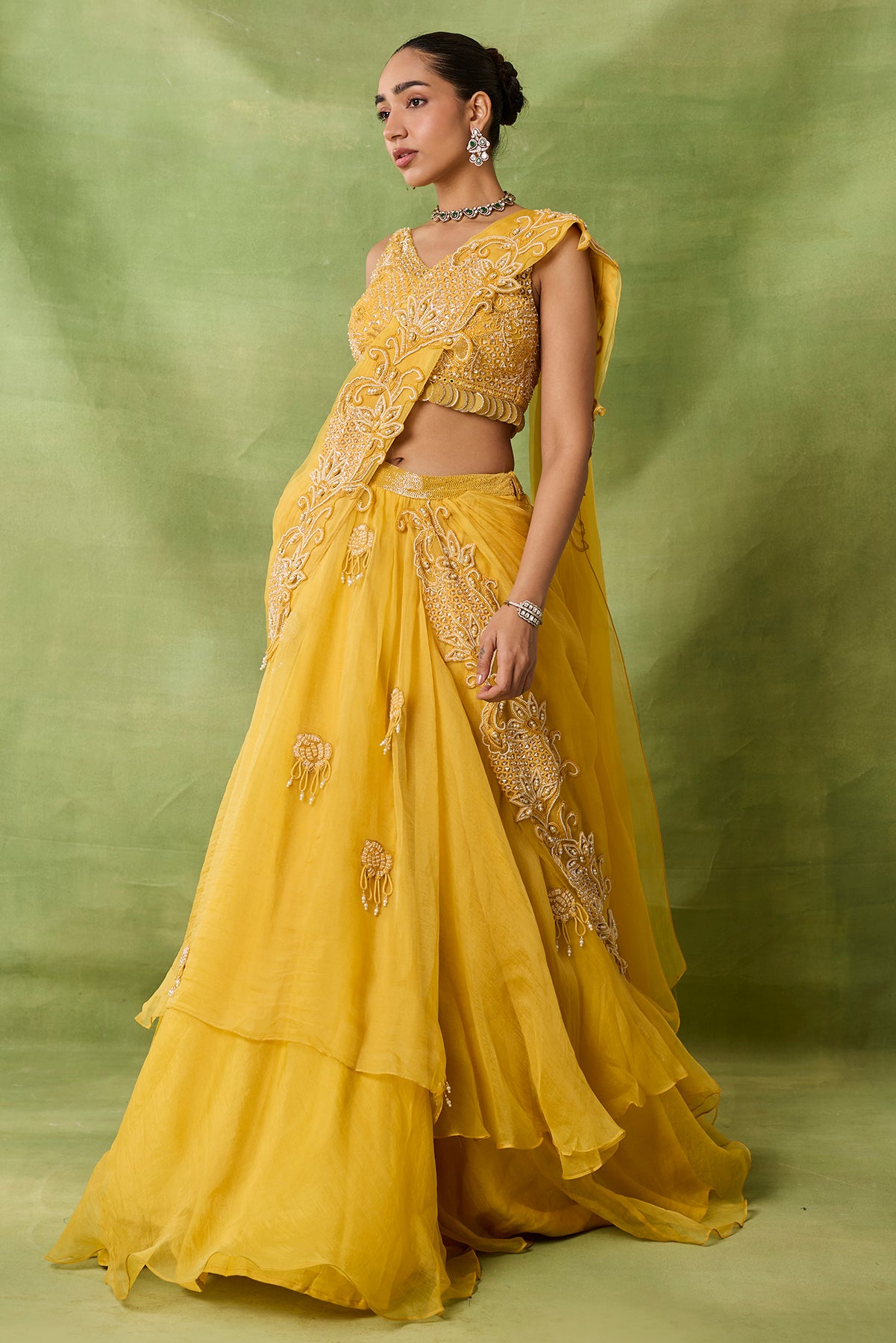 Product Description: featuring yellow skirt saree set with heavy emboridered blouse and pallu Category: AWIGNA SIGNATURE STYLESFabric: georgette,netNumber of Pcs.: 3Designer Code: ASS44Color: YELLOWWash Care: DRY CLEAN ONLY