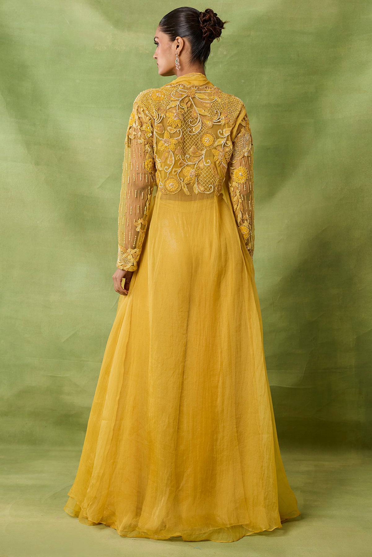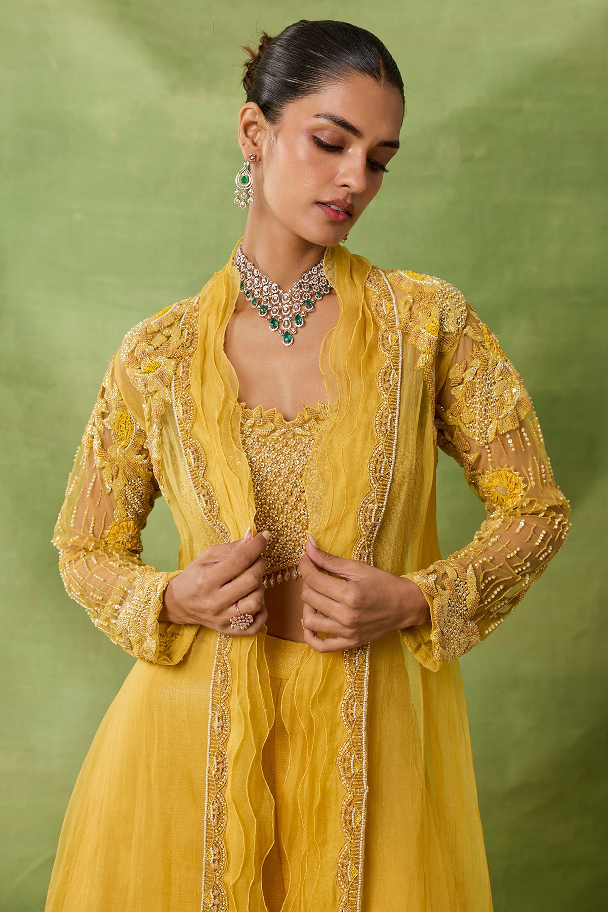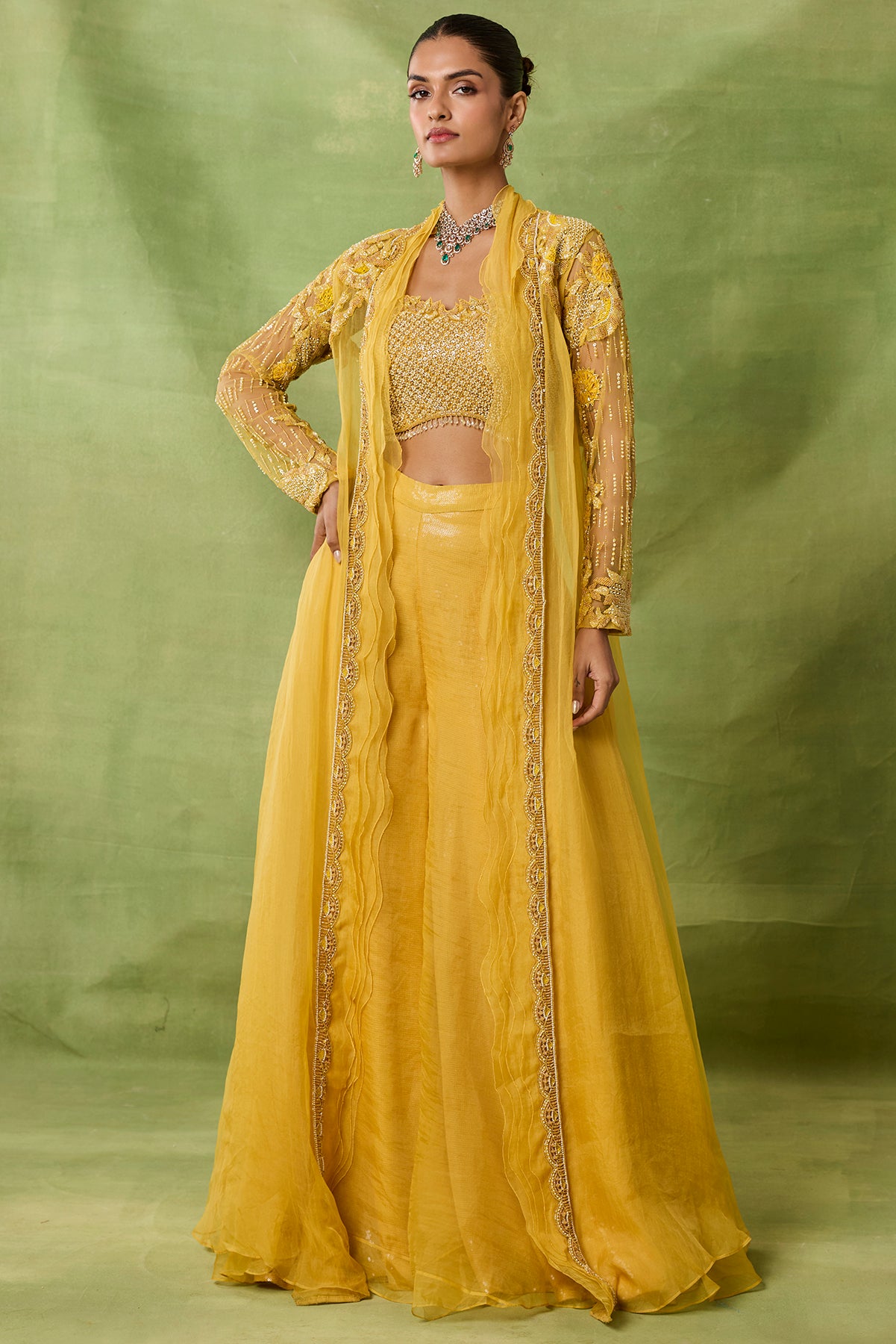 Product Description: featuring sharara long jacket with embroidered bustier and jacket enhanced with organza frills.