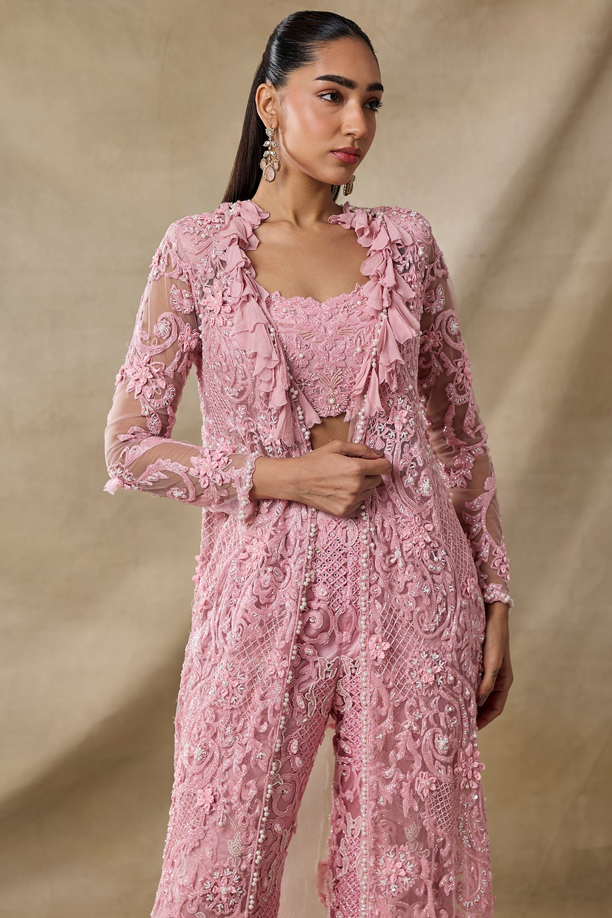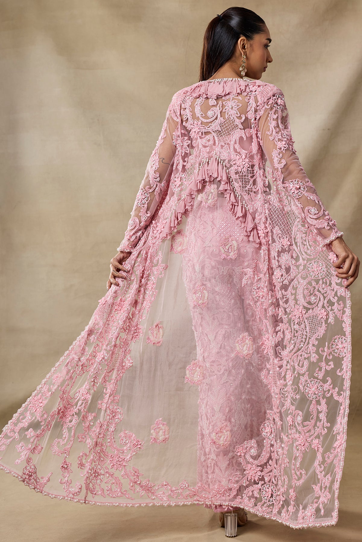 Product Description: featuring a salmon pink fully embroidered bustier pants and long cape set detailled with tasseles.