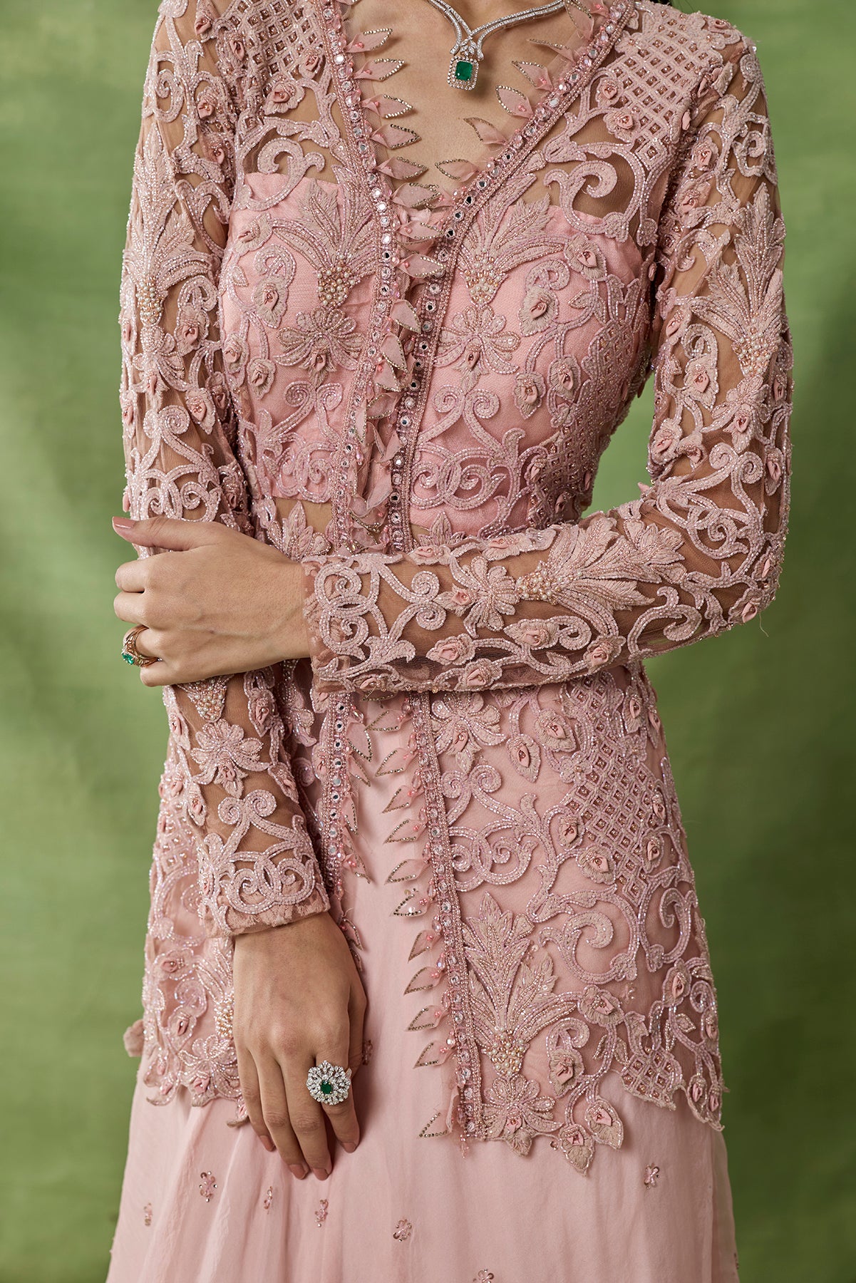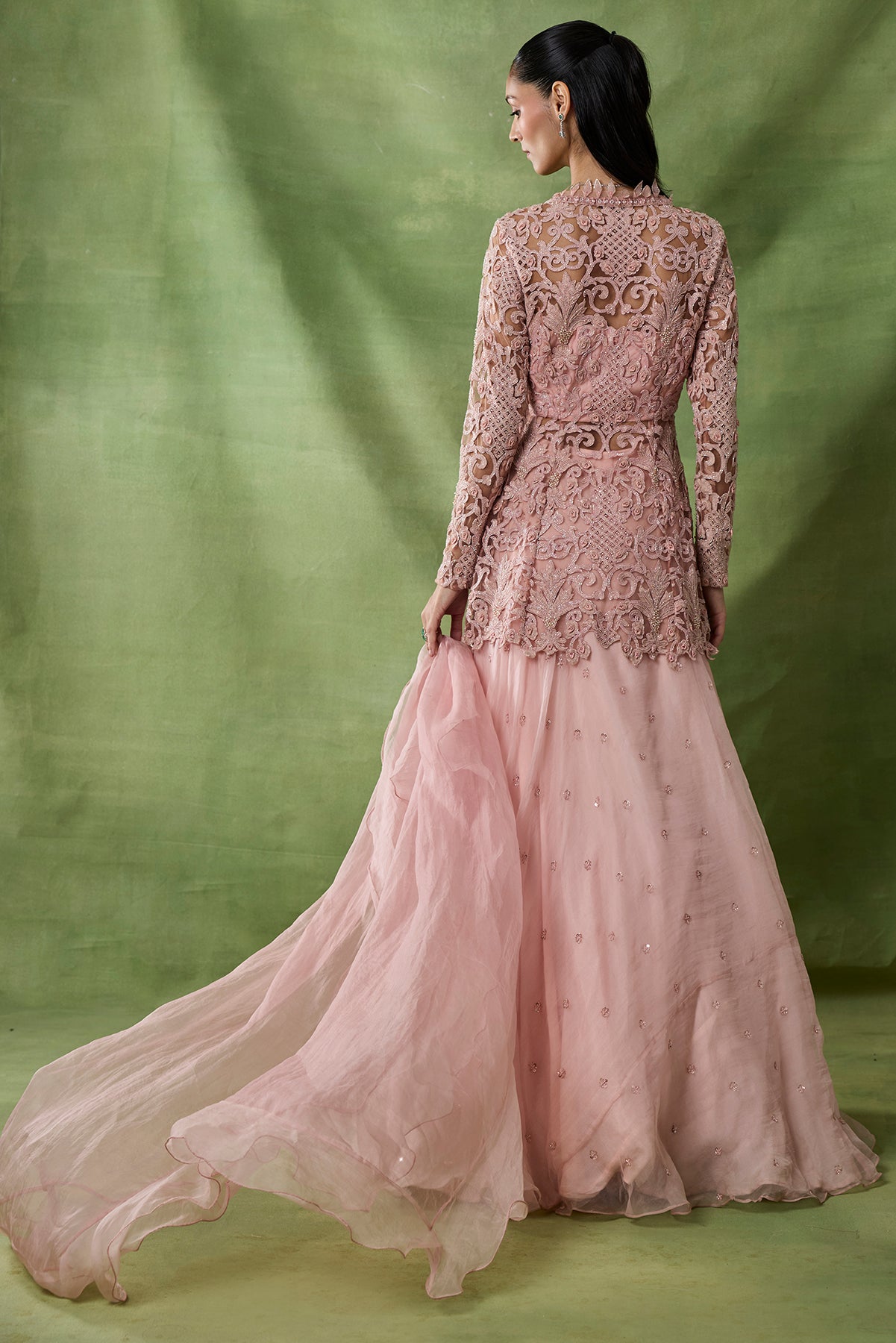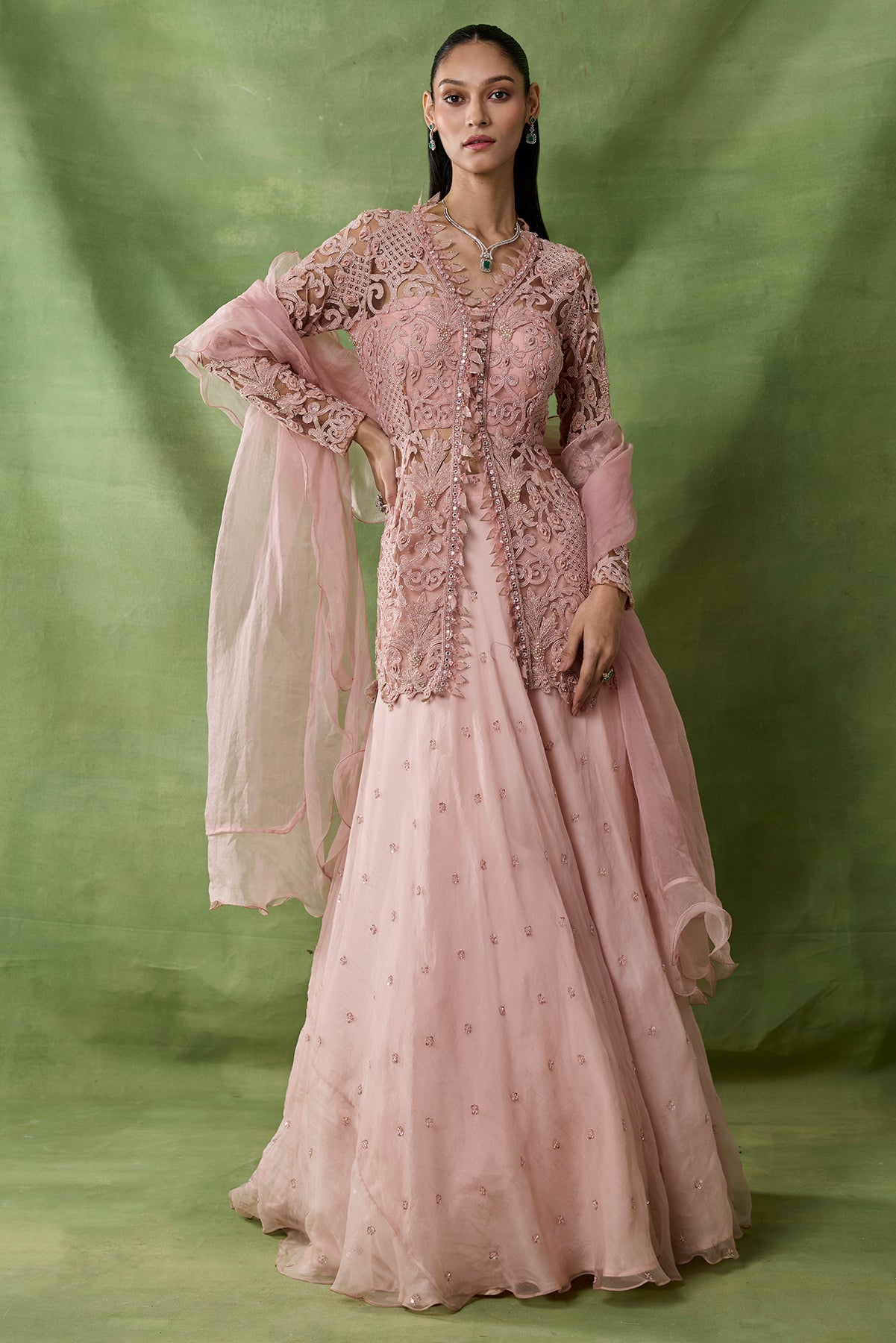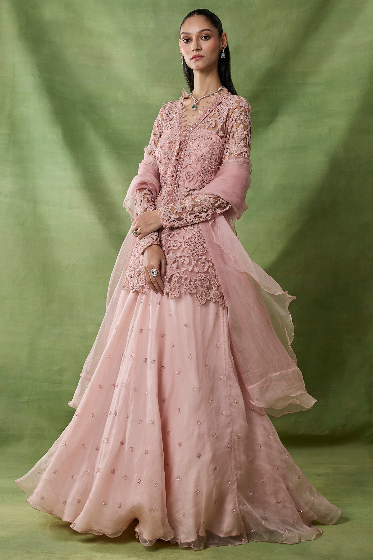 Product Description: Featuring pink color skirt with chitta embroidary set with fully embroidered peplum top and organza frilled duppata