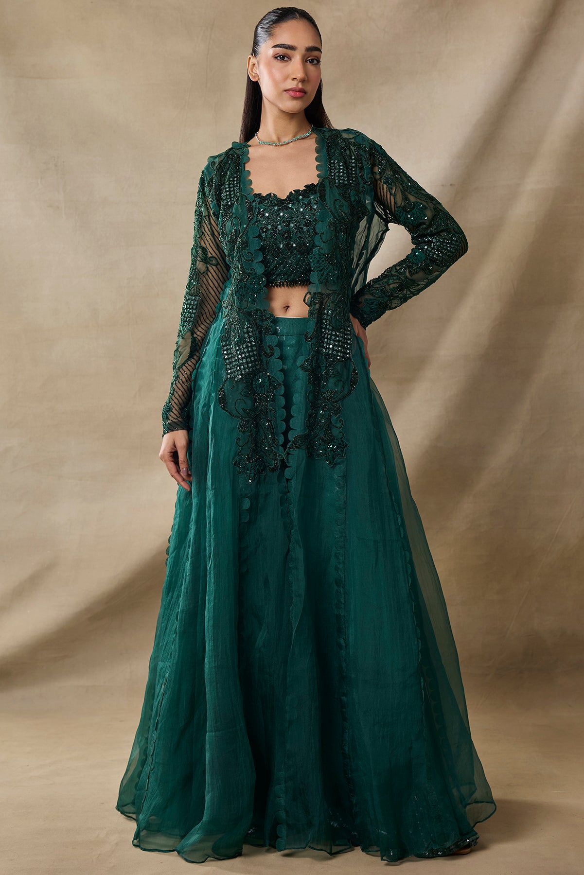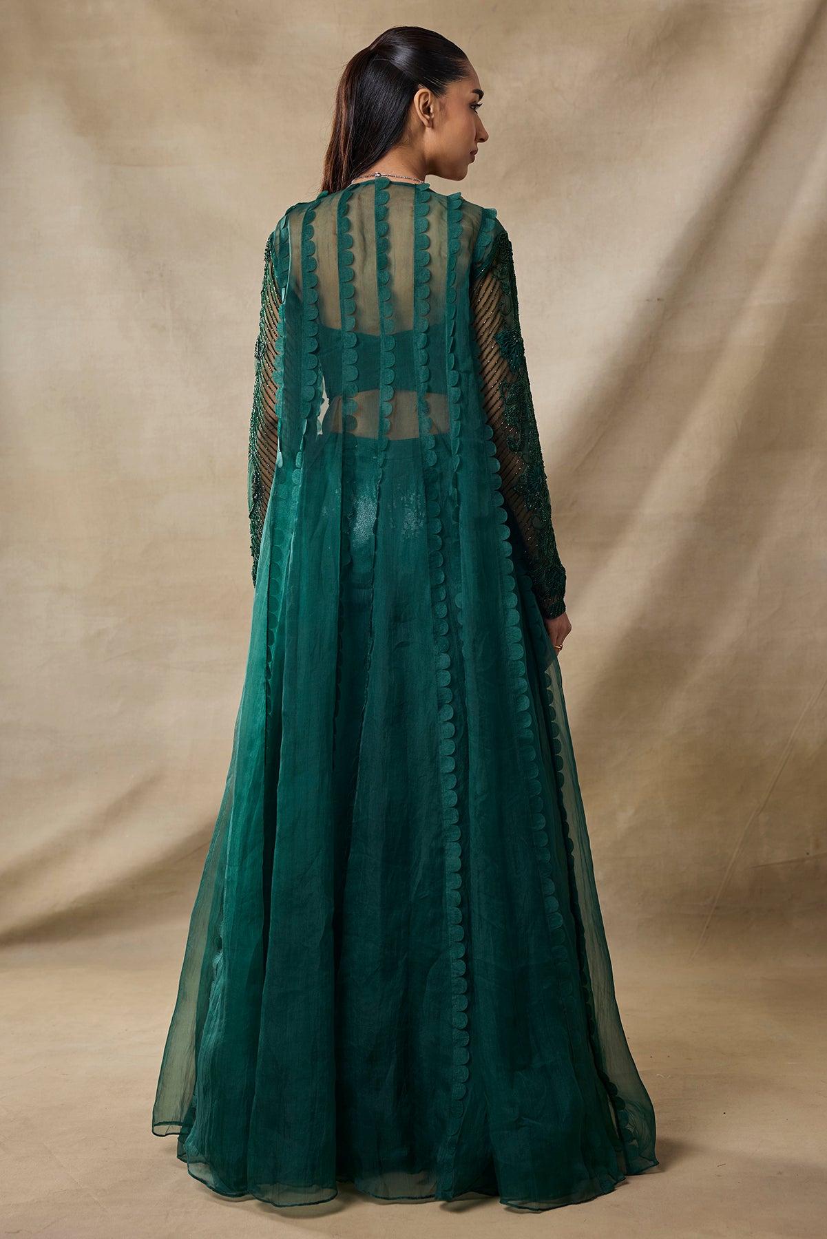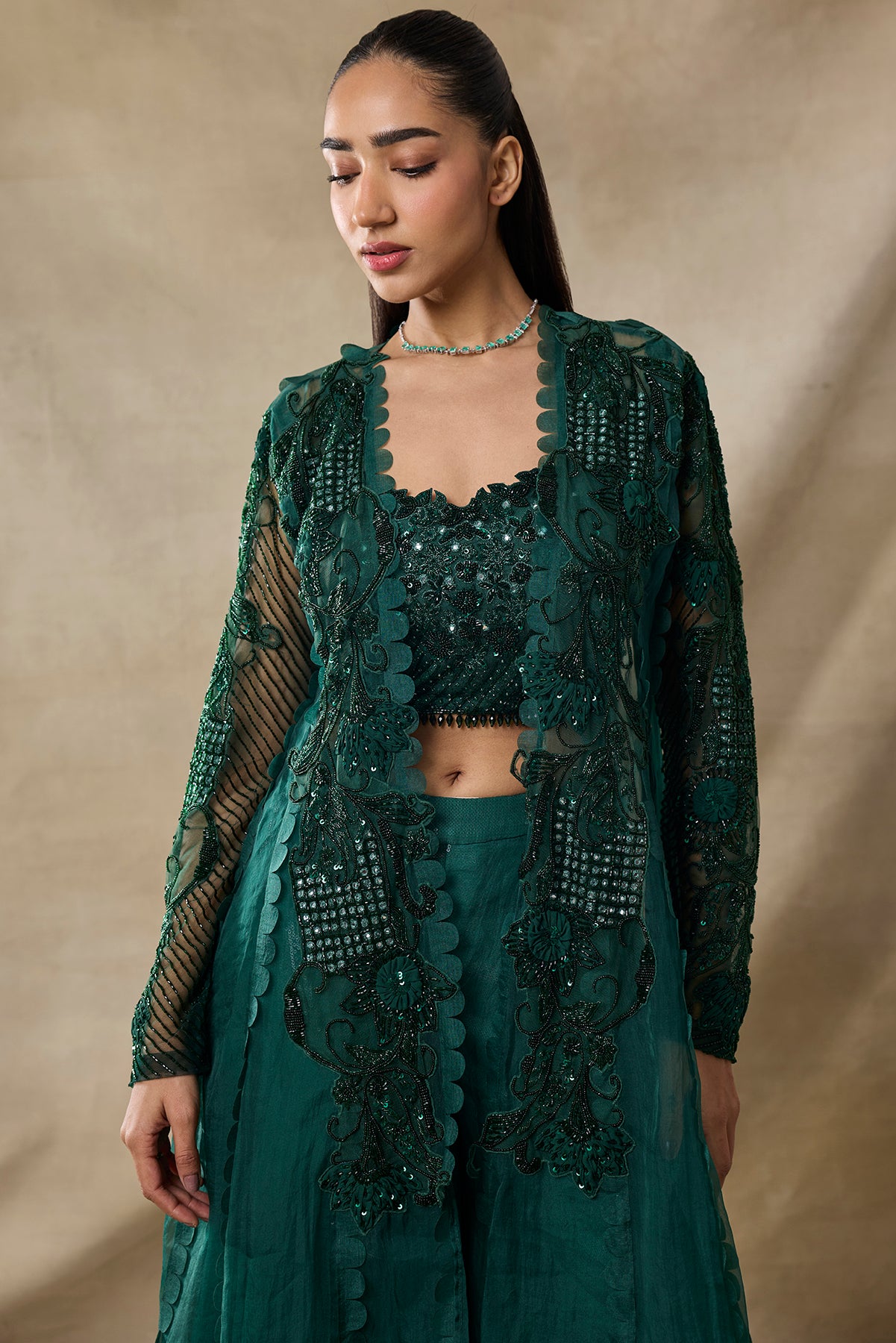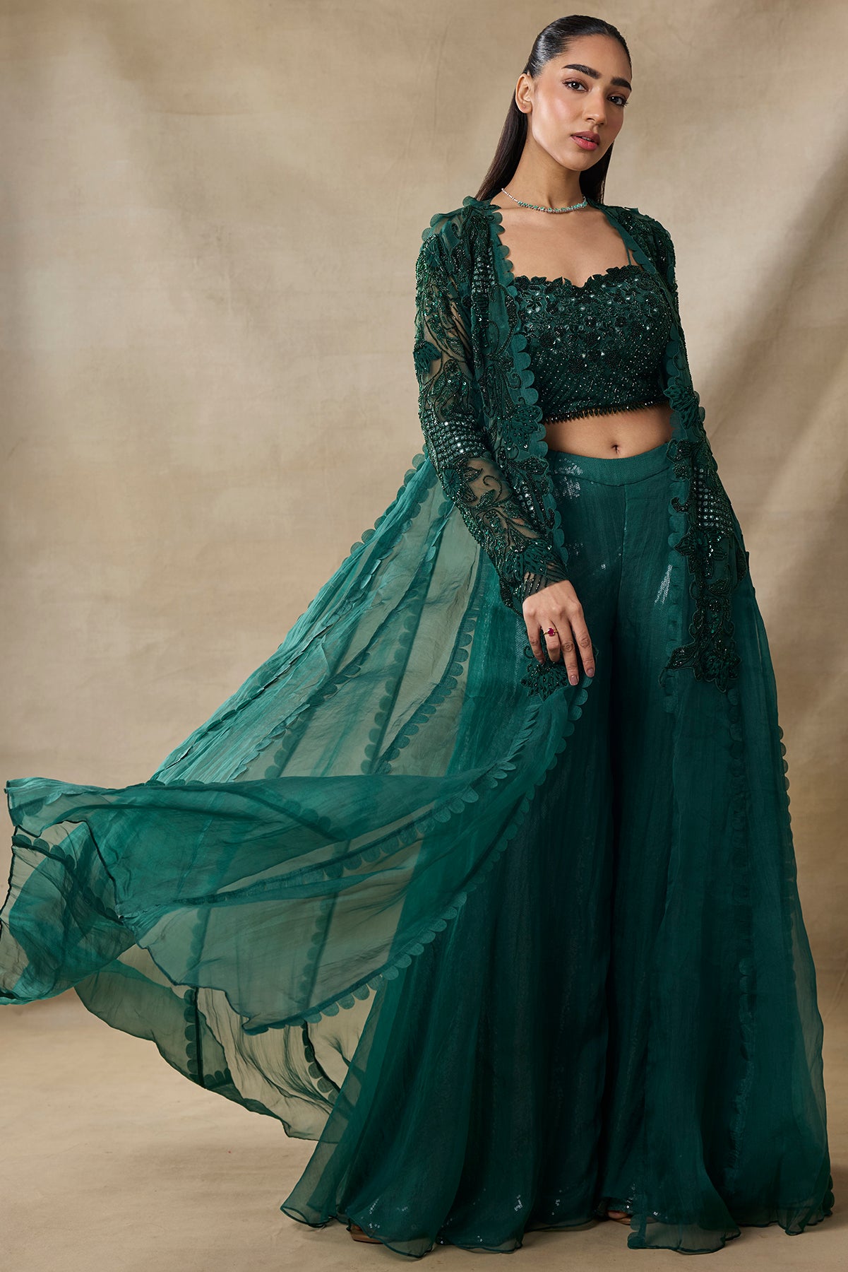 Product Description: bottle green lasor cut cape set with tonal embroidary, paired with embroidered bustier and sharara with embellished belt