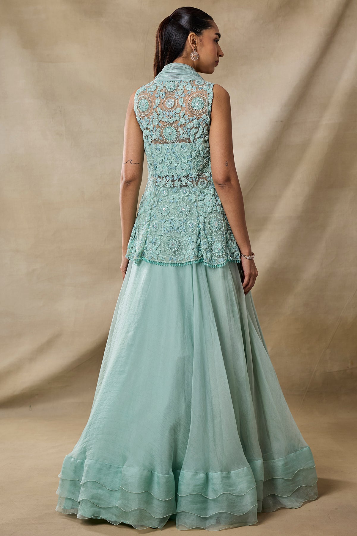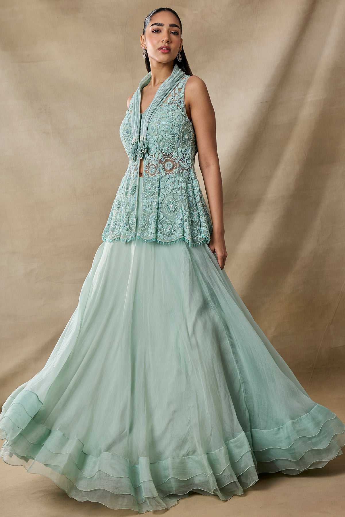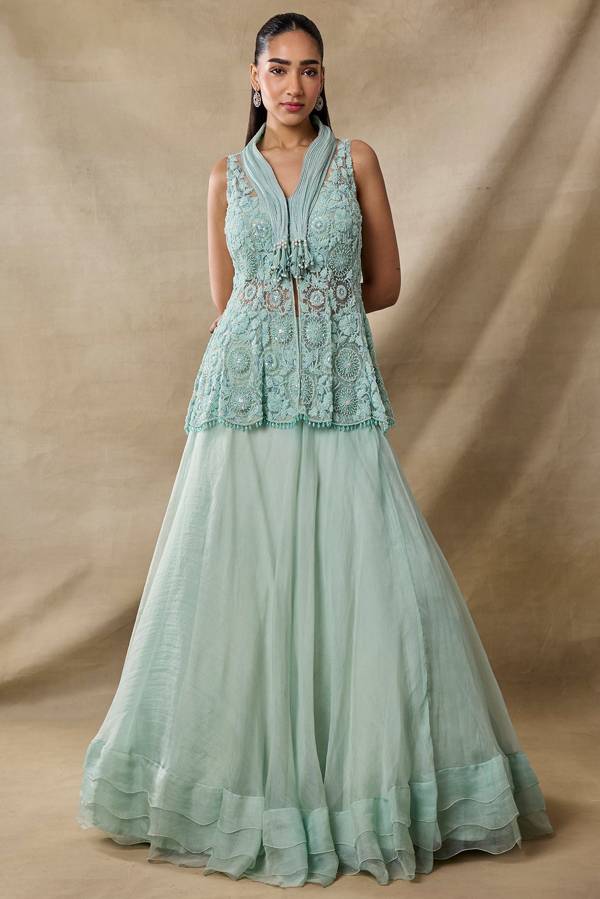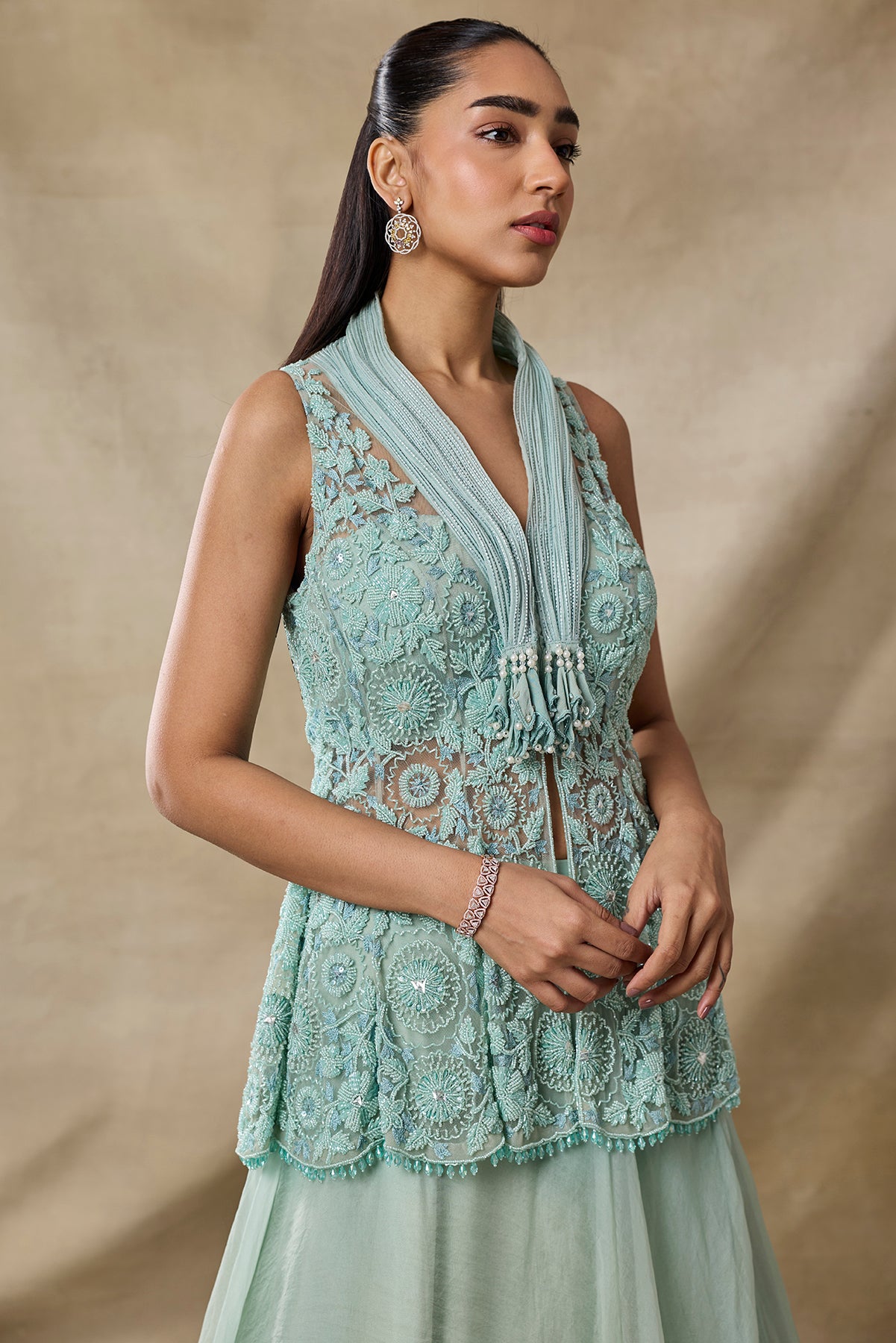 Product Description: featuring sage green color skirt with ruffeles detailing on hem and heavy embroidered jacket style peplum with statement neckline.