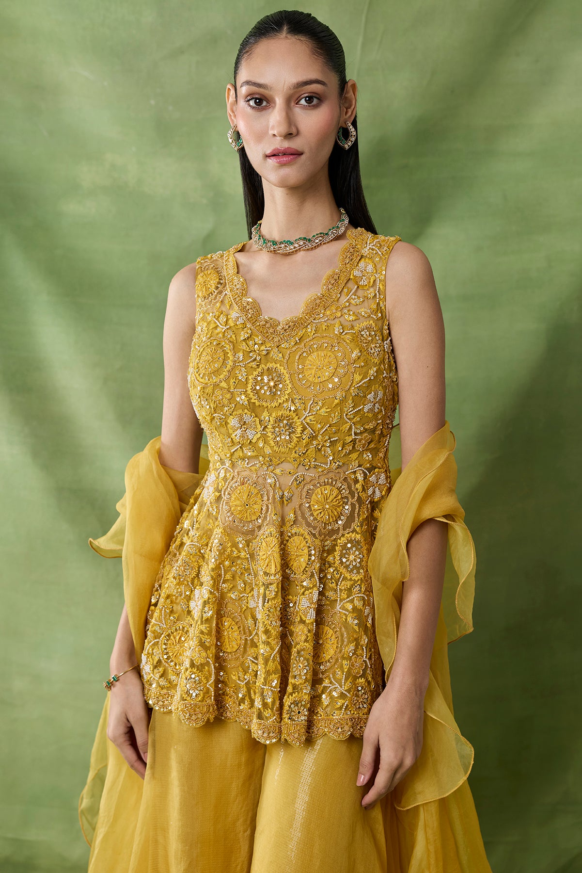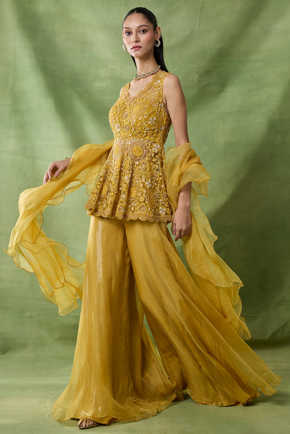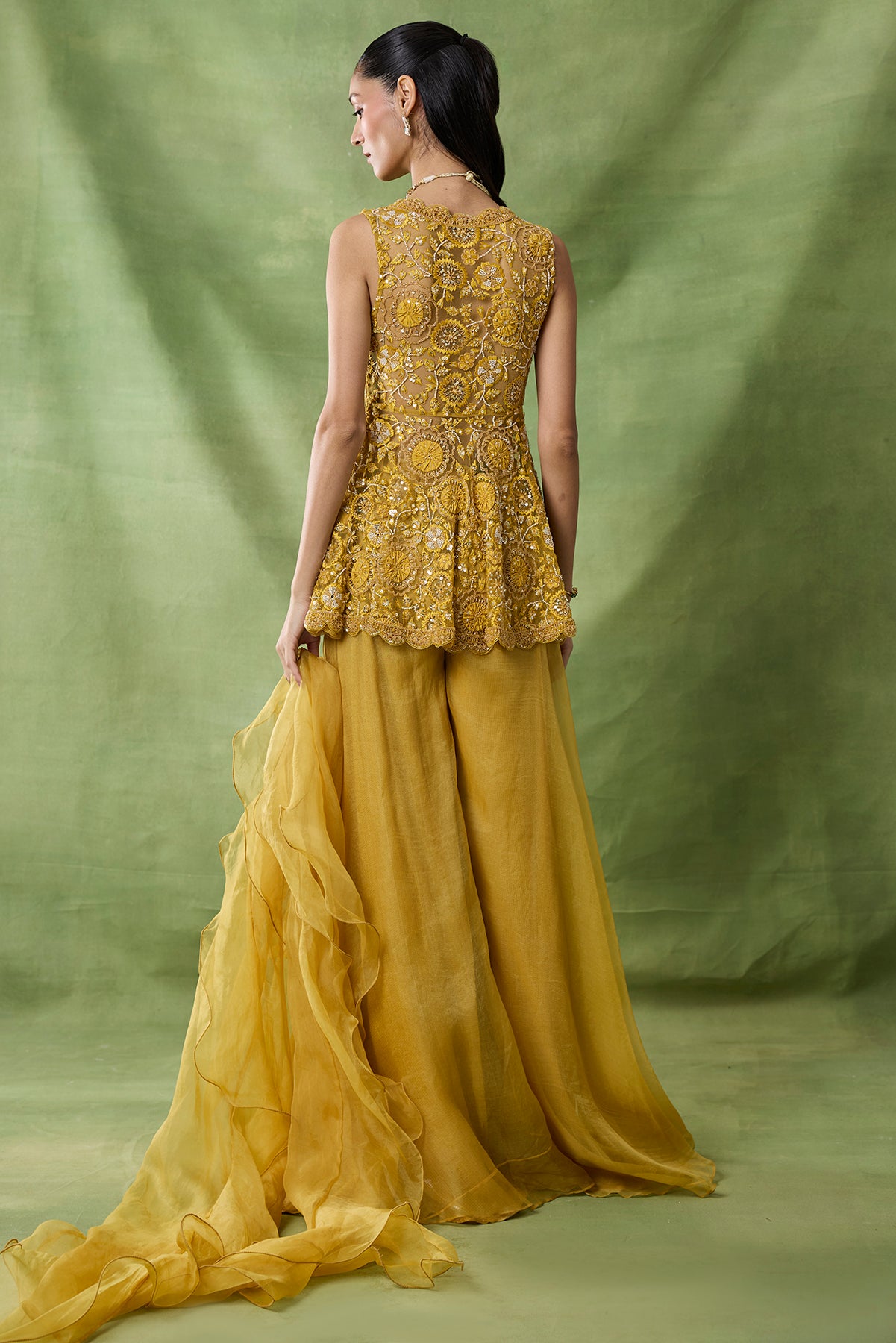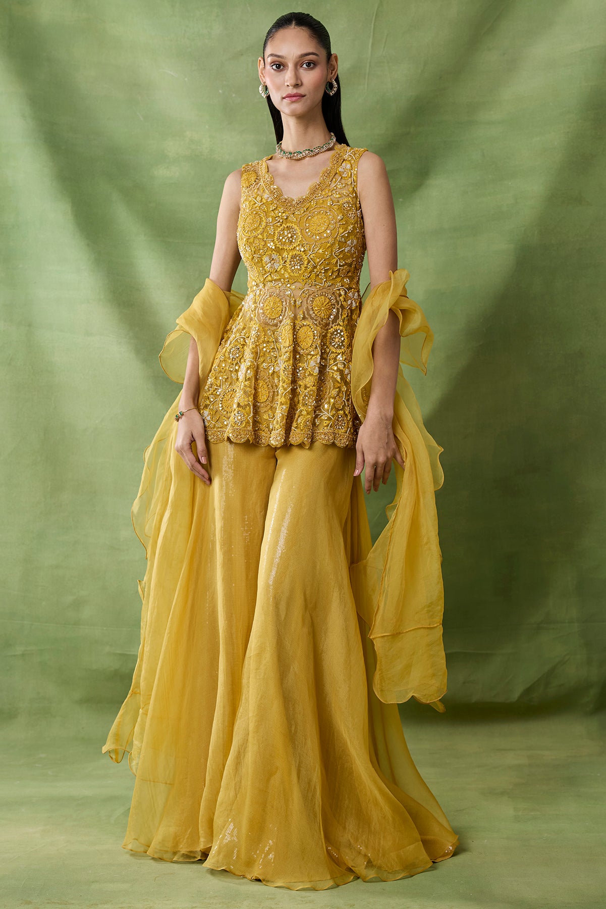 Product Description: featuring a yellow color fully embroidered peplum and sharara pants with organza ruffels duppatta.