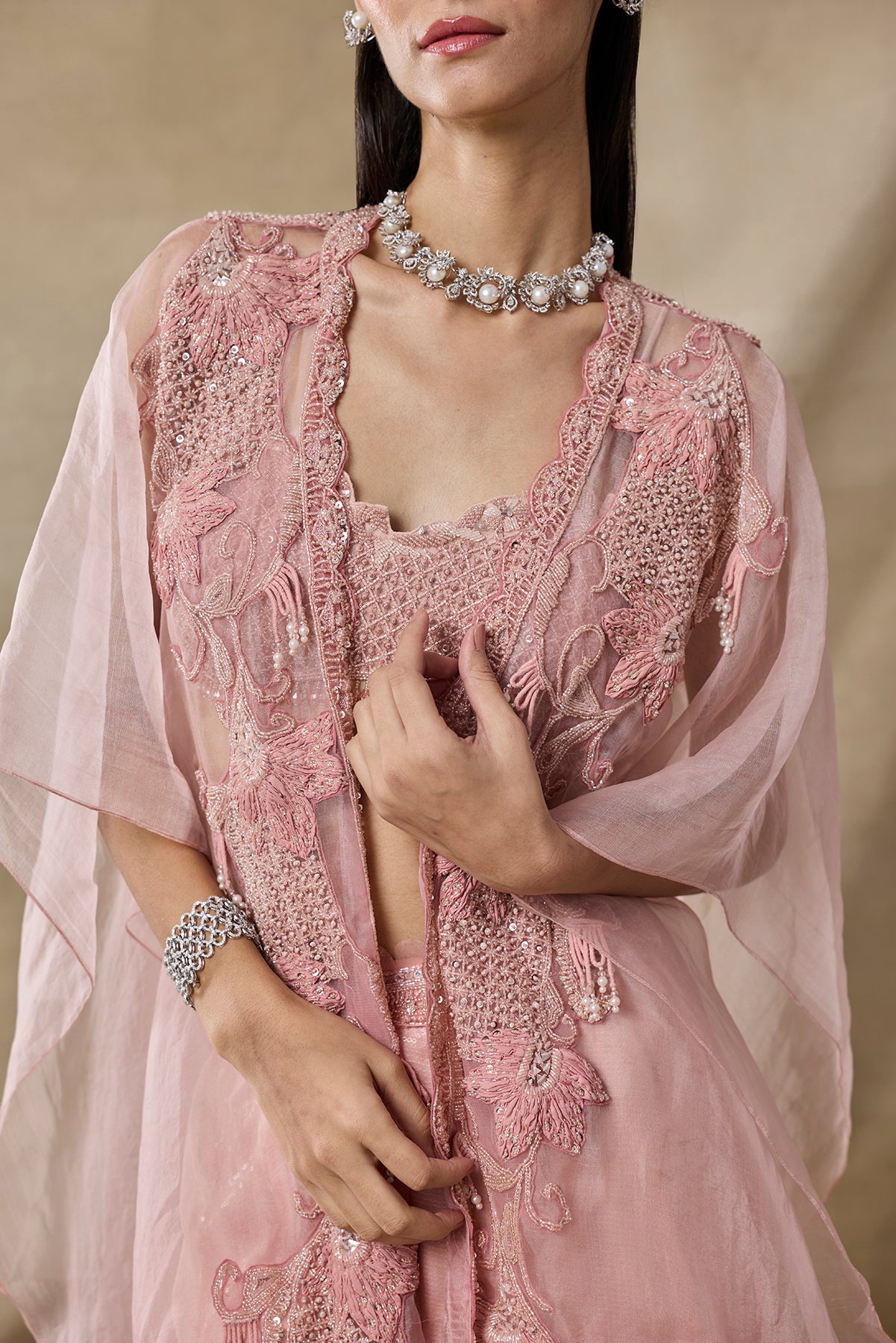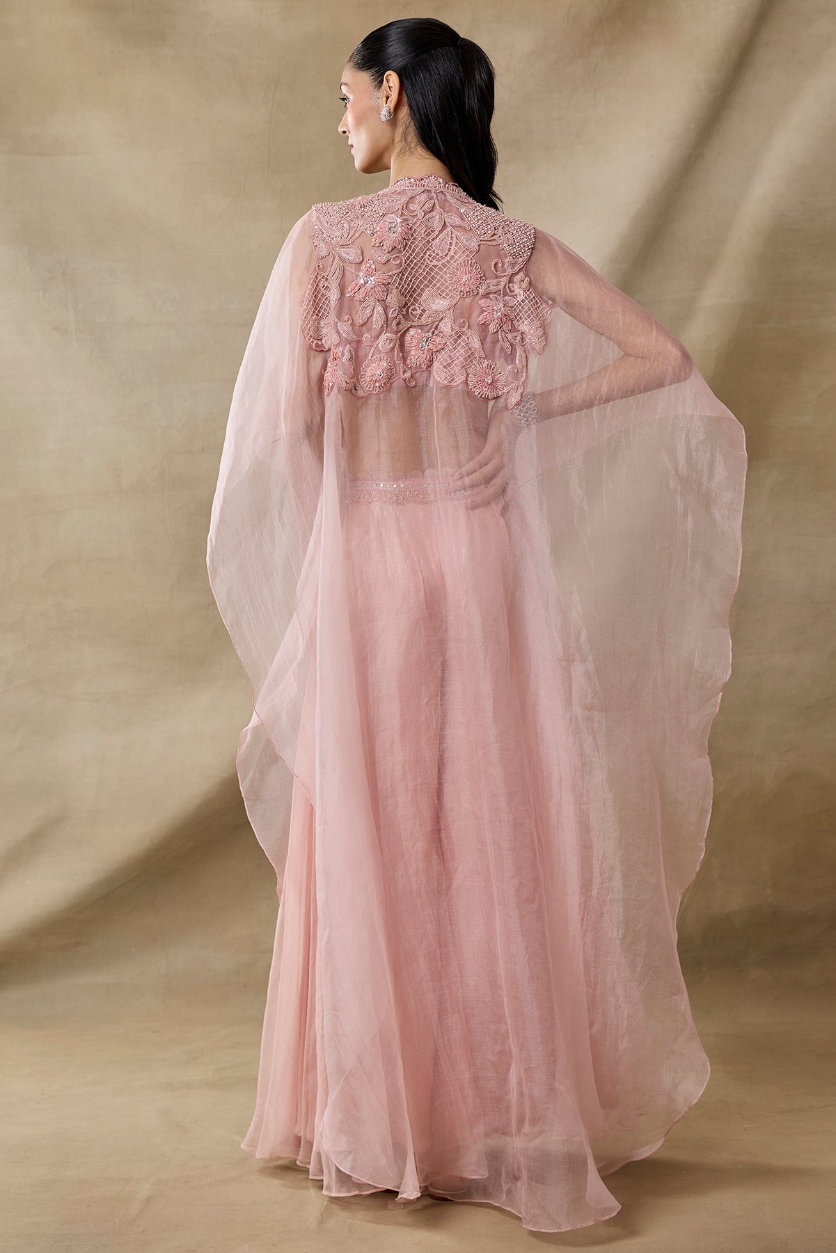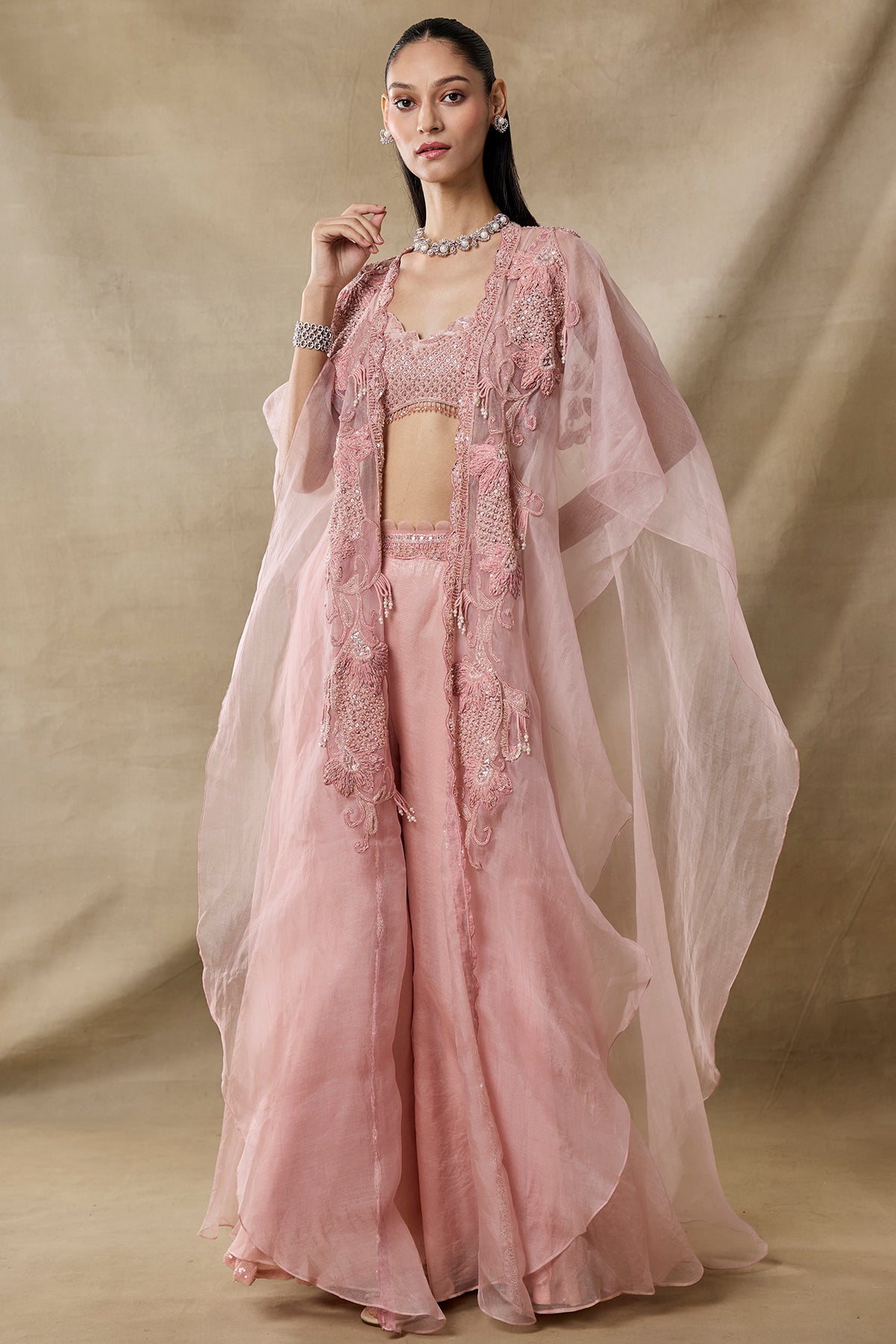 Product Description: pink embroidared cape set with tonal embroidary, paired with embroidered bustier and sharara with embellished belt