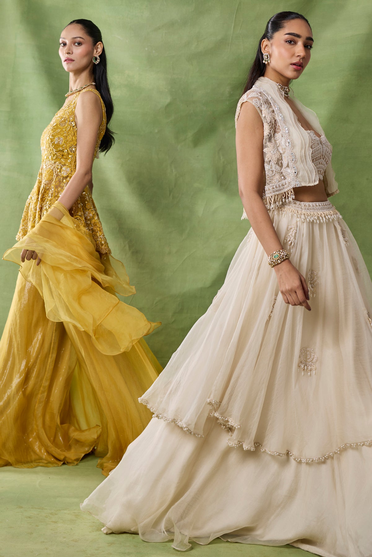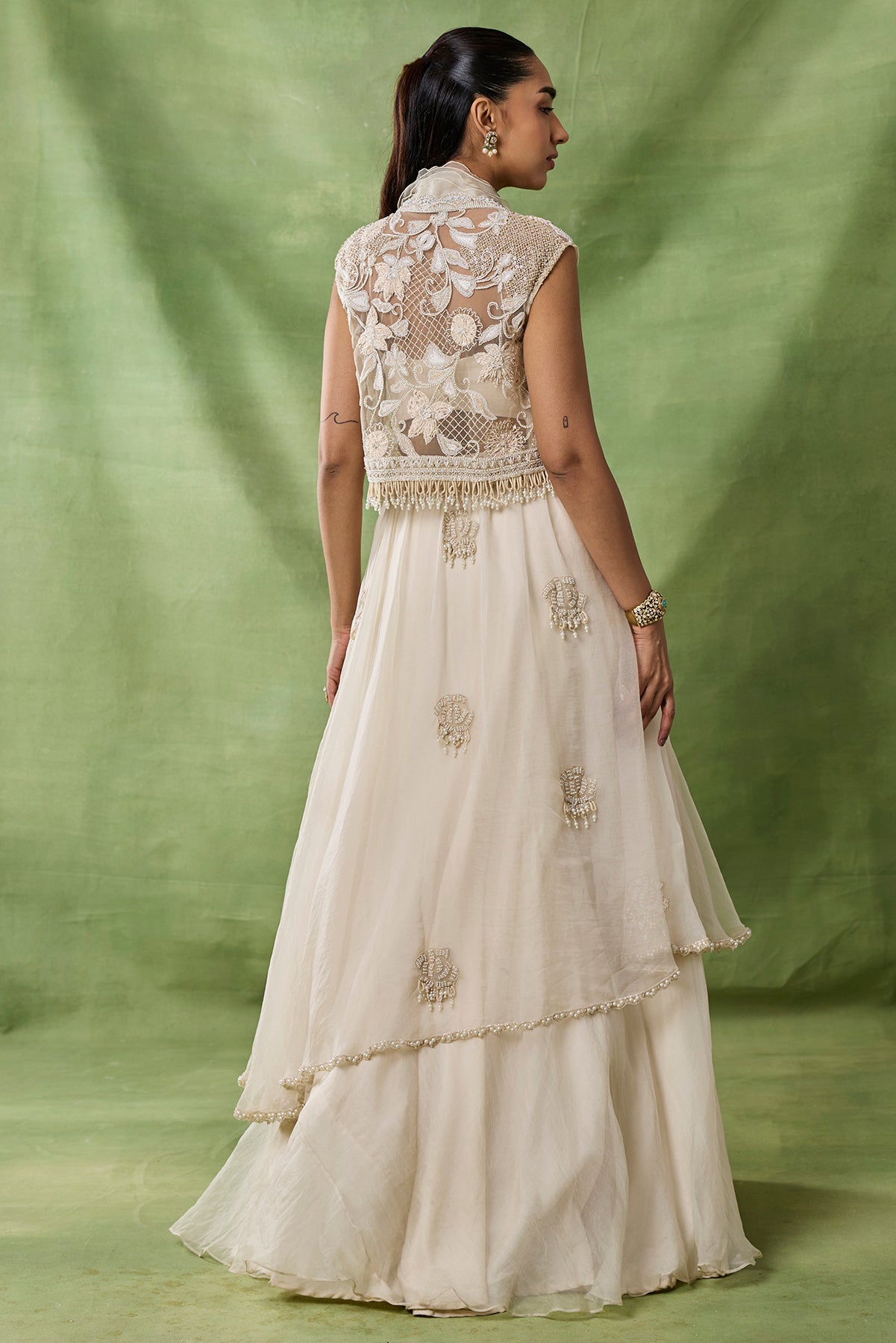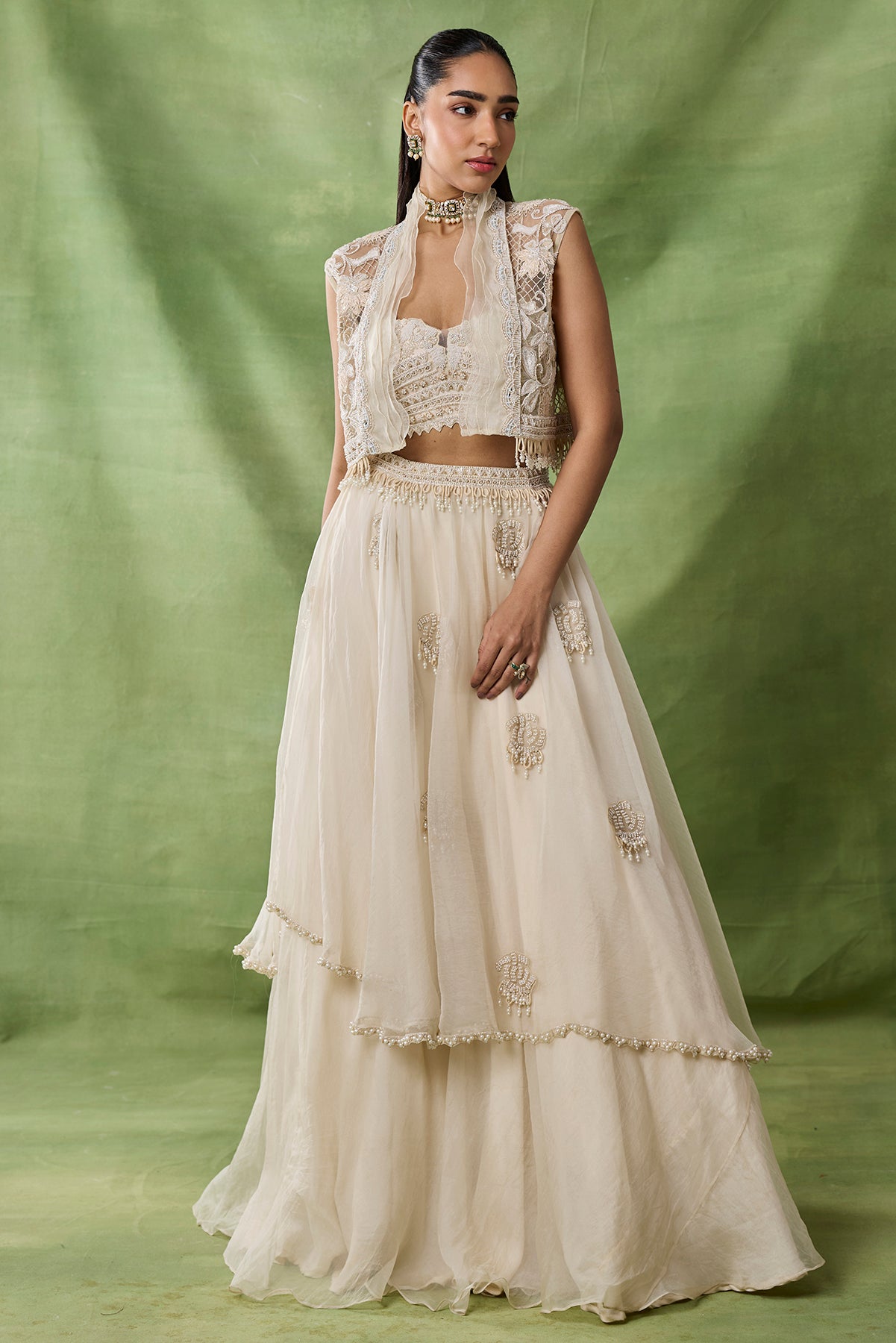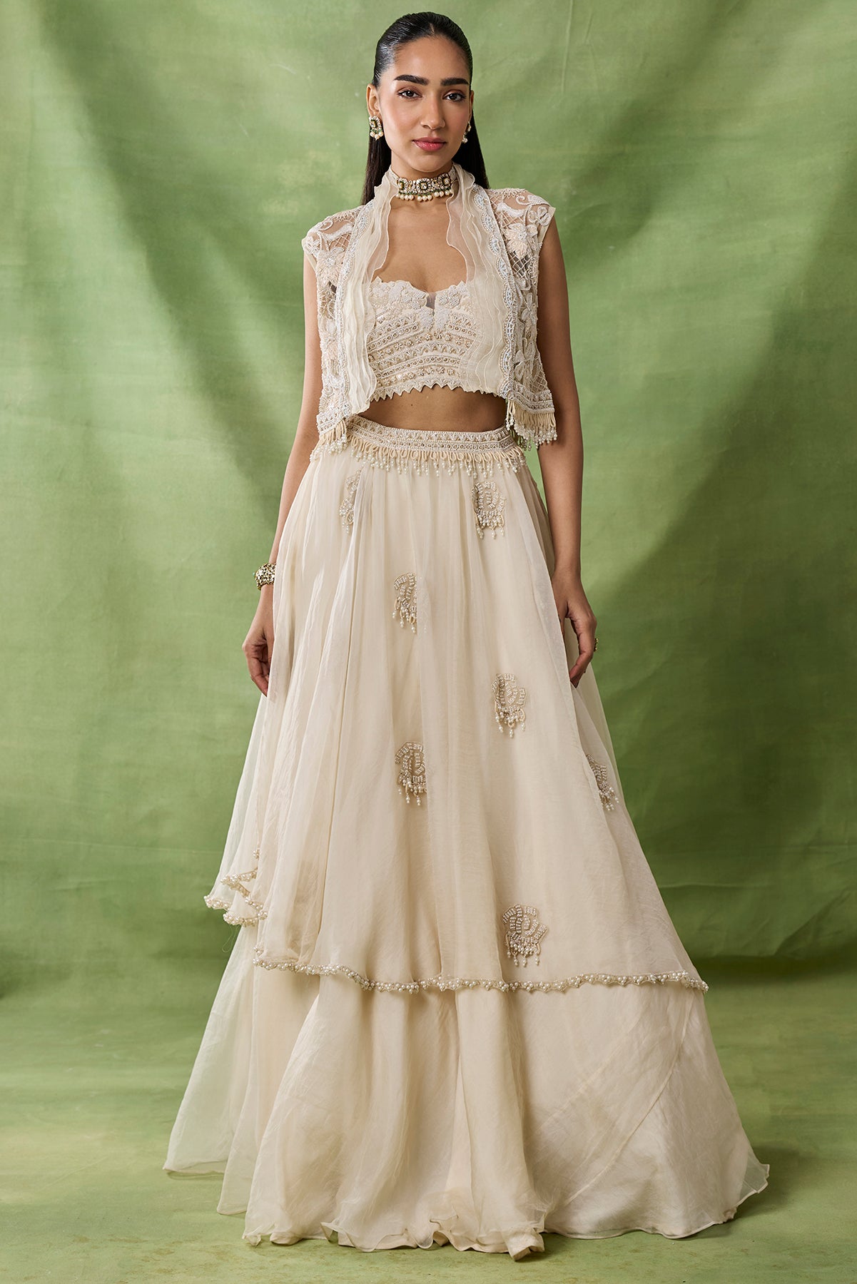 Product Description: featuring a Double layered skirt with embroidered boota allover and embroidered bustier and short jacket with ruffels detailing on it.
