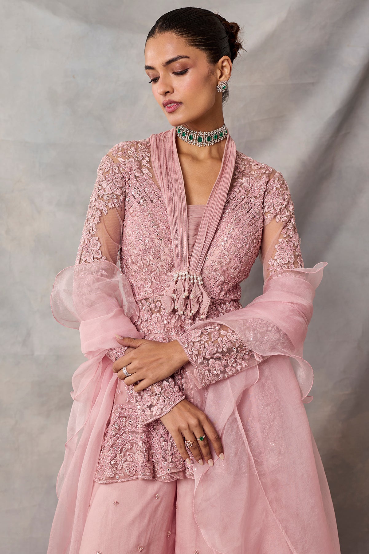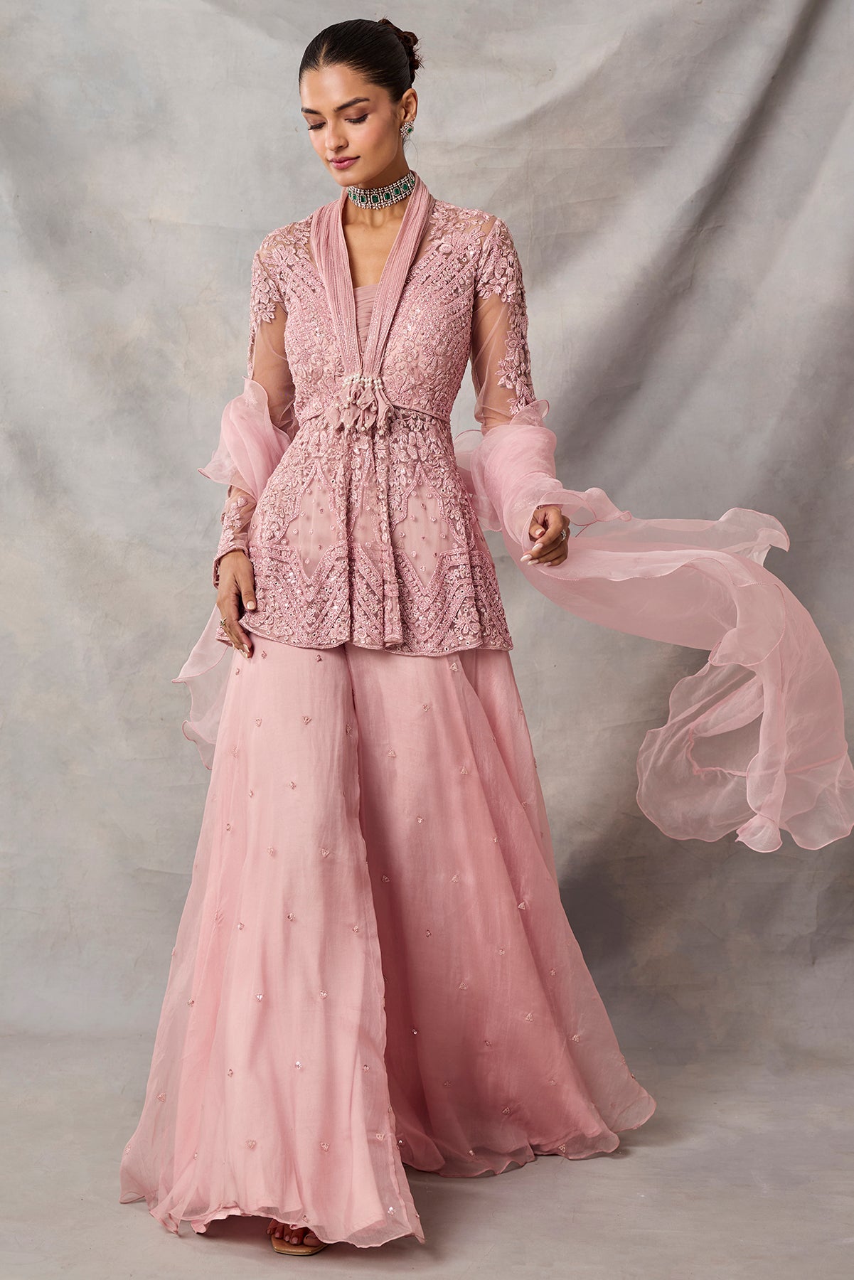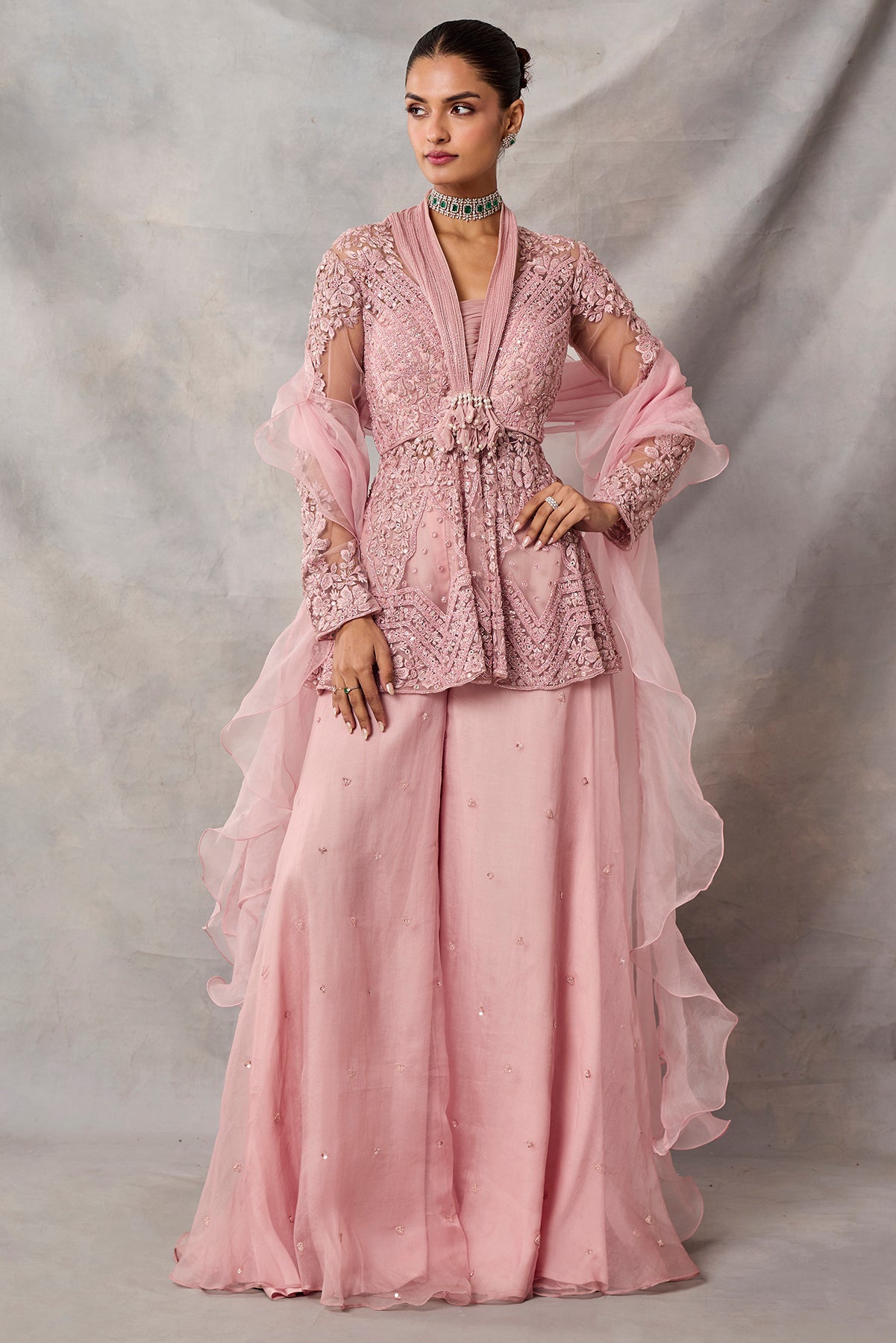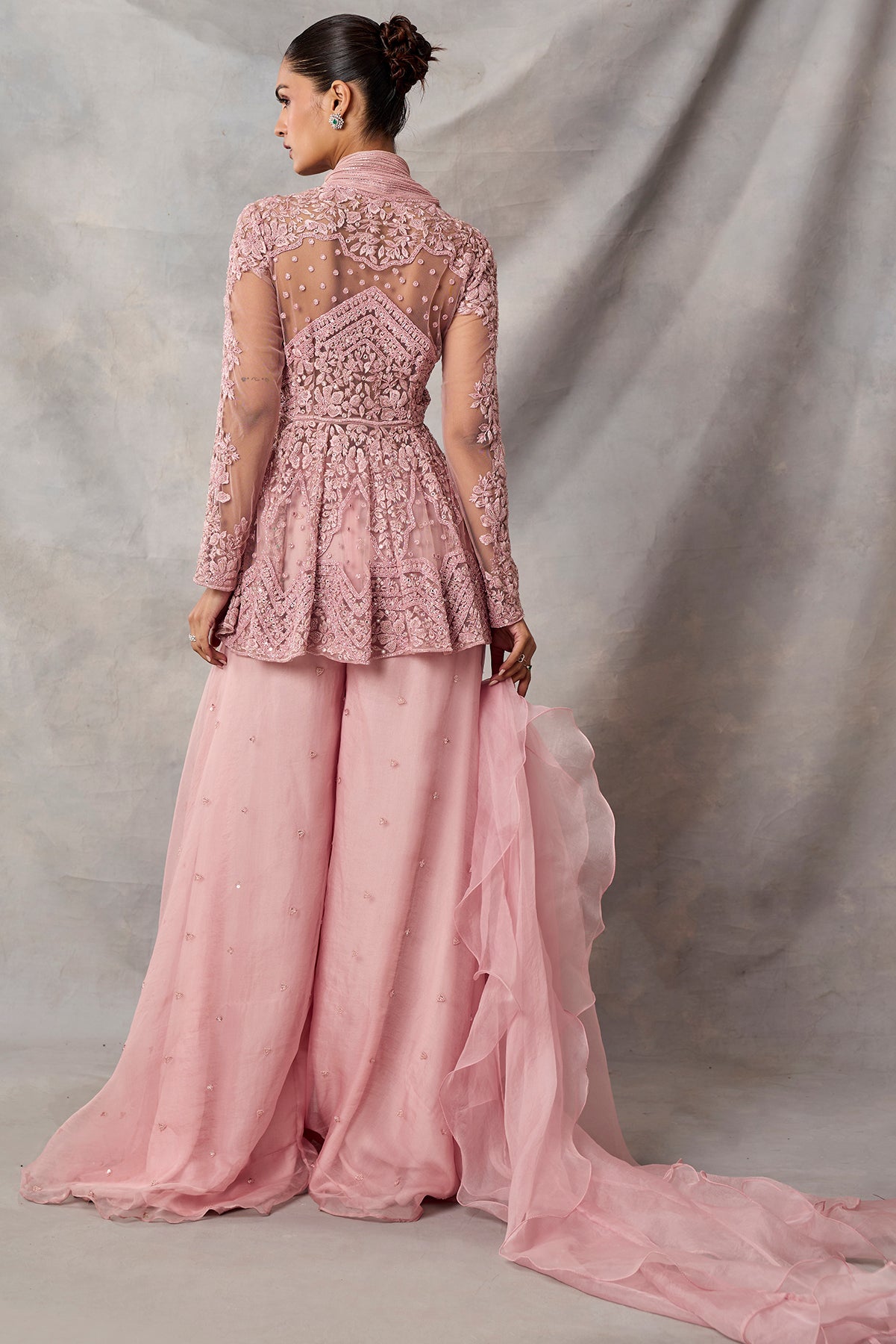 Product Description: featuring pink color embroidered peplum top with enhanced collar and boota embroidered sharara and frill duppata.