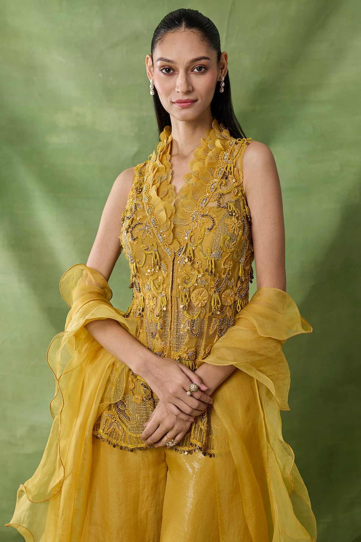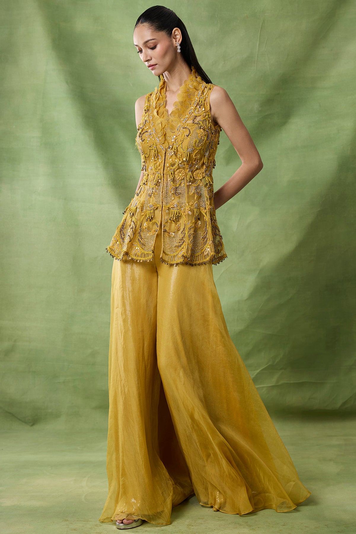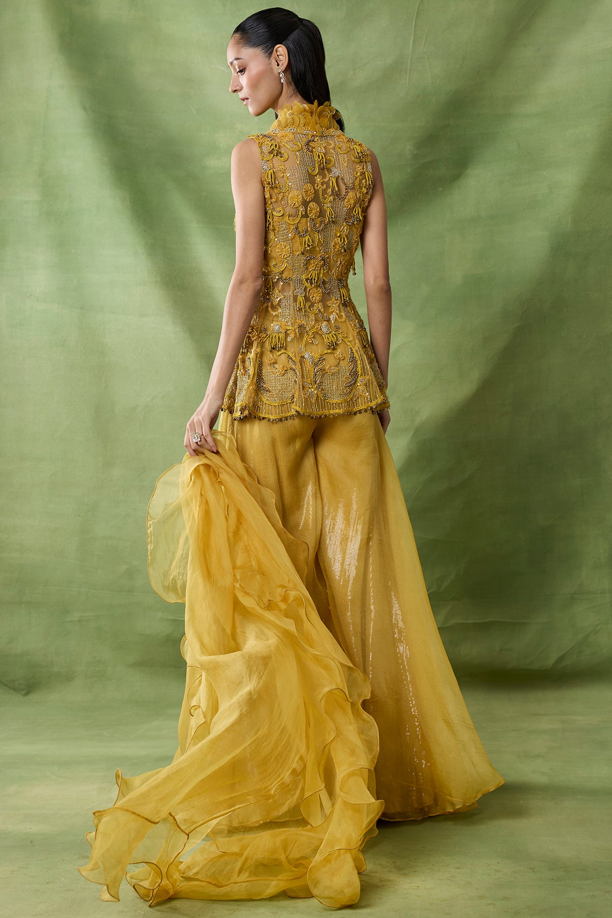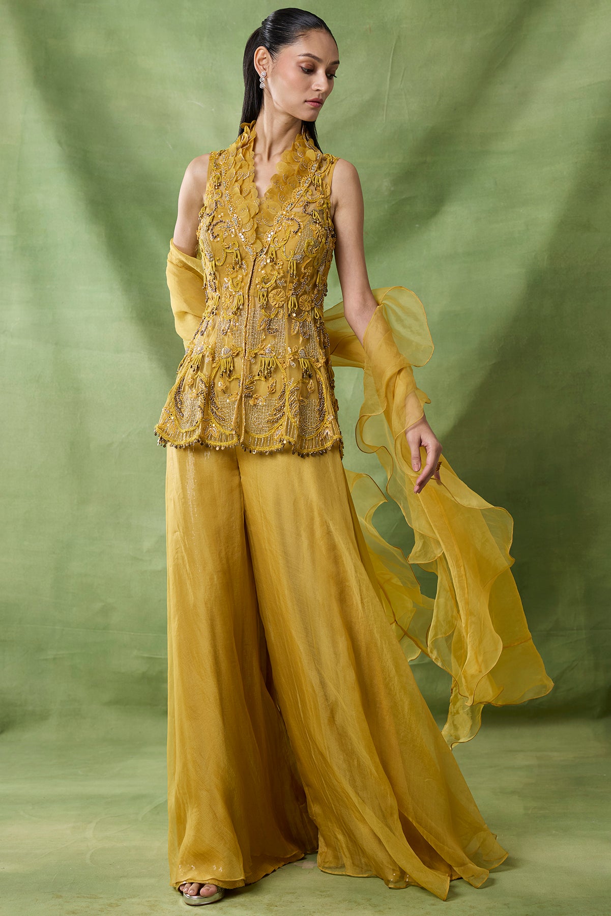 Product Description: featuring a yellow color fully embroidered peplum and sharara pants.Category: AWIGNA SIGNATURE STYLESFabric: organza net Number of Pcs.: 3Designer Code: ASS25Color: YELLOWWash Care: DRY CLEAN ONLY