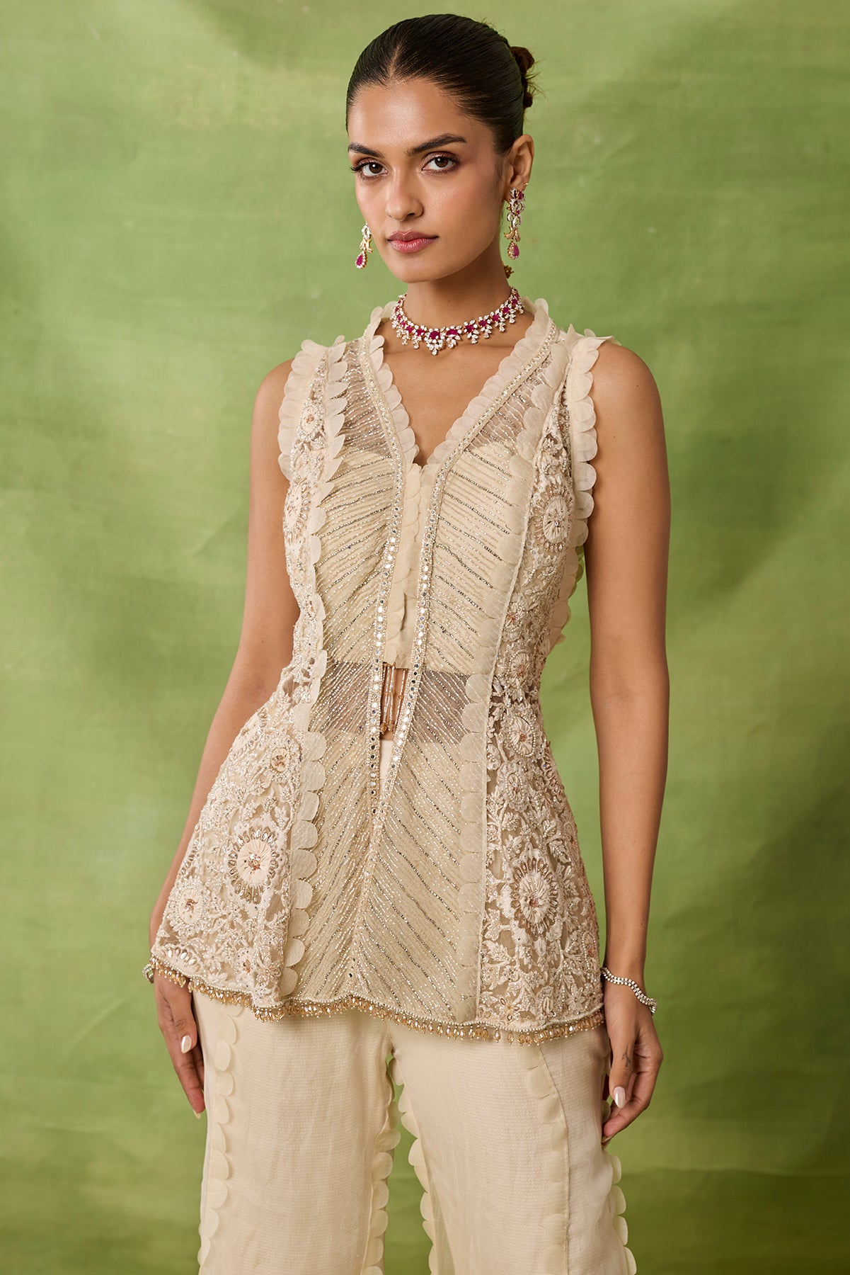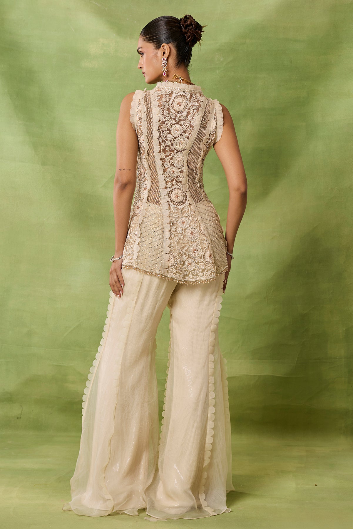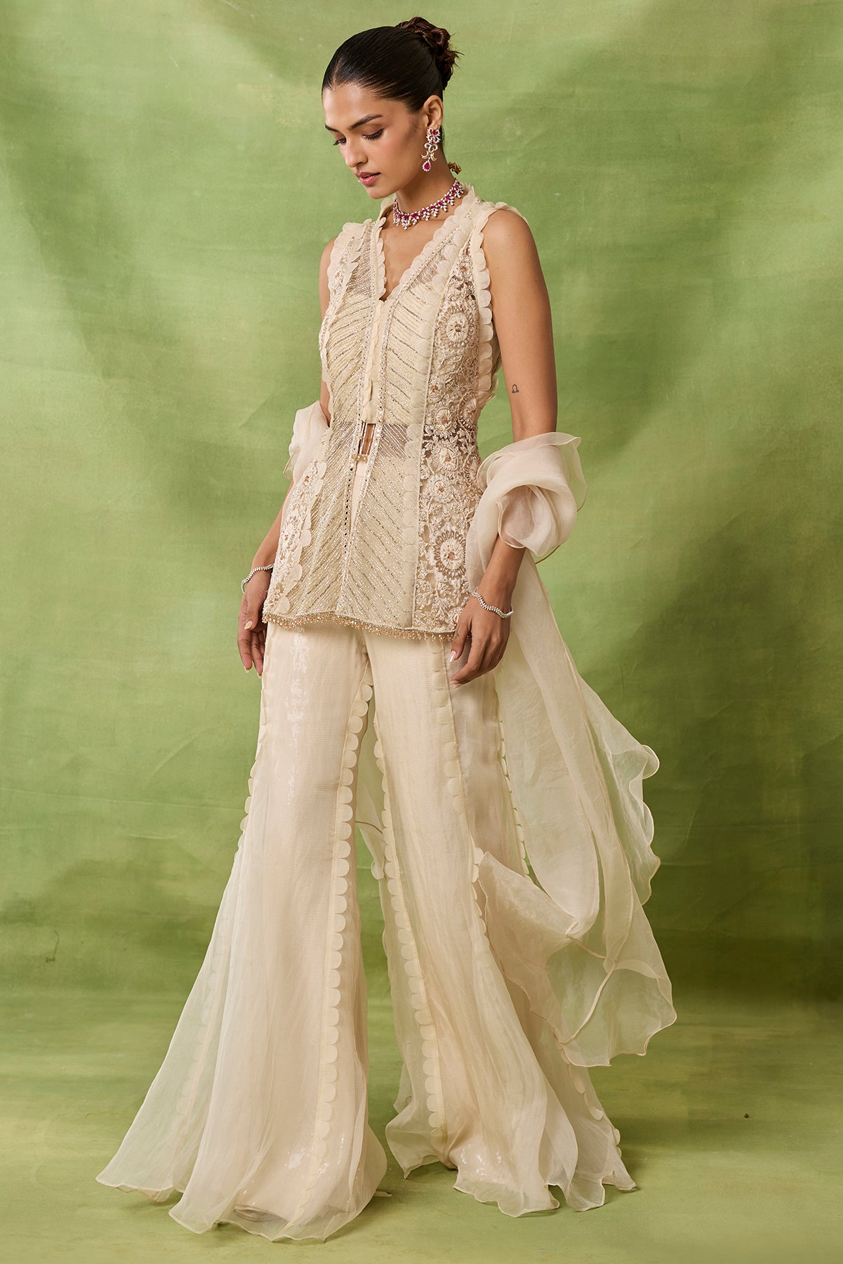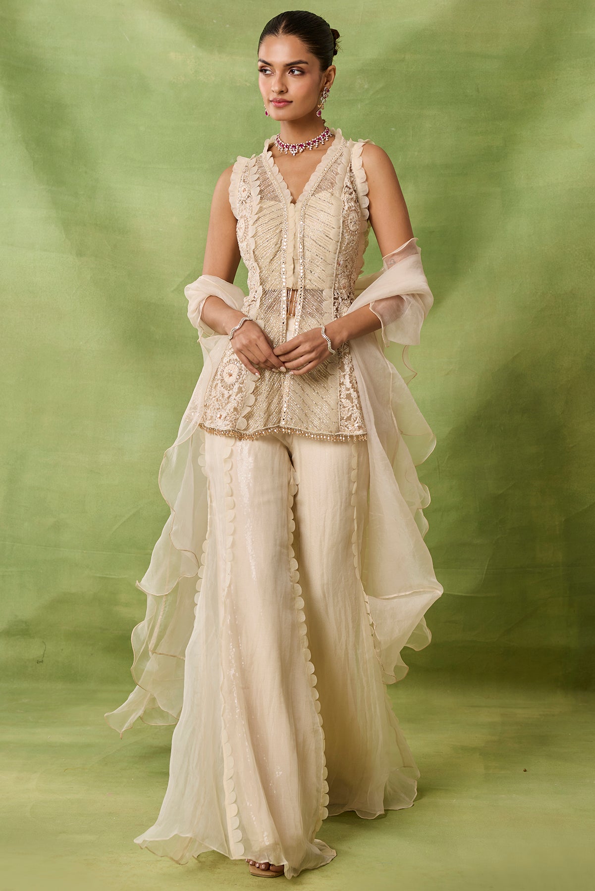 Product Description: featuring ivory embroidered peplum topwith lasor sharara and frills duppata Category: AWIGNA SIGNATURE STYLESFabric: organza,netNumber of Pcs.: 3Designer Code: ASS57Color: IVORYWash Care: DRY CLEAN ONLY