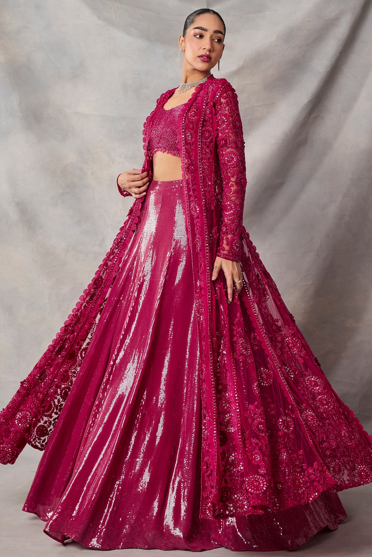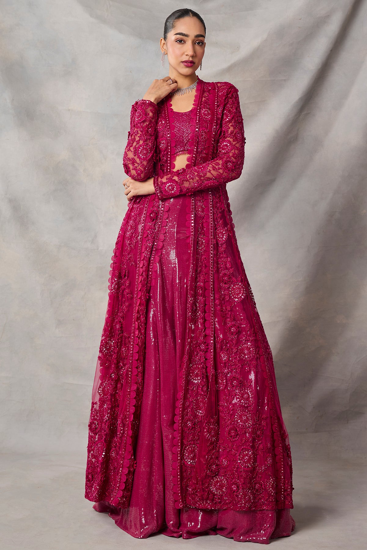 Product Description: featuring red color fully embroidered long jacket and skirt and bustier Category: AWIGNA SIGNATURE STYLESFabric: organza,netNumber of Pcs.: 3Designer Code: ASS76Color: REDWash Care: DRY CLEAN ONLY