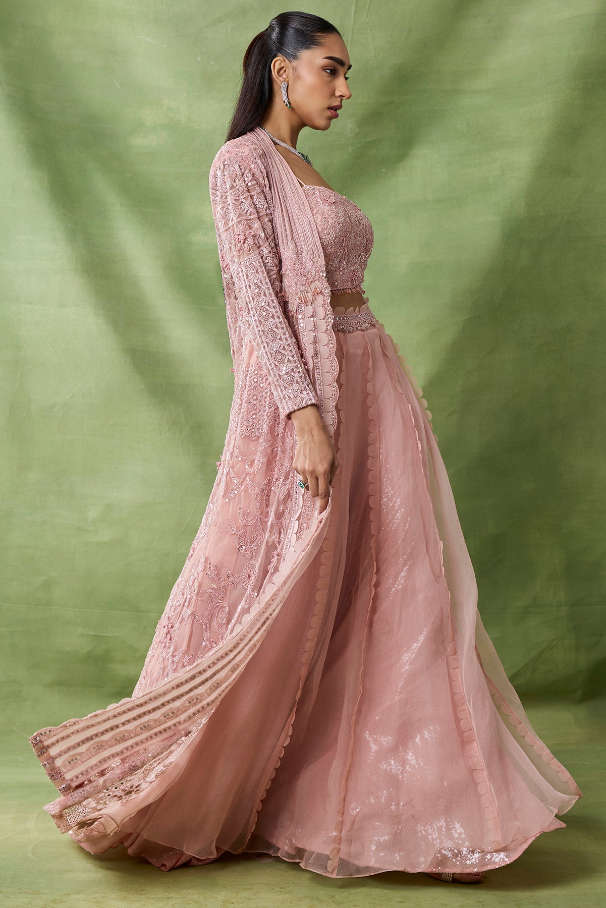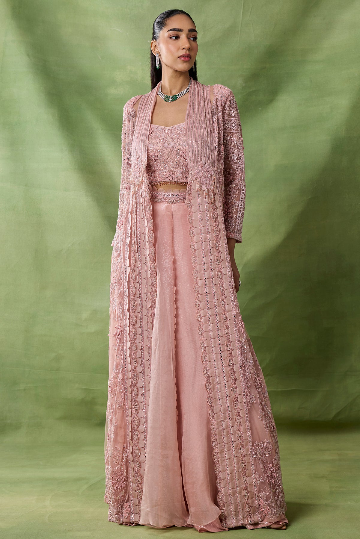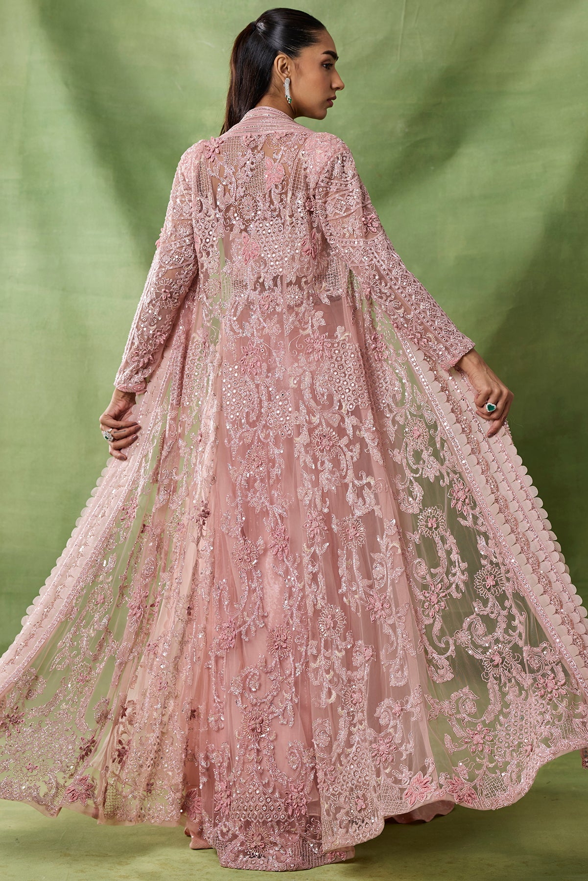 Product Description: featuring a salmon pink fully embroidered bustier. long cape with floral embroidary and lasor cut flared sharara.