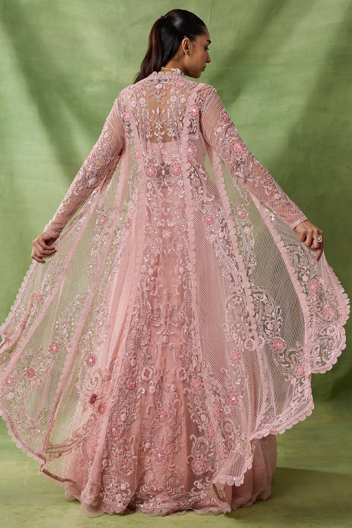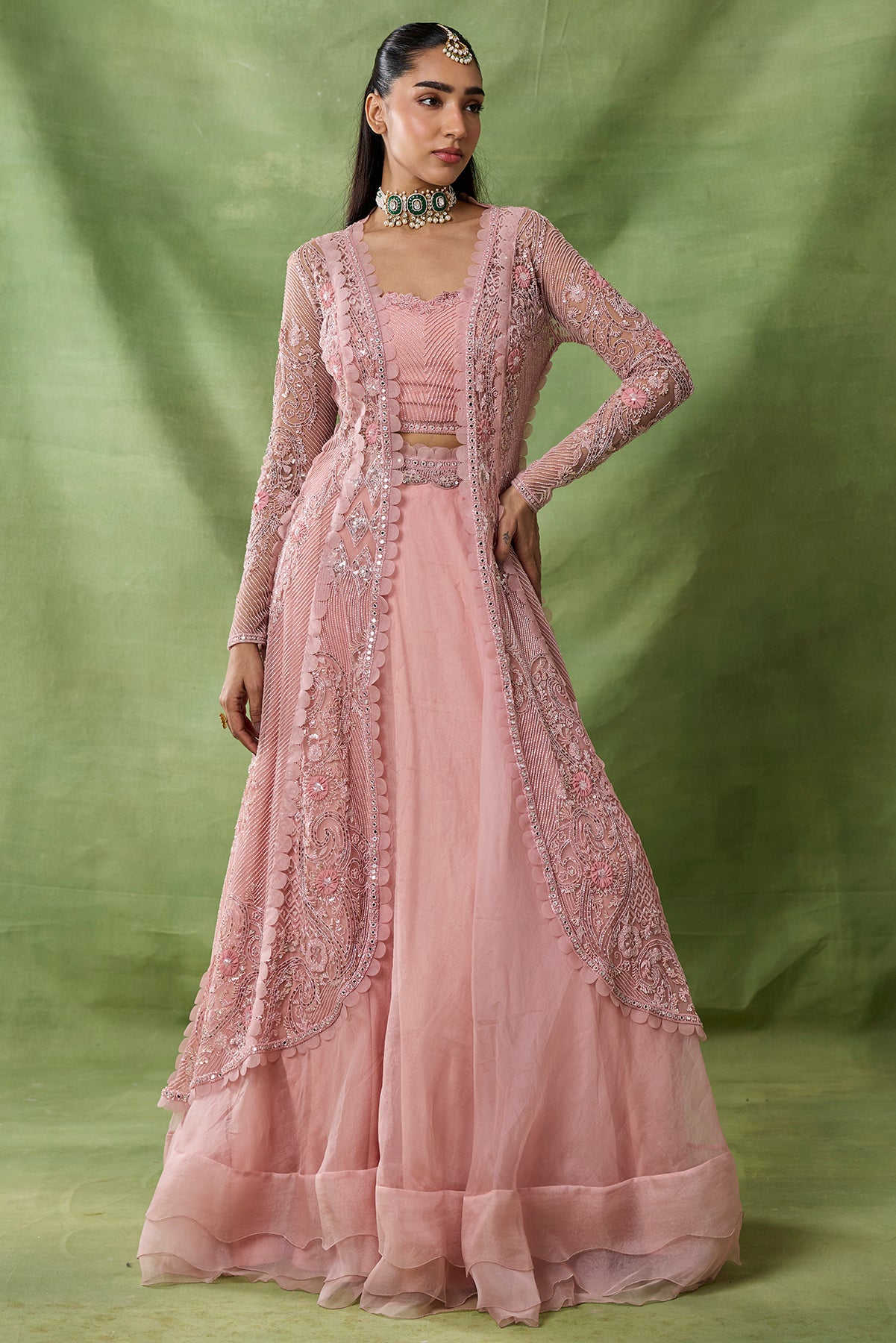 Product Description: heavy embroidered long jacket , paired with embroidered bustier and skirt with embellished belt