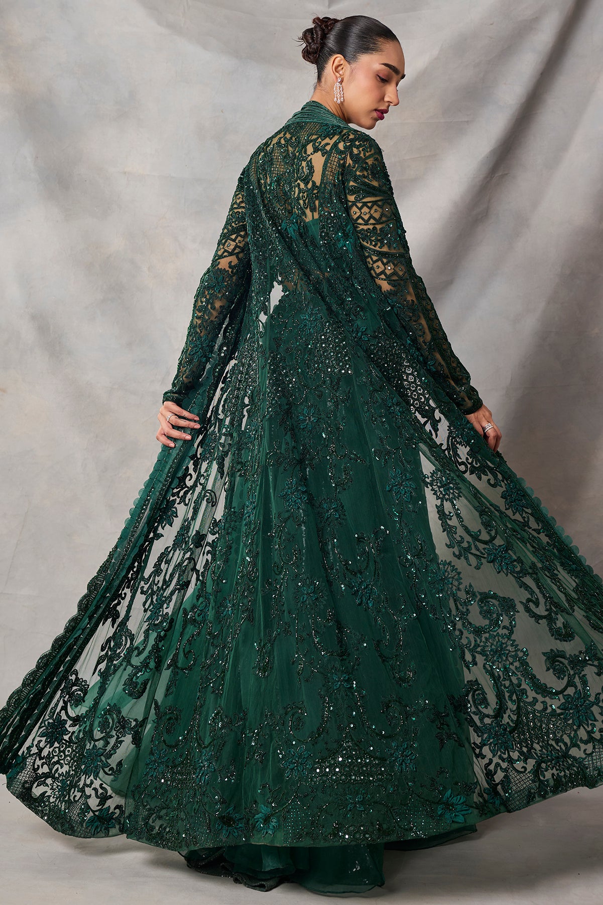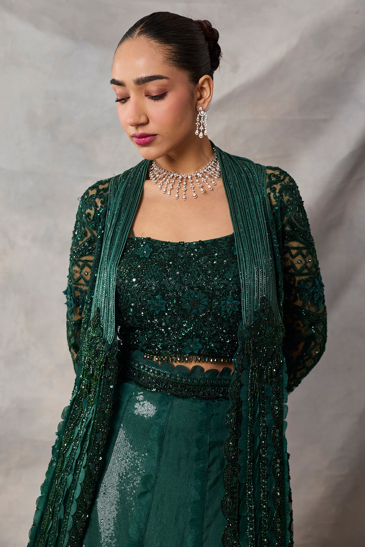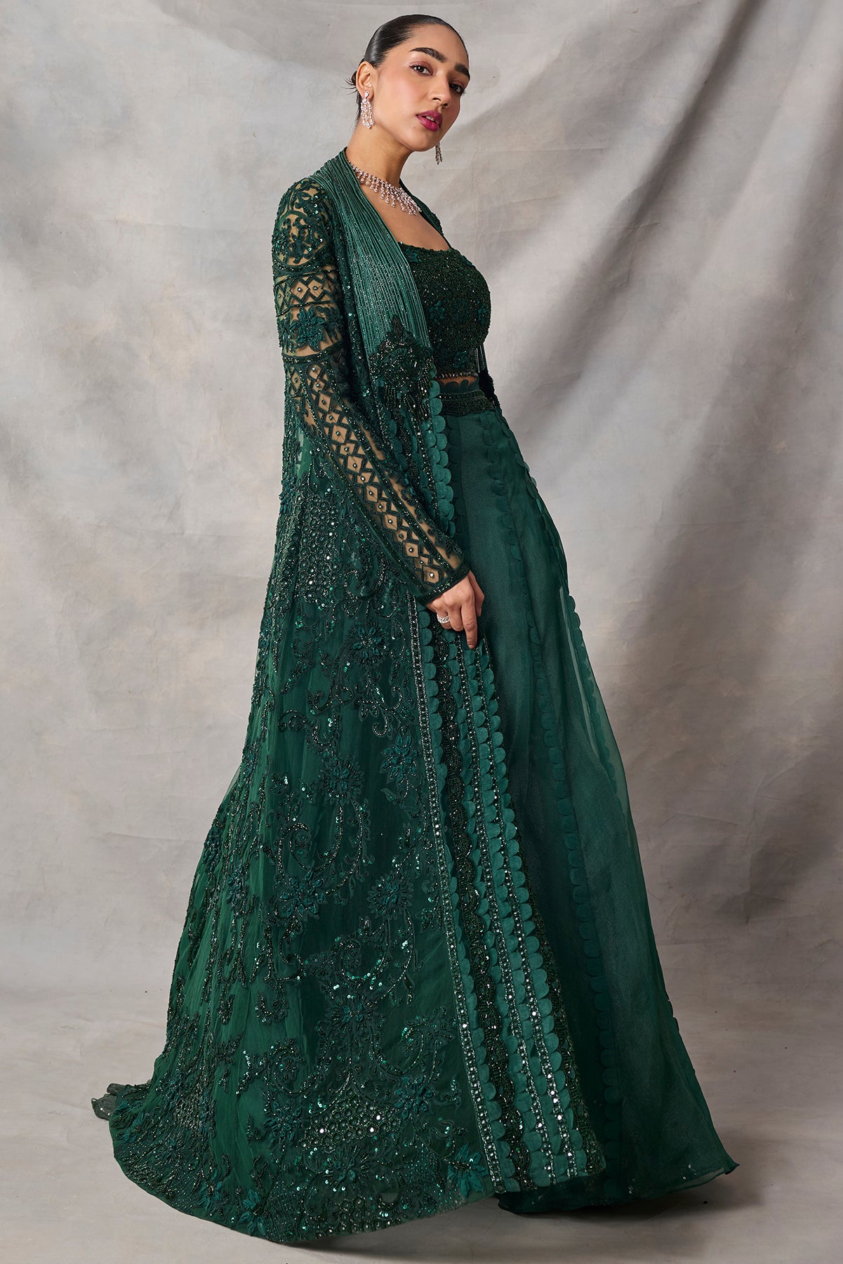 Product Description: featuring bottle green fully embroidered long jacket and skirt and bustierCategory: AWIGNA SIGNATURE STYLESFabric: organza,netNumber of Pcs.: 3Designer Code: ASS75Color: BOTTLE GREENWash Care: DRY CLEAN ONLY